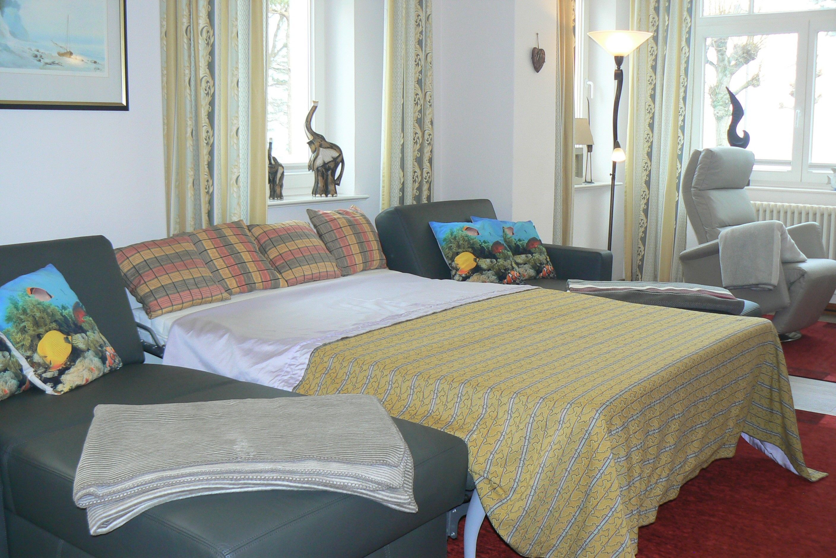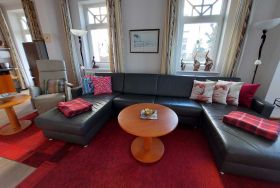 Das komfortable und stilvolle App. 552, im Hochparterre gelegen, verfügt über ein großes Wohn-/Esszimmer mit einer bequemen Ledercouch, auf der eine Aufbettungsmöglichkeit für eine 5./6. Person besteht (Liegefläche 1,40 m x 2,00 m), 55-Zoll Smart TV, Radio mit CD, USB und Bluetooth und -DVD-Blu-ray-Player. WLAN ist inklusive. Der Essplatz ist direkt an den großen Fenstern platziert, damit Sie morgens traumhafte Sonnenaufgänge und abends spektakuläre Sonnenuntergänge erleben können.