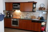 Die Küche ist in den Wohnbereich integriert und verfügt über viele Geräte, z. B. Mikrowelle, Backofen, Cerankochfeld und Geschirrspüler. Außerdem gibt es diesen möblierten Balkon mit traumhaftem seitlichem Meerblick!