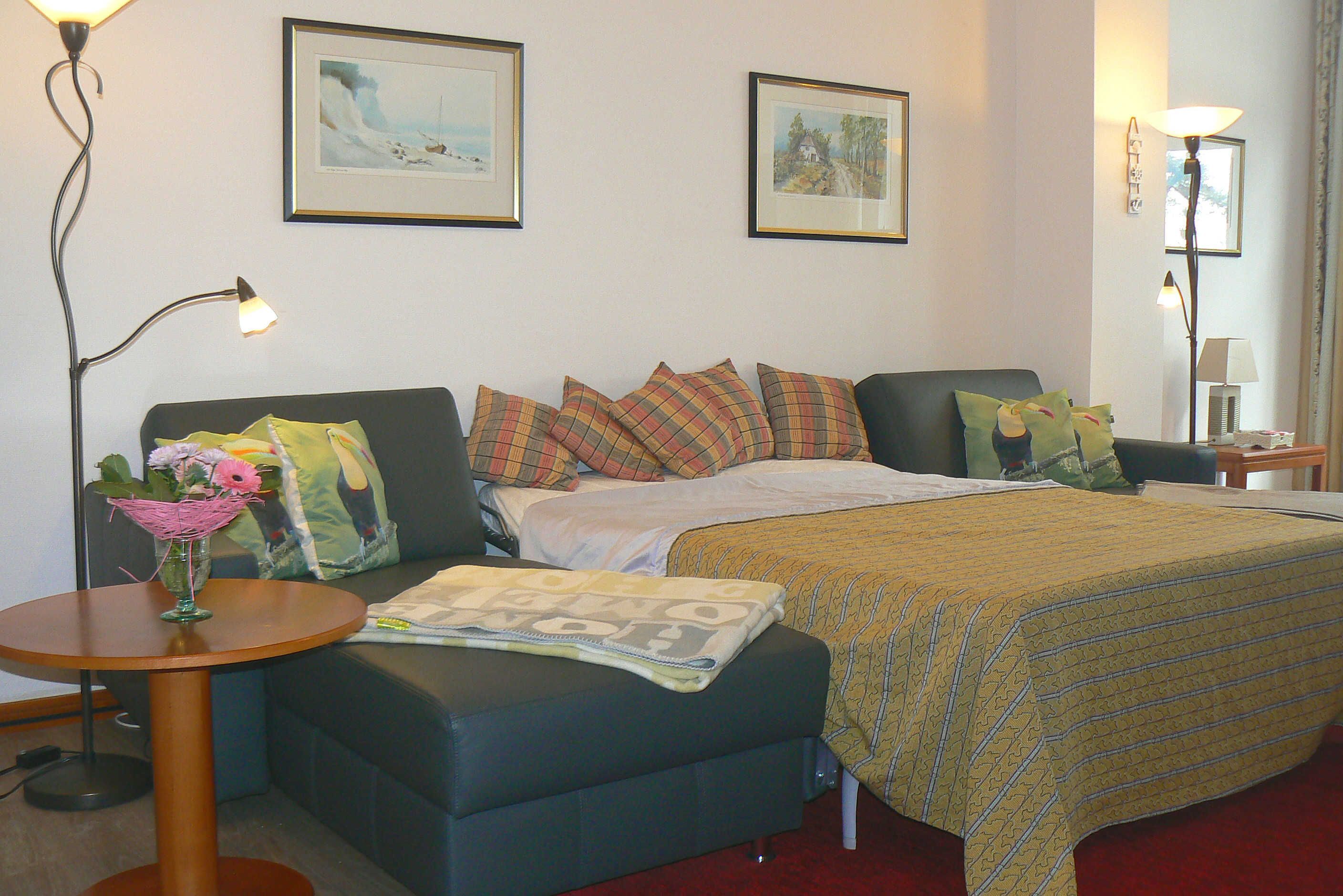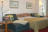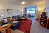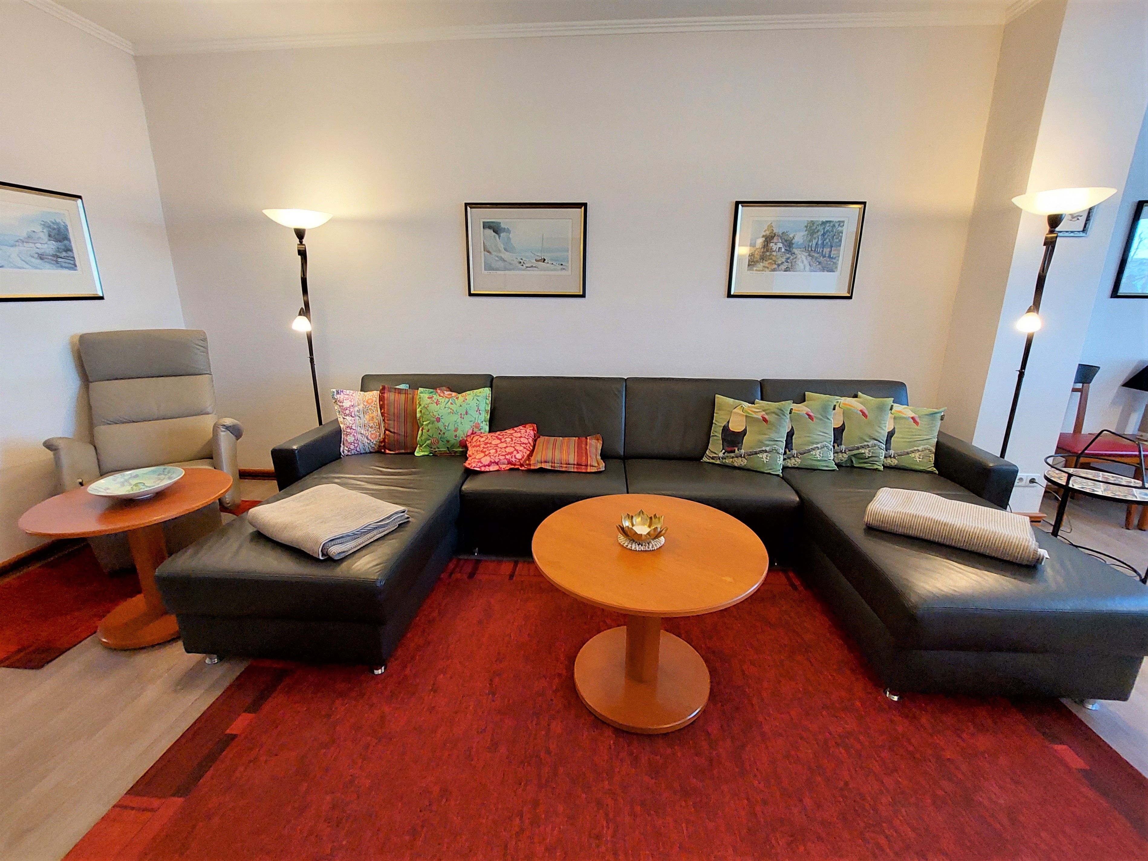 Das komfortable und stilvolle App. 553, im Hochparterre gelegen, verfügt über ein großes Wohn-/Esszimmer mit einer Ledercouchgarnitur. Sie kann zu einem bequemen Bett umfunktioniert werden für eine 5./6. P. (Liegefläche 1,40 m x 2,00 m). Es gibt einen 55 Zoll Smart TV, Radio mit CD, USB u. Bluetooth und einen DVD-Blu-ray-Player. WLAN ist inklusive.
