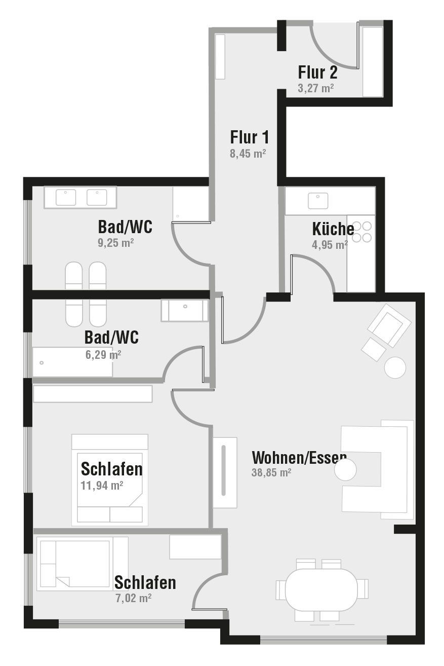 Das Appartement verfügt über einen offenen Wohn-/Essbereich mit integrierter Küche, 2 Doppel-Schlafzimmer und 2 Bäder.