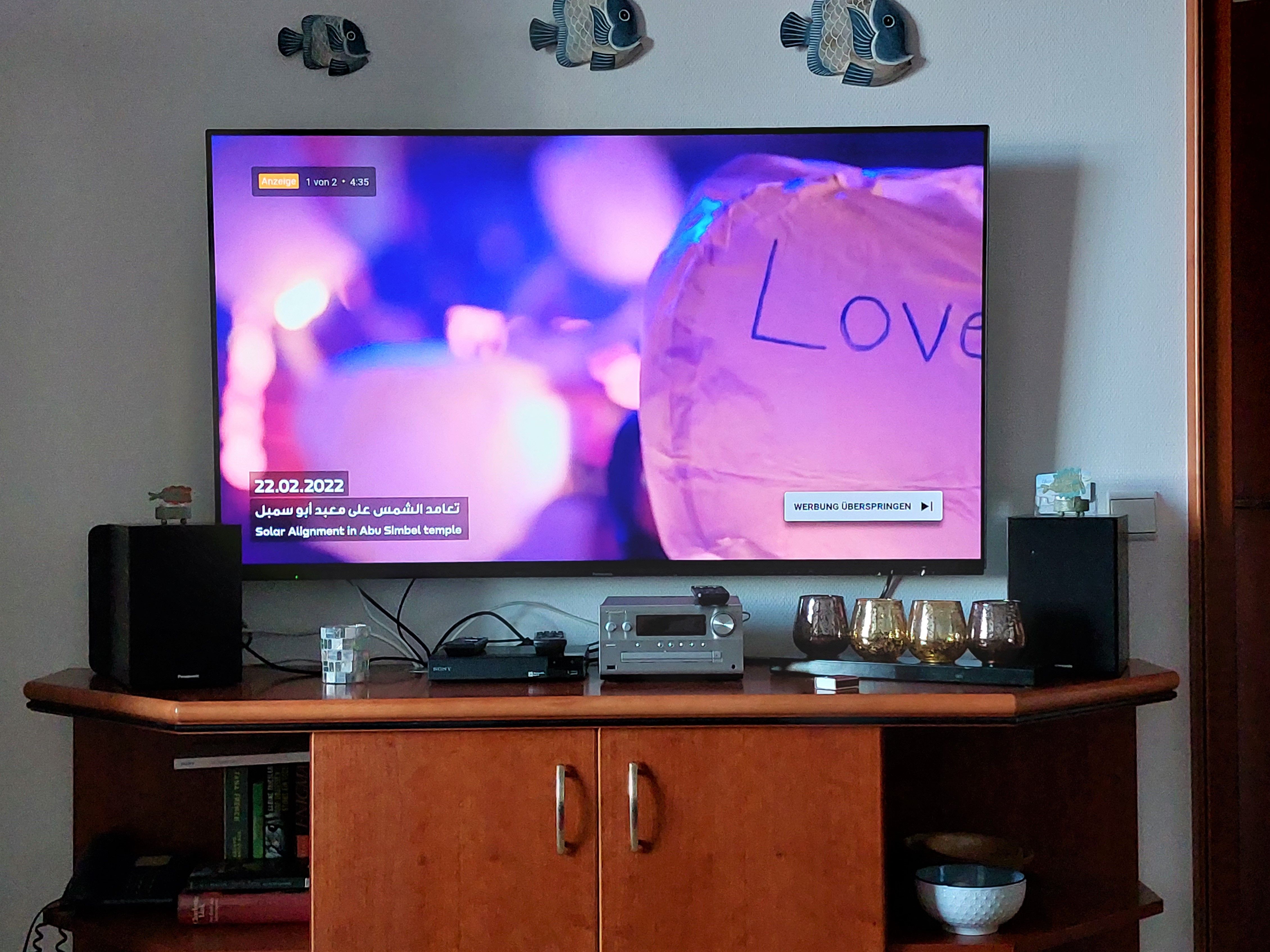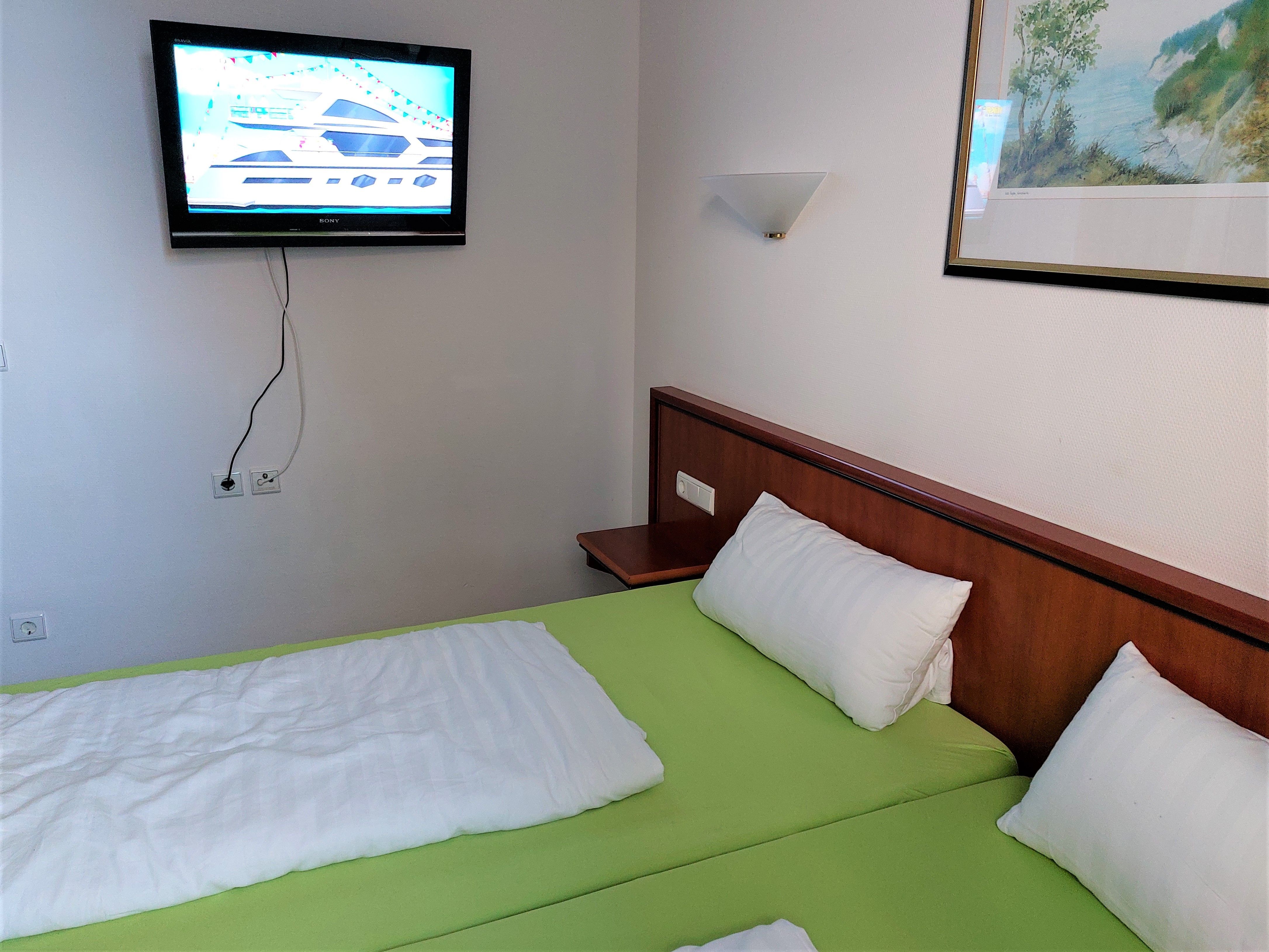 Es gibt ein großes Schlafzimmer mit großem Doppelbett (2,00 m x 2,00 m) und Zugang zum Badezimmer 1, sowie eines mit zwei Einzelbetten (je 0,80 m x 2,00 m), die zum Doppelbett zusammengeschoben werden können. Steckdosen in Bettnähe sind vorhanden. Plissees und Verdunkelungsvorhänge sind ebenso in beiden Schlafzimmern vorhanden. TV im großen Schlafzimmer vorhanden.