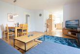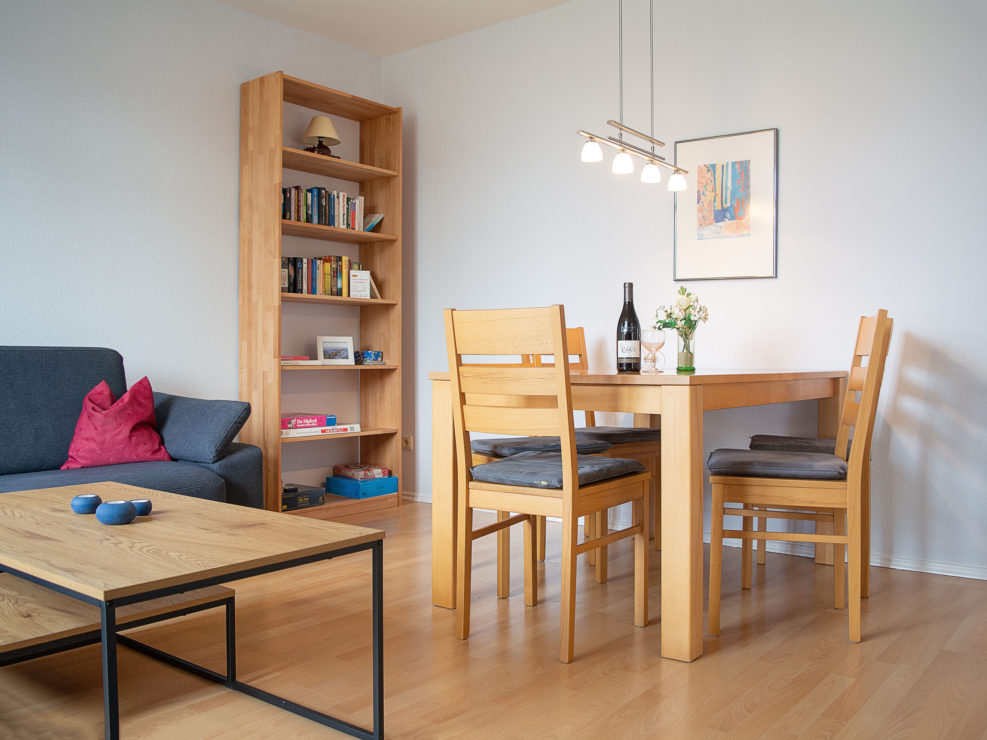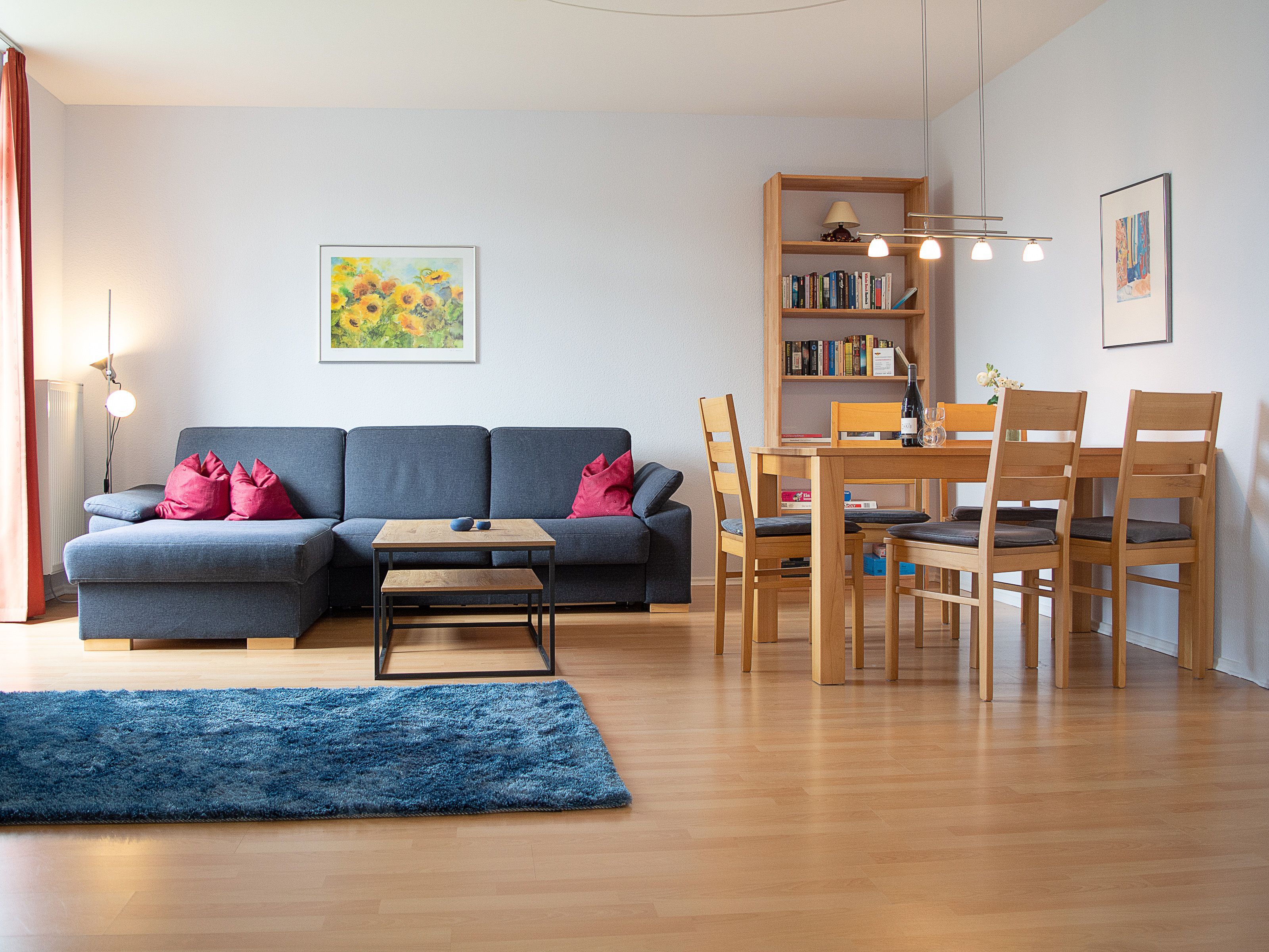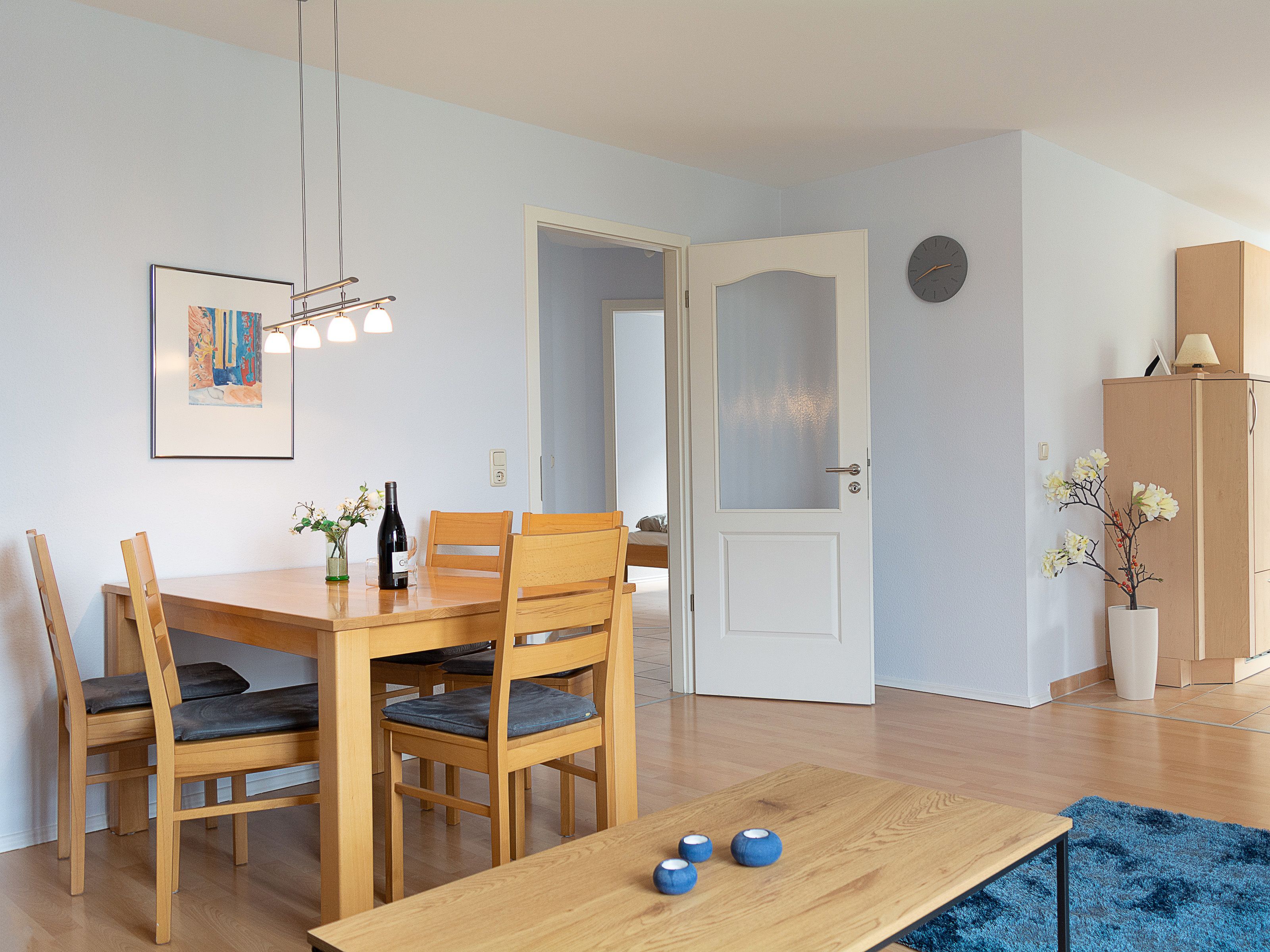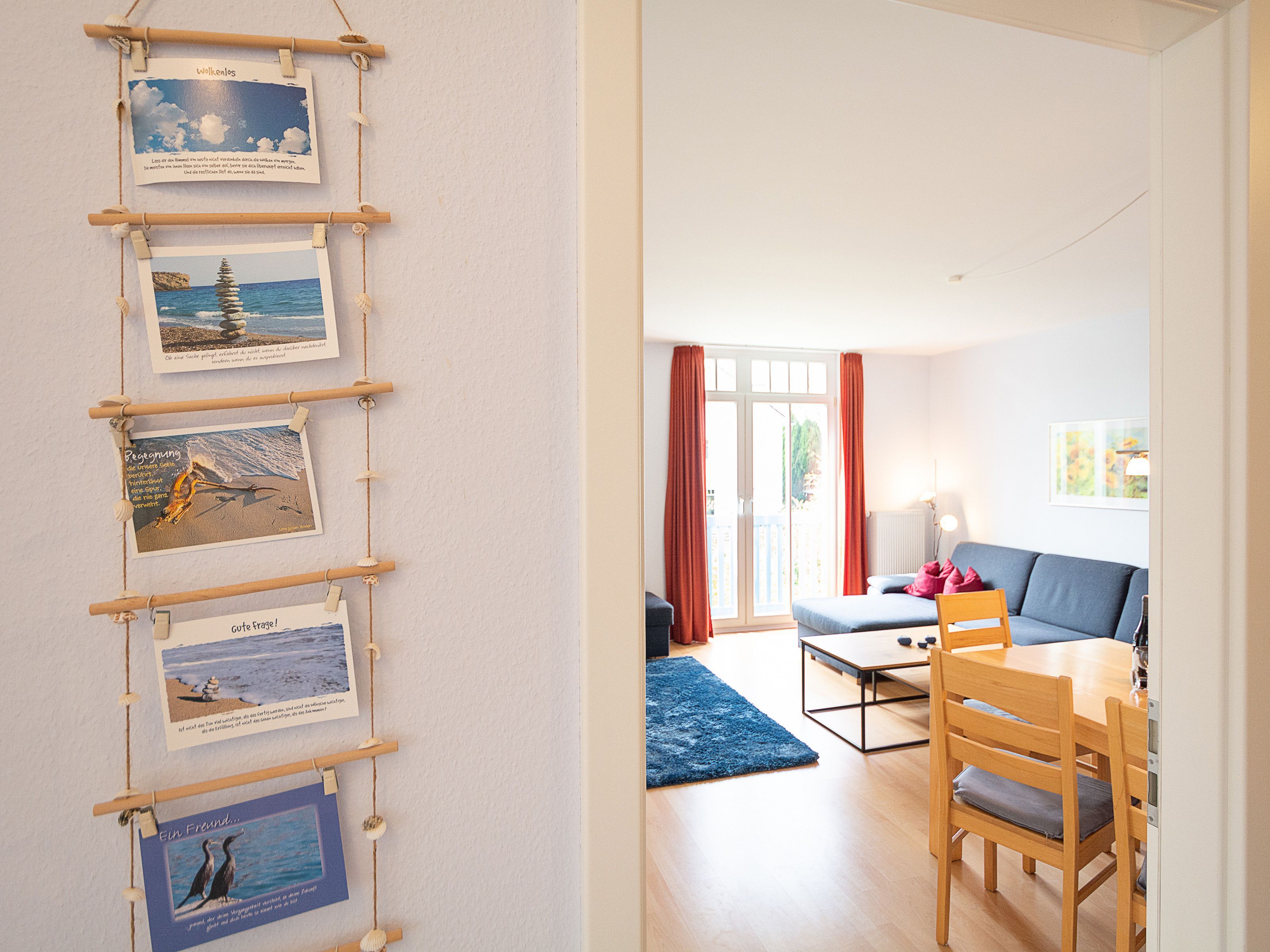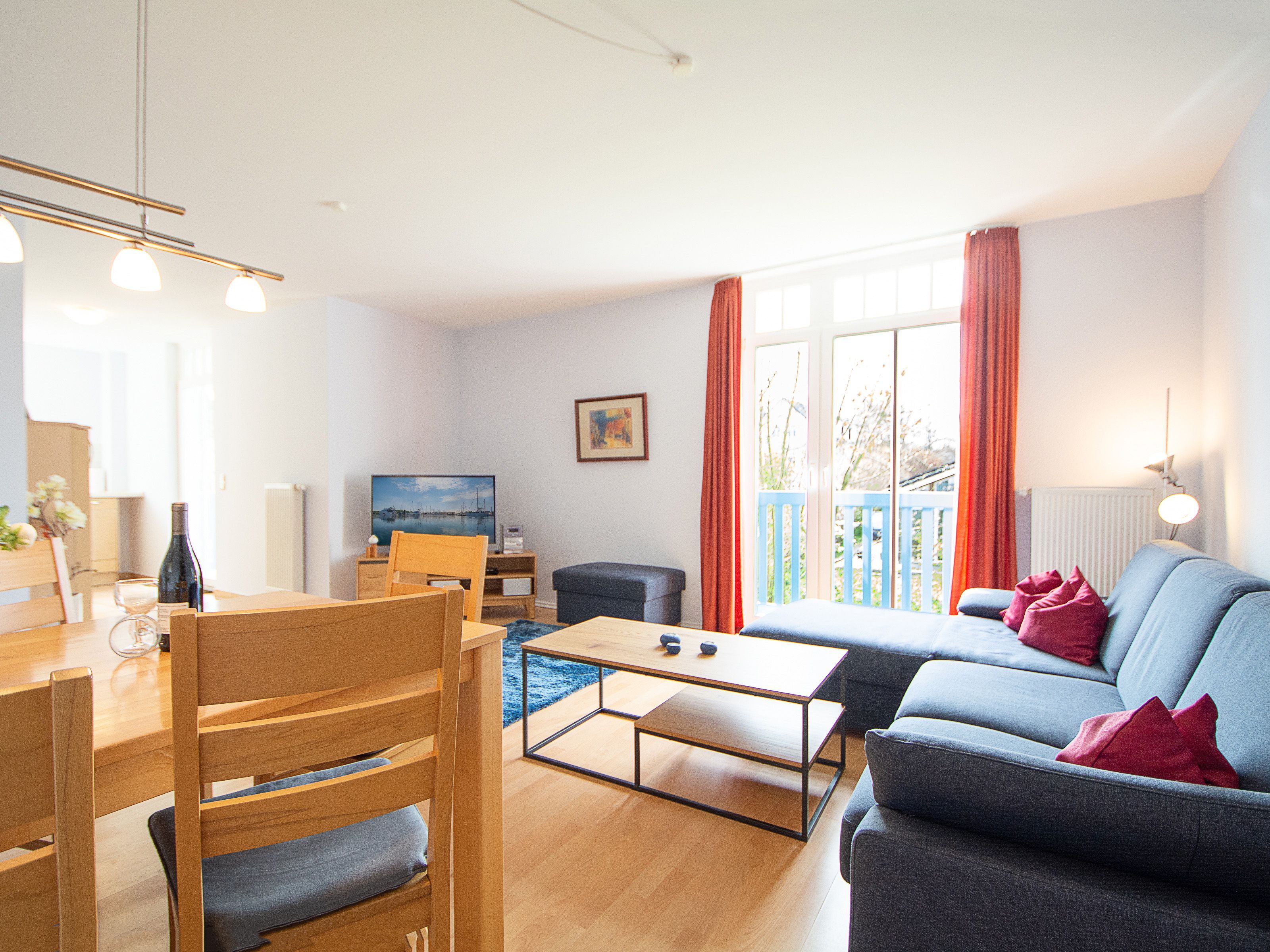 Sie wohnen in einer liebevoll eingerichteten 3-Raum-Wohnung von ca. 70 qm Größe, die im ersten Obergeschoss liegt. Das Wohnzimmer ist ausgestattet mit Küchenzeile (Herd mit Backofen, Geschirrspüler, Kaffeemaschine, Wasserkocher, Toaster), bequemer Sitzgarnitur, Essecke, Stereoanlage, HD Flatscreen TV und BluRay/ DVD Player. Vom Wohnraum aus betreten Sie den Balkon in Richtung Westen, der zum Entspannen einlädt. Ein Schlafzimmer mit Doppelbett und ein Schlafzimmer mit Schlafcouch sowie das Bad mit Dusche und WC vervollständigen das Gesamtbild dieser Wohnung.
