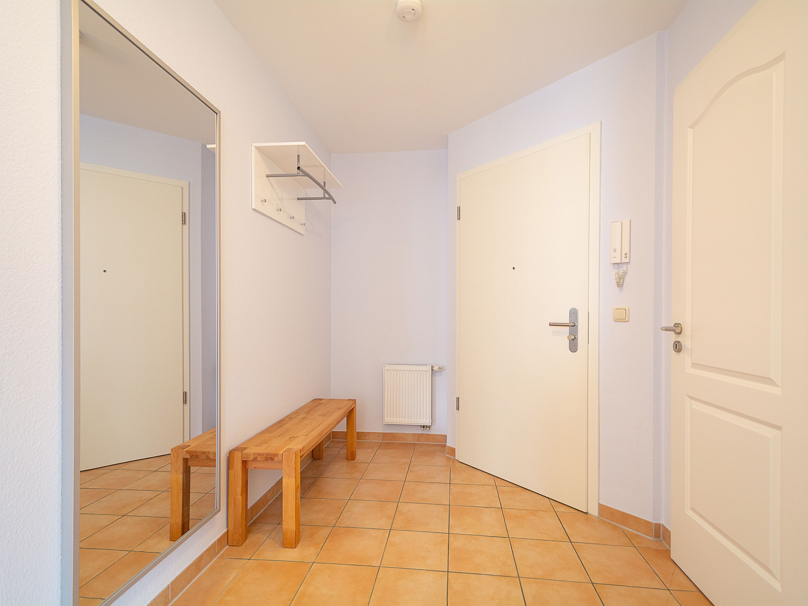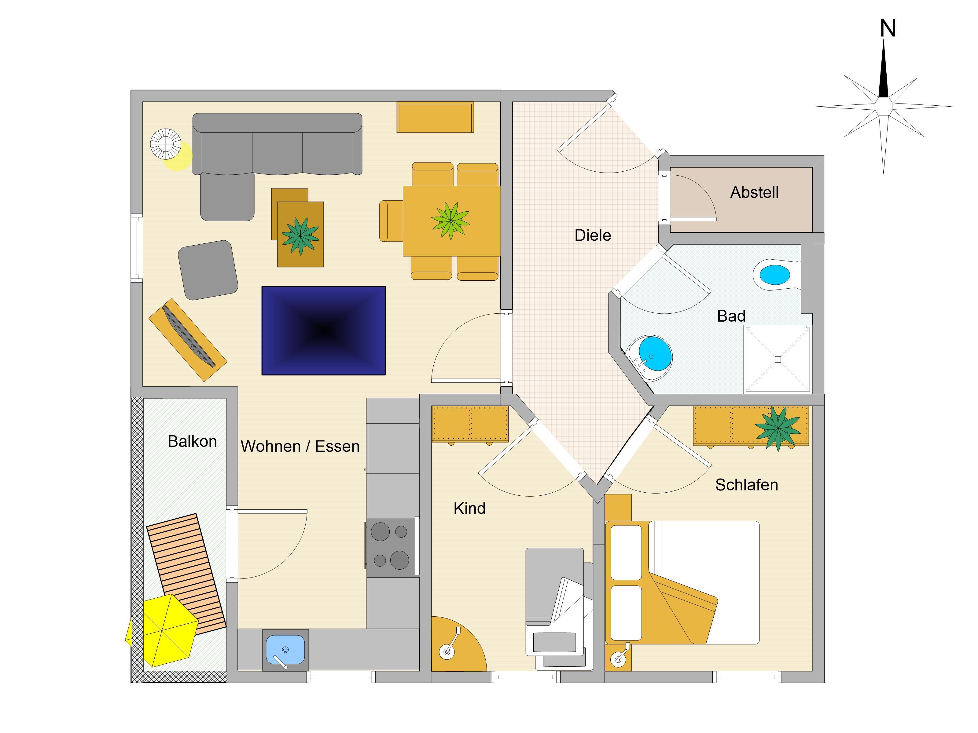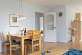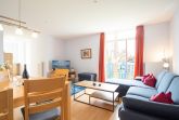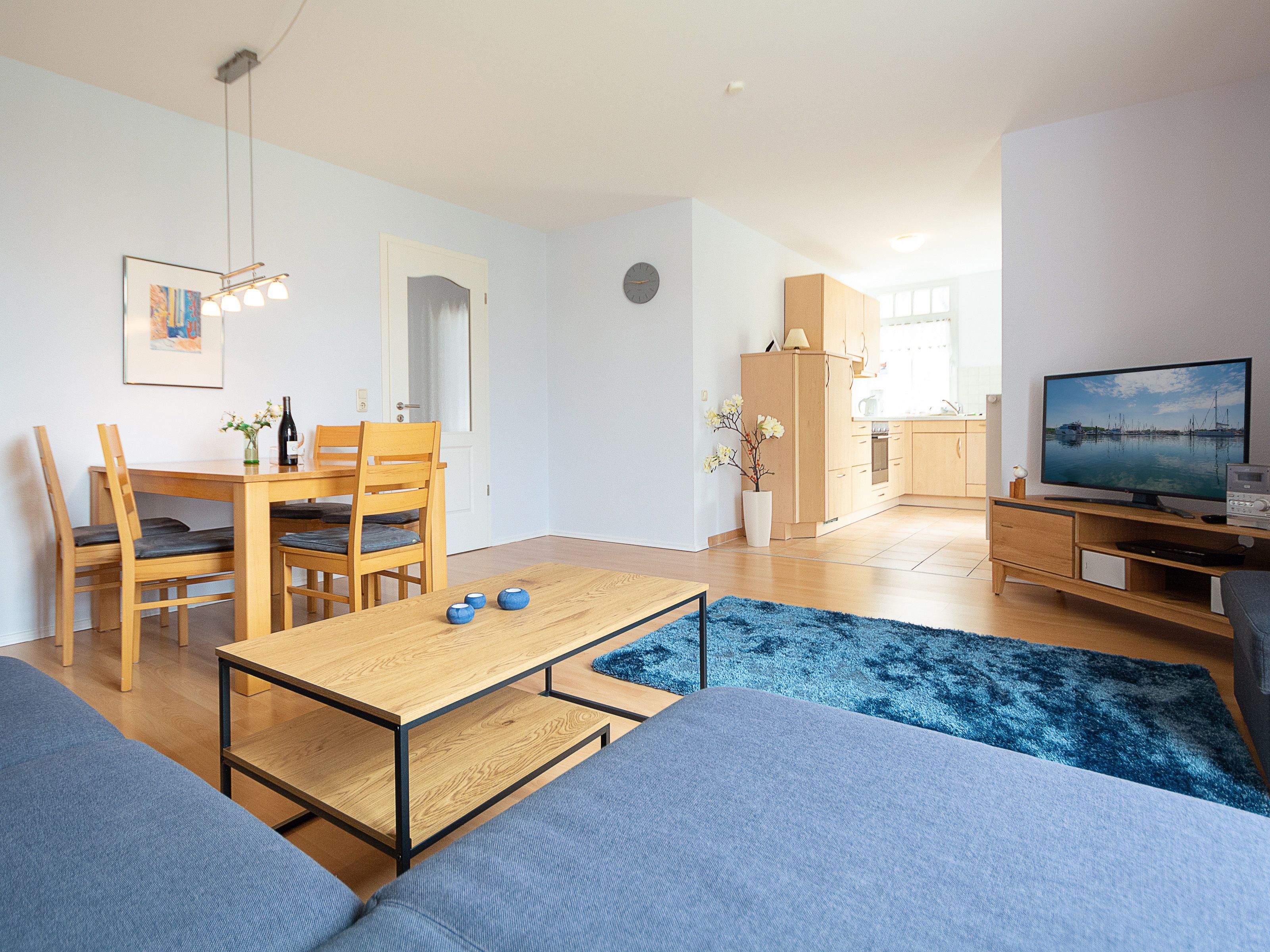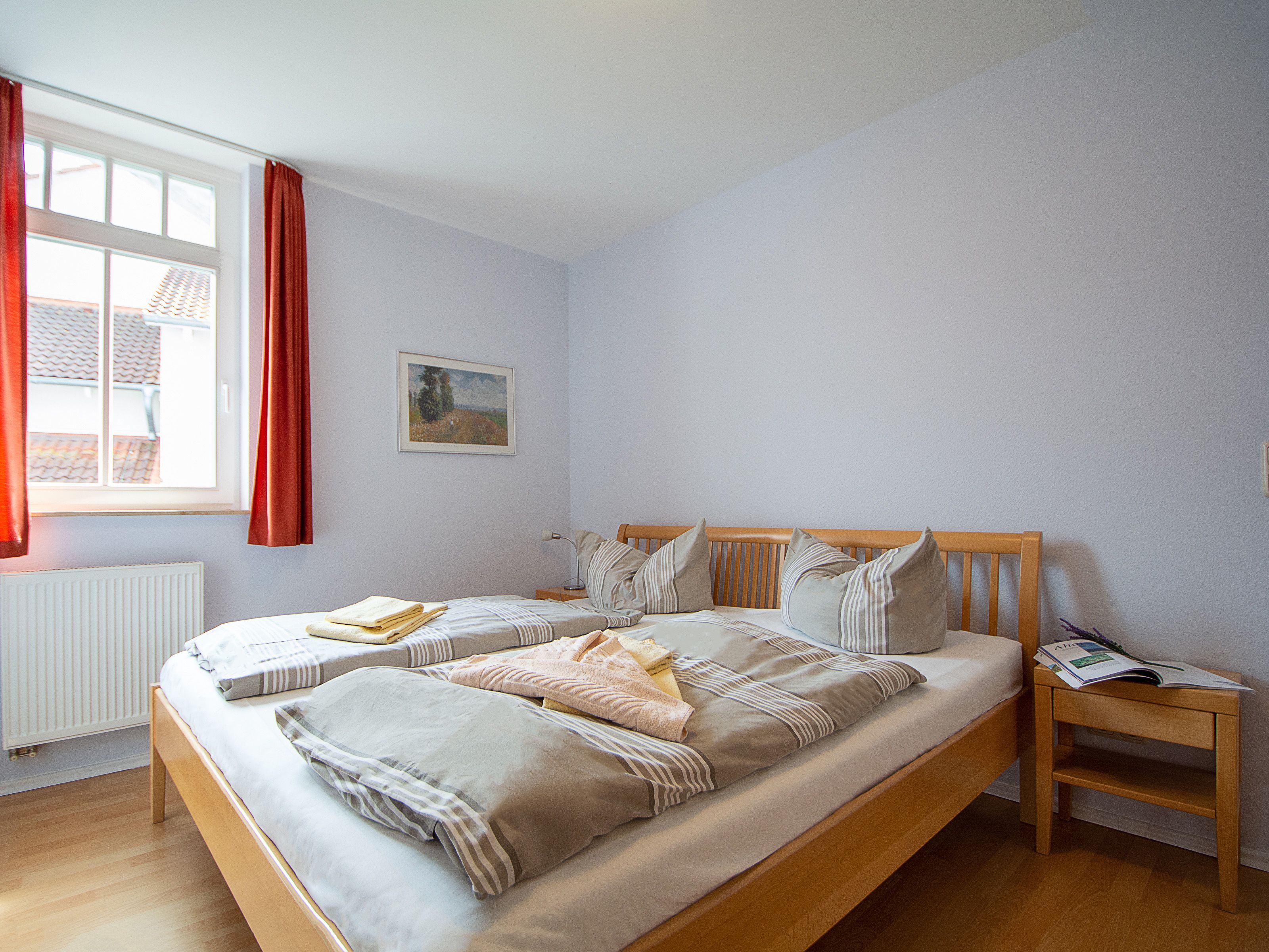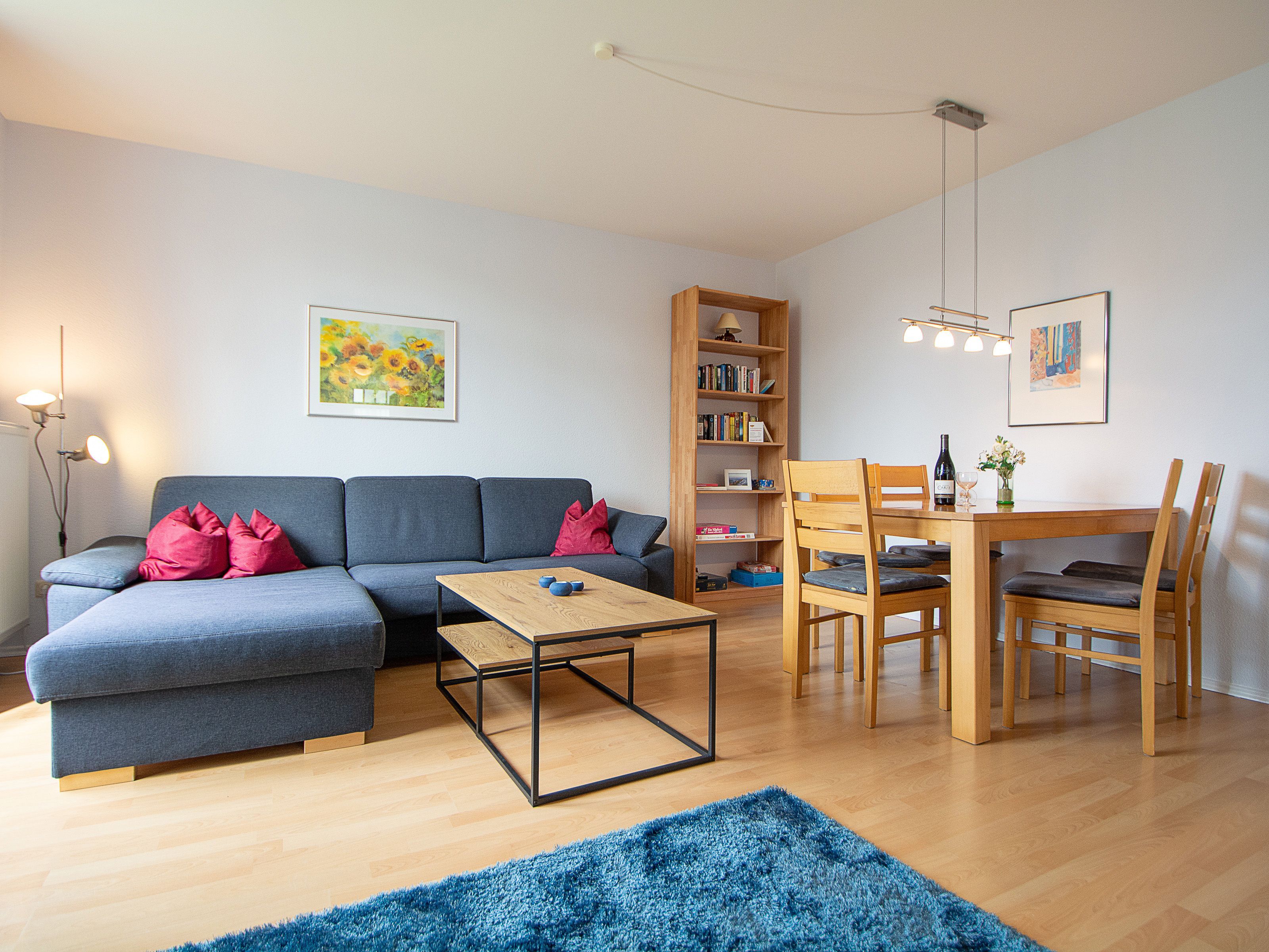 Sie wohnen in einer liebevoll eingerichteten 3-Raum-Wohnung von ca. 70 qm Größe, die im ersten Obergeschoss liegt. Das Wohnzimmer ist ausgestattet mit Küchenzeile (Herd mit Backofen, Geschirrspüler, Kaffeemaschine, Wasserkocher, Toaster), bequemer Sitzgarnitur, Essecke, Stereoanlage, HD Flatscreen TV und BluRay/ DVD Player. Vom Wohnraum aus betreten Sie den Balkon in Richtung Westen, der zum Entspannen einlädt. Ein Schlafzimmer mit Doppelbett und ein Schlafzimmer mit Schlafcouch sowie das Bad mit Dusche und WC vervollständigen das Gesamtbild dieser Wohnung.