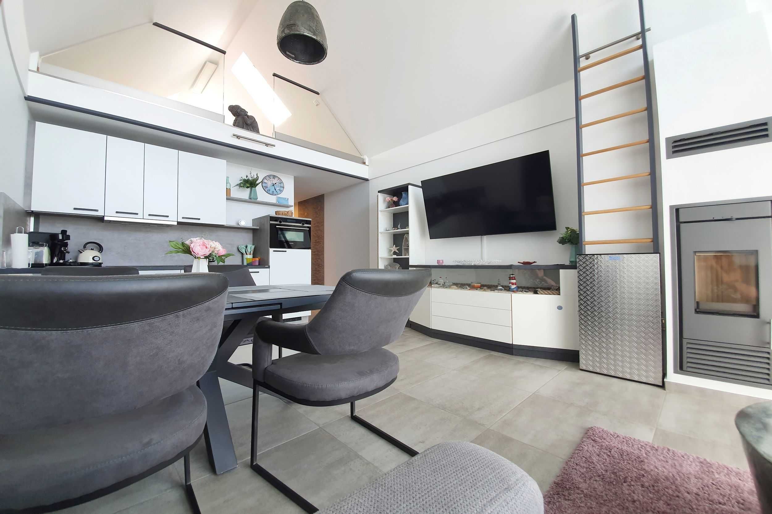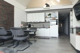 Der modern und hochwertig eingerichtete Wohnbereich bietet eine gemütliche Couchgarnitur und Smart TV (kostenlos Sky, Netflix & Disney). Die offene Wohnküche mit Essbereich ist mit einem 4-Felder Induktionsherd, Backofen, Kühlschrank, Spülmaschine, Kaffeemaschine und reichlich Küchenutenslilien bestens ausgestattet.