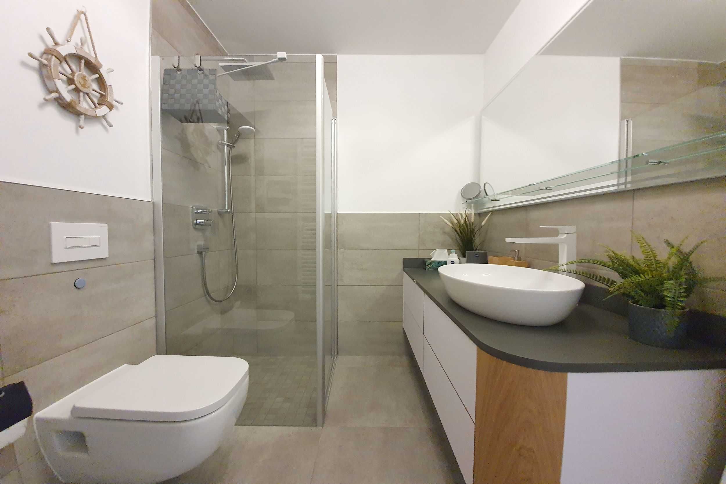 Das Bad ist mit einer ebenerdigen Dusche, Haartrockner und WC ausgestattet. Die Sauna und Fußbodenheizung komplettieren das Apartment.