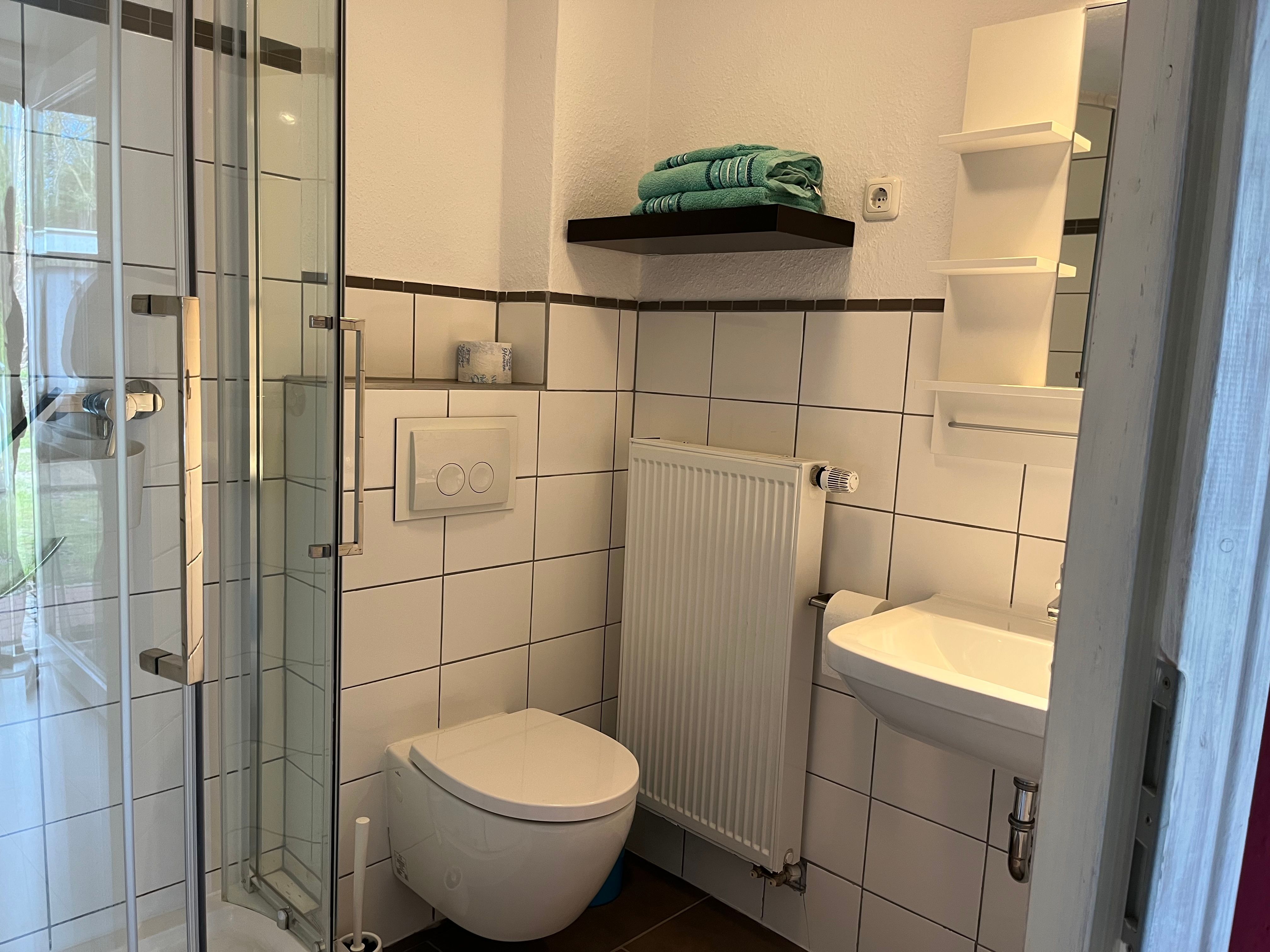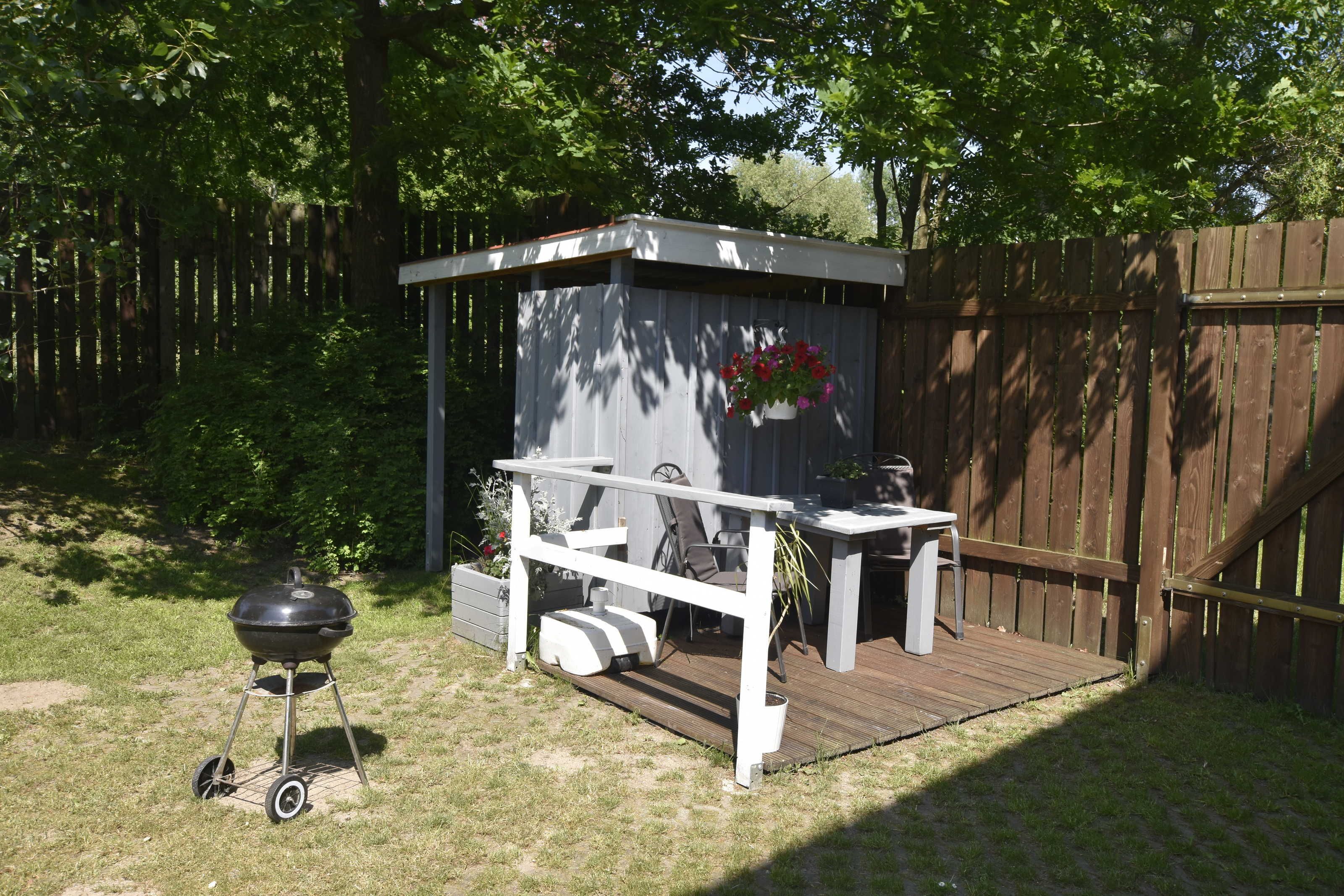 Ferienwohnung ist komplett ausgestattet mit Herd, Kühlschrank, Kaffeemachine, Bad mit Du & WC, Doppelbett und Sitzecke im Garten.