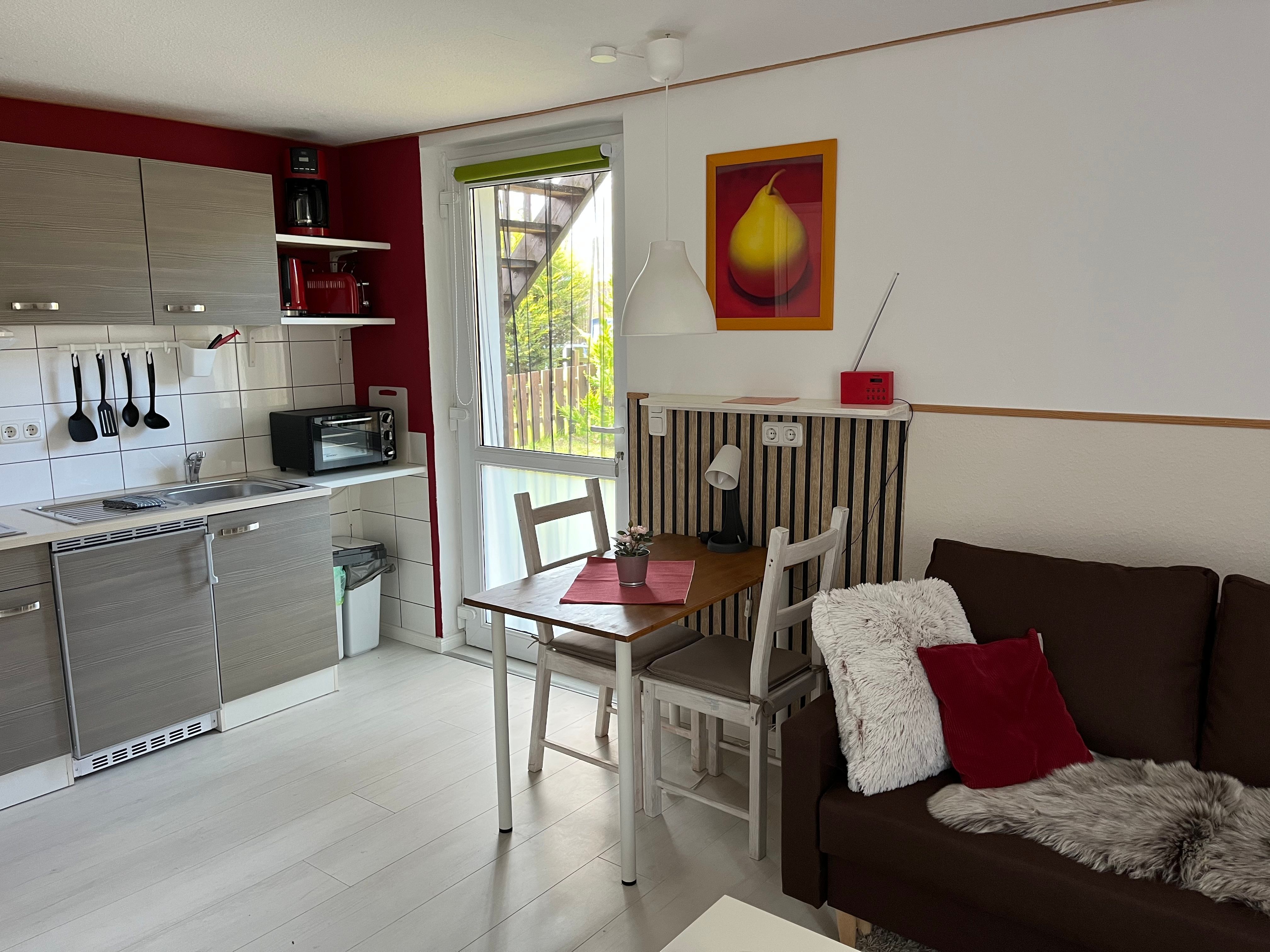 Gemütliche farbenfrohe Ferienwohnung im Erdgeschoß. Wohnschlafraum mit Sitzecke und Eßtisch. Integrierte Küchenzeile mit 2-Plattenherd, Kaffeemachine, Wasserkocher, Toaster und Kühlschrank. Badezimmer mit Du & WC. Föhn vorhanden. Garten mit Sitzecke, Gartenmöbel und Fahrradschuppen.