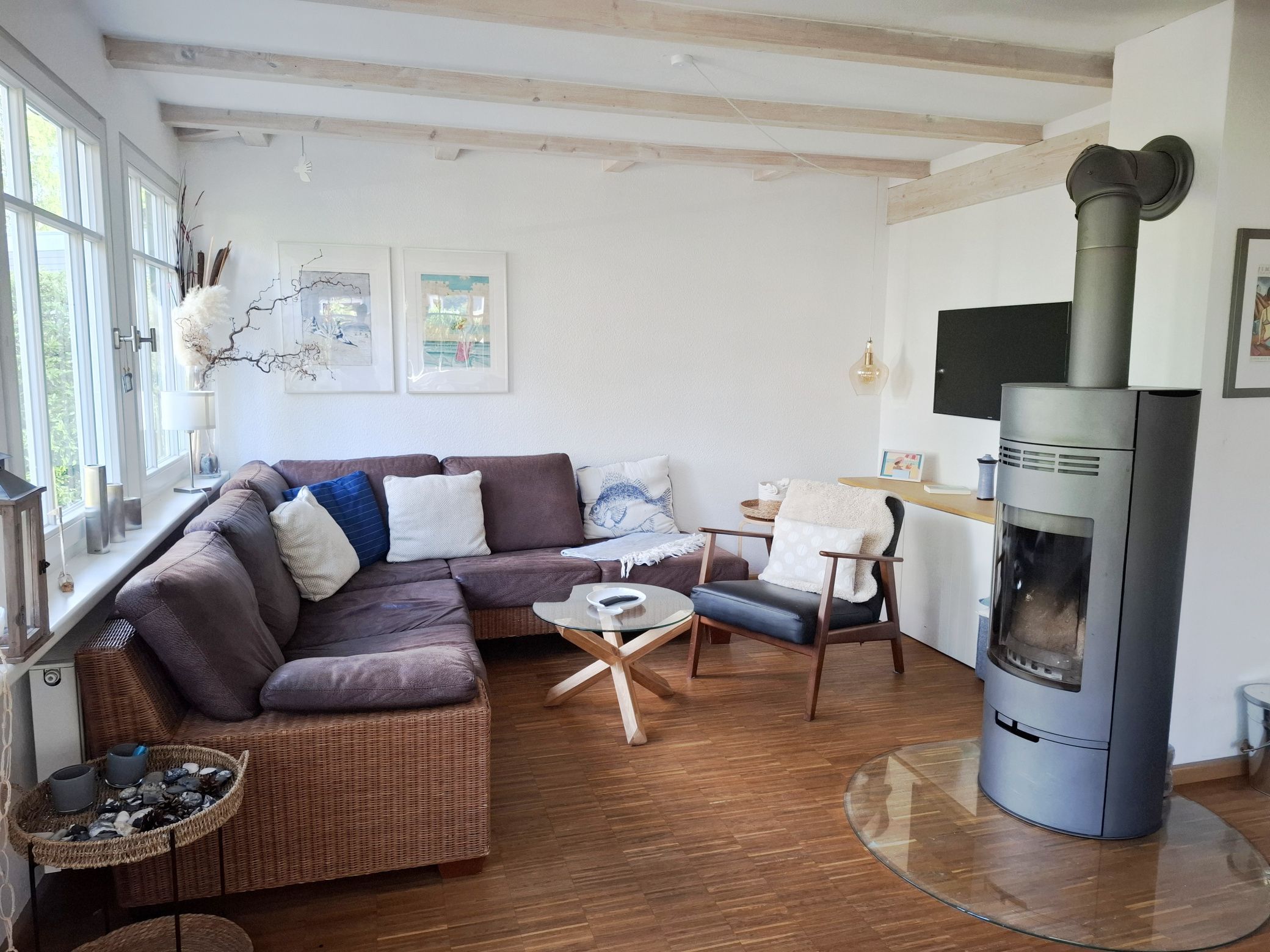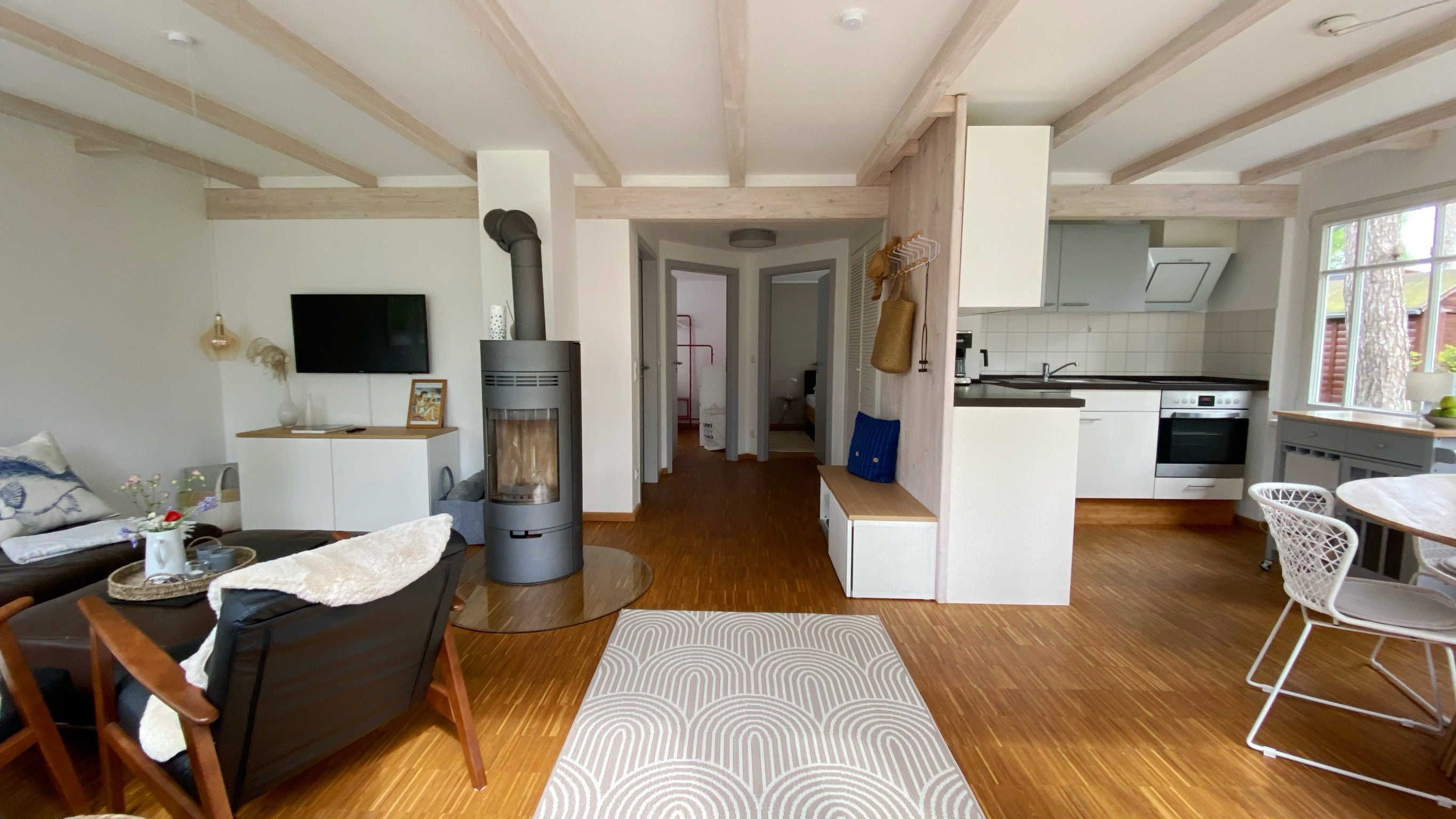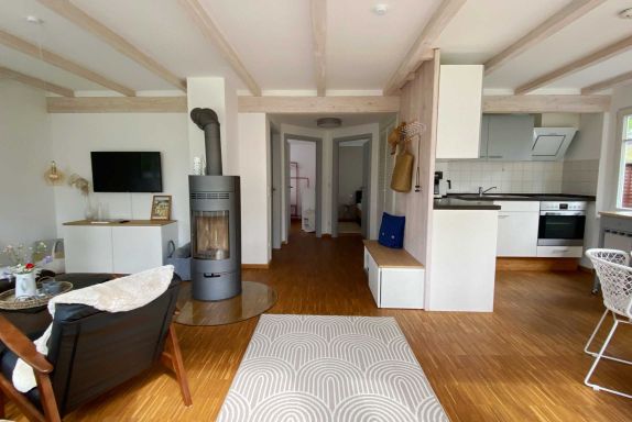Der Wohnbereich mit großzügiger Fensterfront ist durch einen Kamin und die gemütliche Sitzecke geprägt. Am runden Esstisch aus Holz finden bis 6 Personen bequem Platz. Die offene Küche ist komplett ausgestattet mit Geschirrspüler, Kühlschrank mit Gefrierfach, Cerankochfeld und Backofen, Mikrowelle, Kaffeemaschine, Wasserkocher und Toaster.