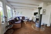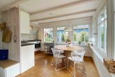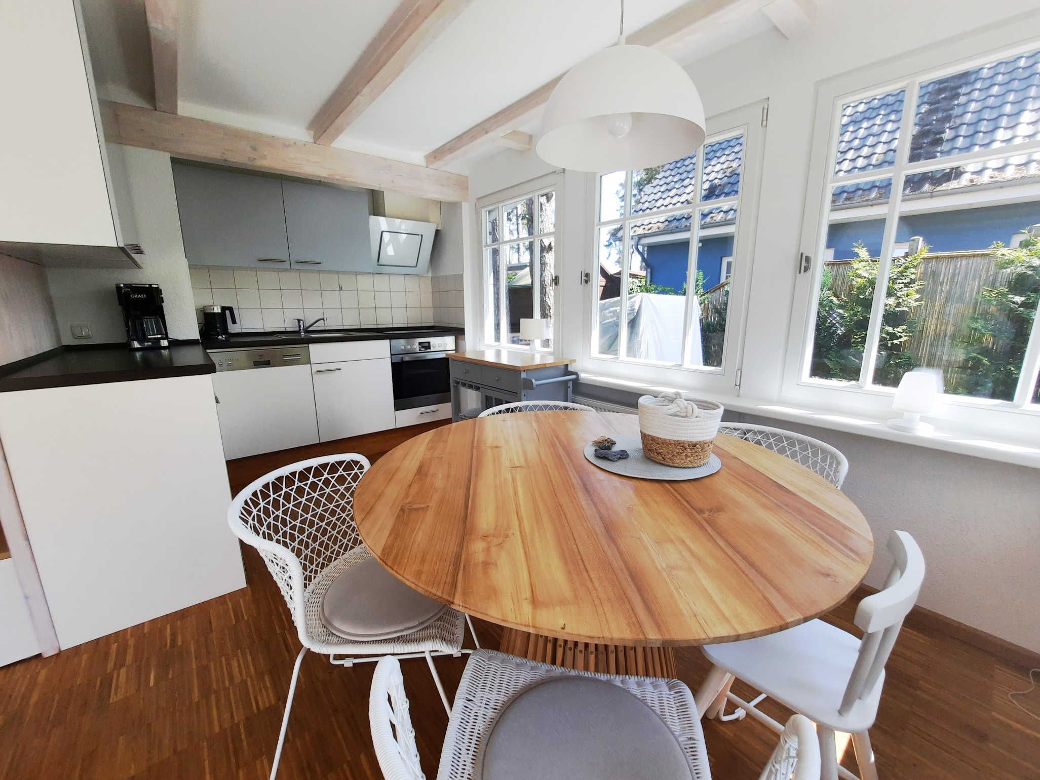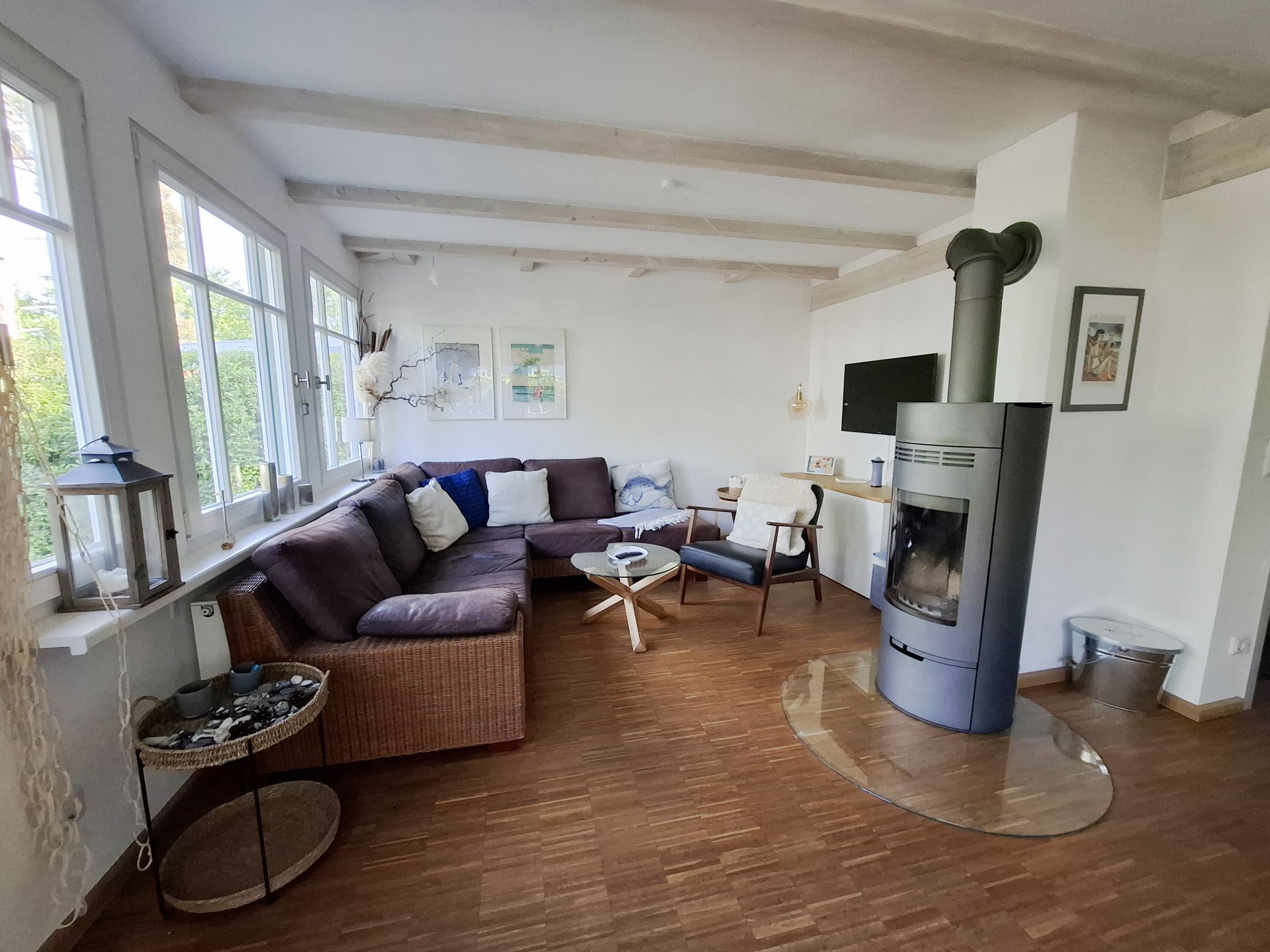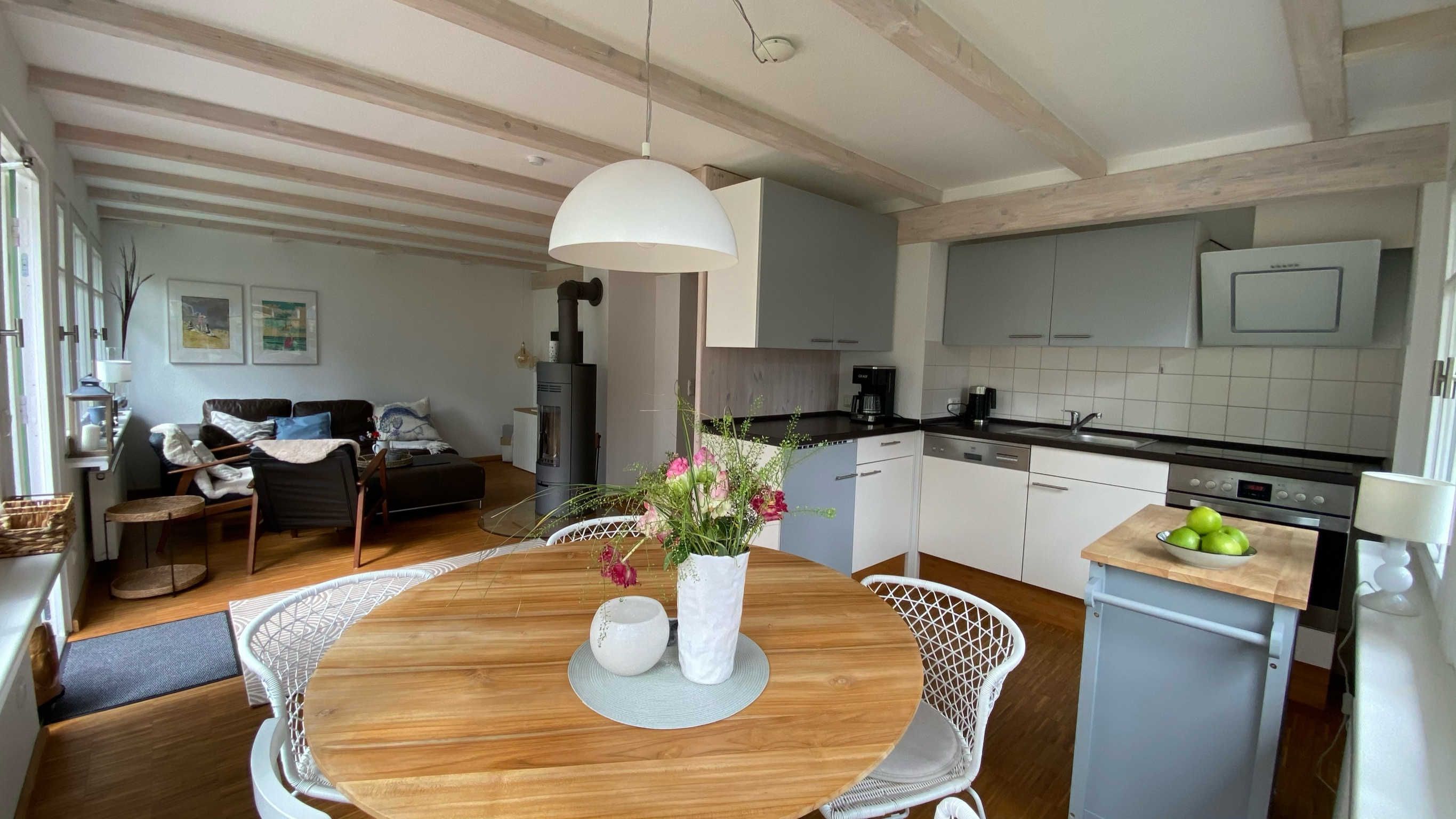 Der Wohnbereich mit großzügiger Fensterfront ist durch einen Kamin und die gemütliche Sitzecke geprägt. Am runden Esstisch aus Holz finden bis 6 Personen bequem Platz. Die offene Küche ist komplett ausgestattet mit Geschirrspüler, Kühlschrank mit Gefrierfach, Cerankochfeld und Backofen, Mikrowelle, Kaffeemaschine, Wasserkocher und Toaster.