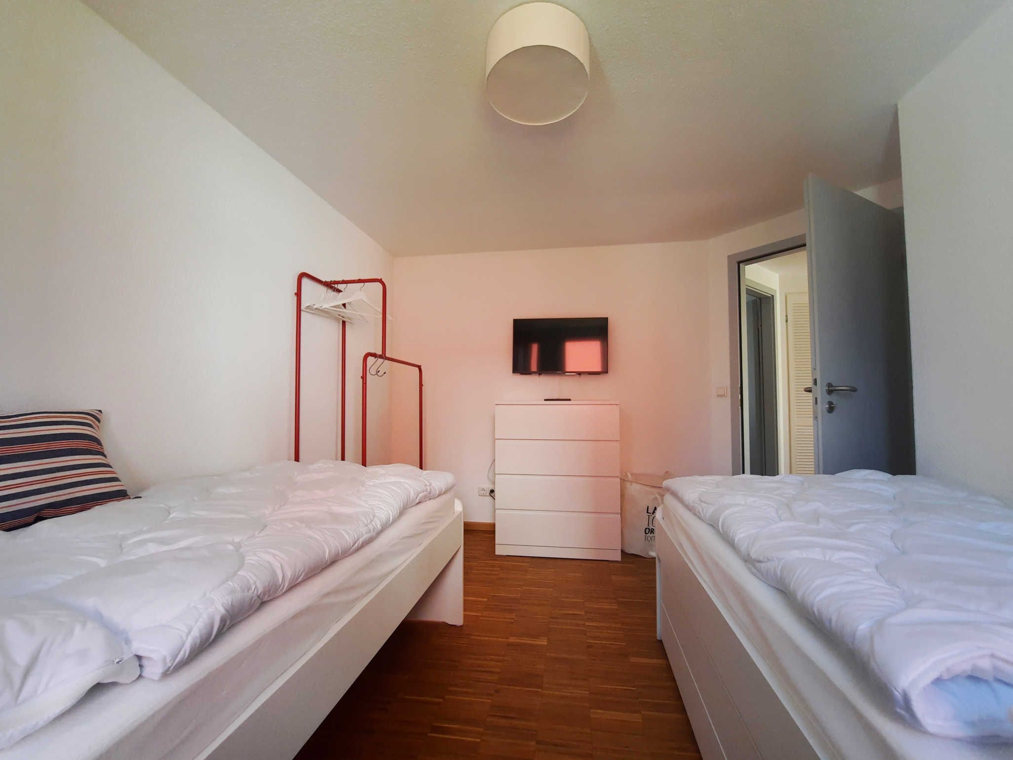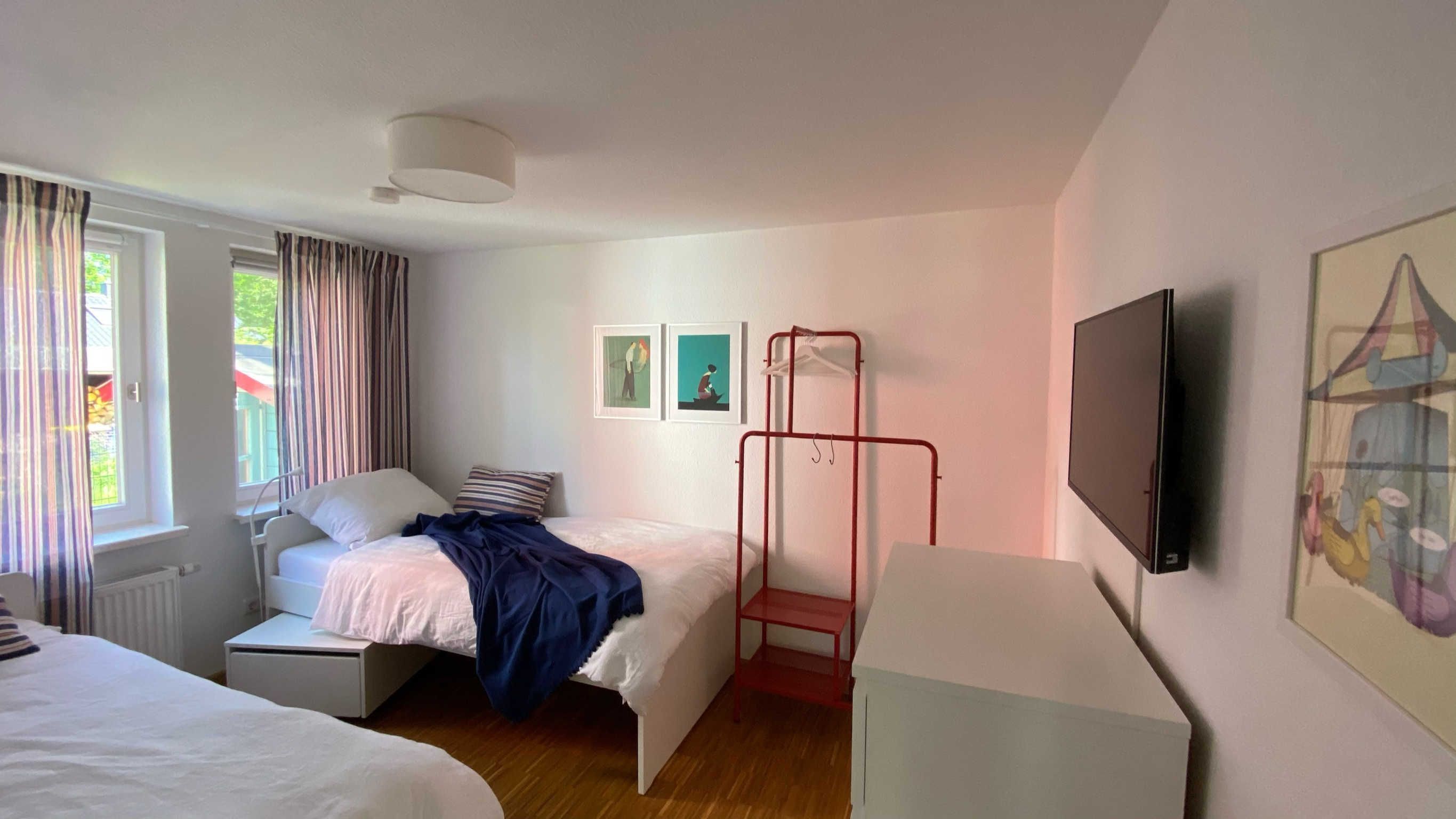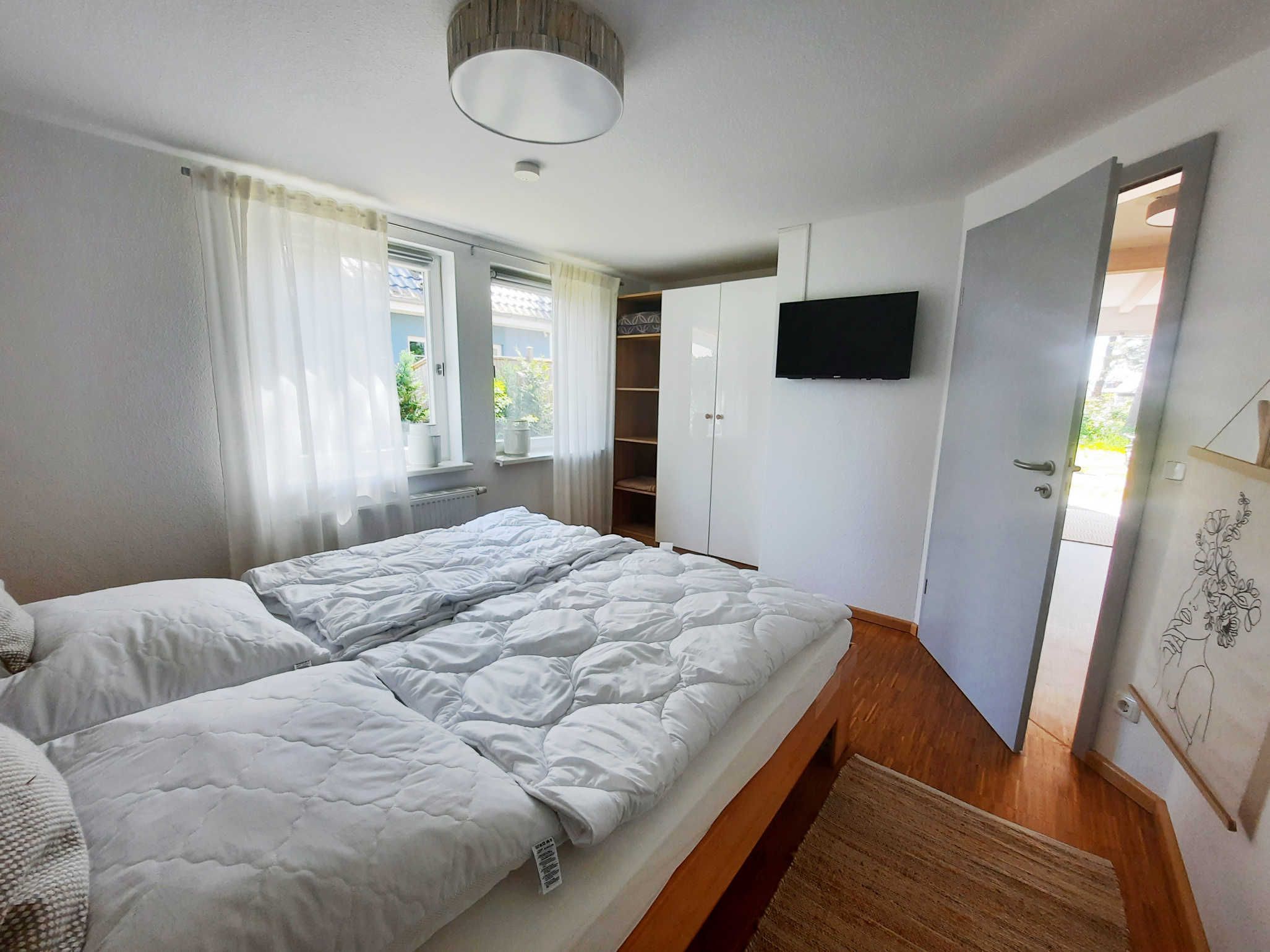 Alle Schlafgelegenheiten in den beiden Zimmern verfügen über hochwertige Federkernmatratzen und Flat-TV. In einem Schlafzimmer befindet sich ein Doppelbett (180x200cm) sowie ein Kleiderschrank. Im weiteren Schlafzimmer befinden sich zwei Einzelbetten und ein Ausziehbett mit jeweils 90x200 cm. Die Schlafräume sind mit Thermoverdunklungsrollos und Insektenschutz an den Fenstern ausgestattet.
