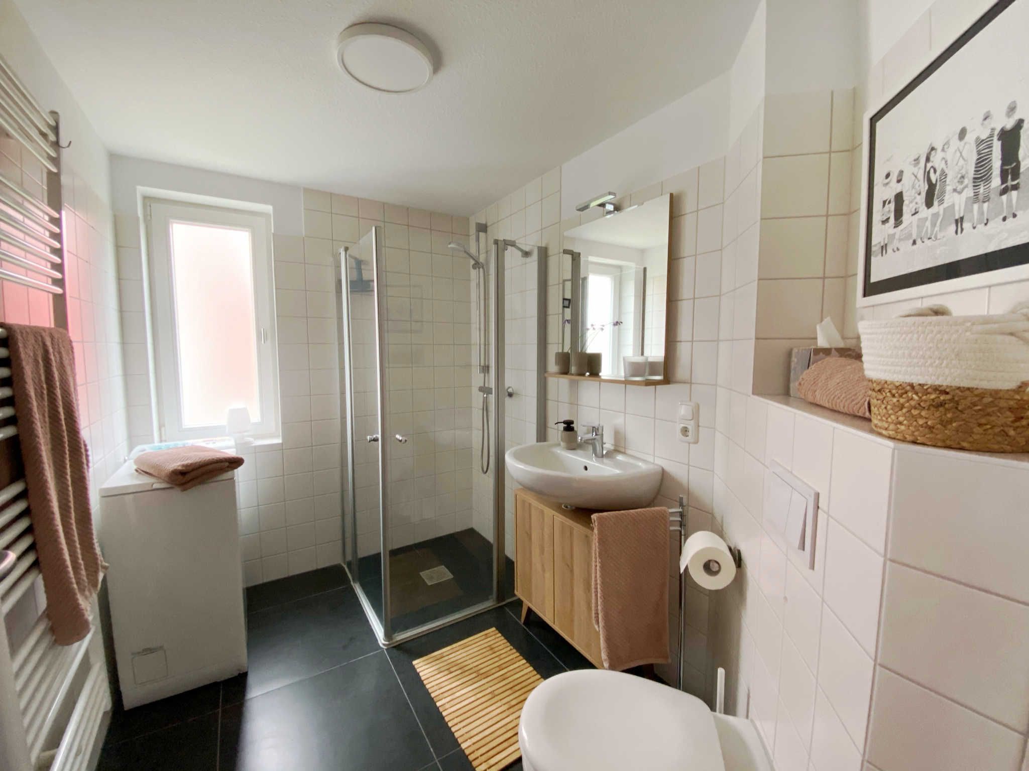 Im Badezimmer mit Fenster befindet sich eine bodengleiche Dusche sowie eine Waschmaschine.