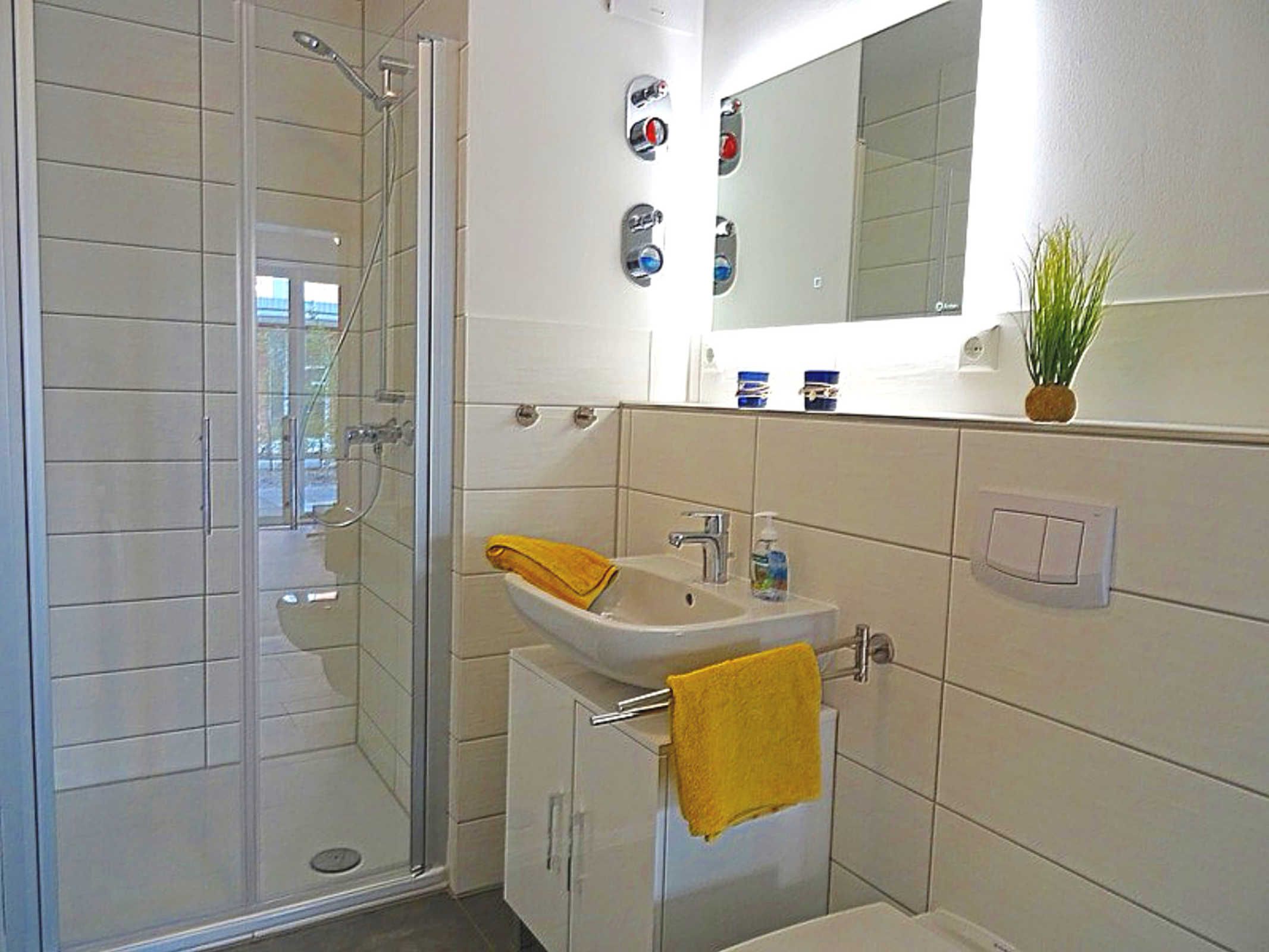 Das geräumige Badezimmer ist hell gestaltet und verfügt über eine moderne, bodentiefe Dusche. Sehr praktisch ist hier die eigene Waschmaschine. Auch ein Fön ist vorhanden.