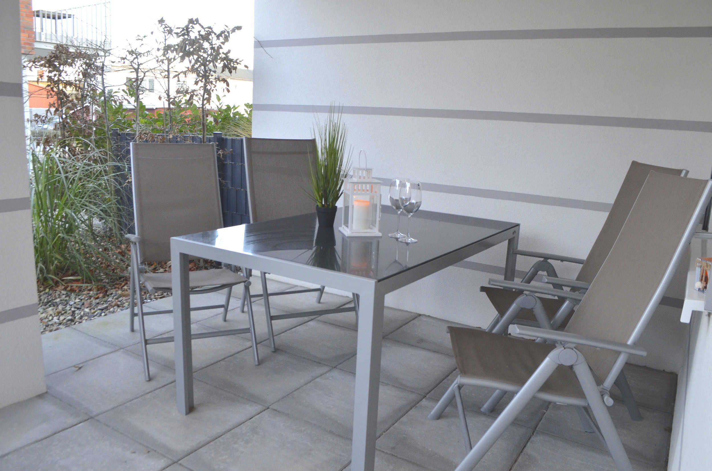 Ein Highlight des Appartements ist natürlich die sehr große Terrasse mit gemütlichem Sitzbereich und Hochlehnstühlen sowie dem kleinen Kiesgarten mit Dünengras. Hier sitzend weiß man sofort: Ich bin im Urlaub an der See!