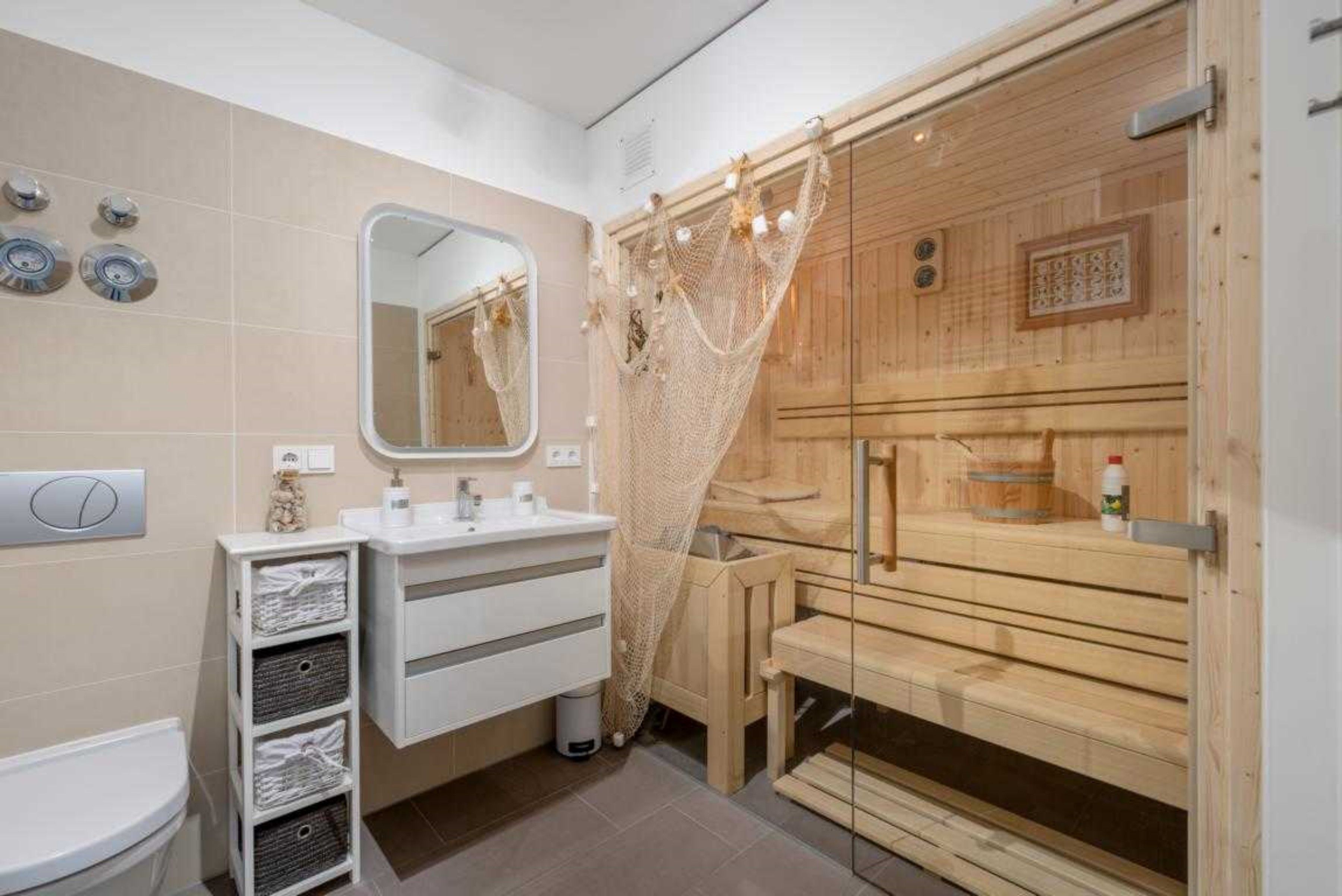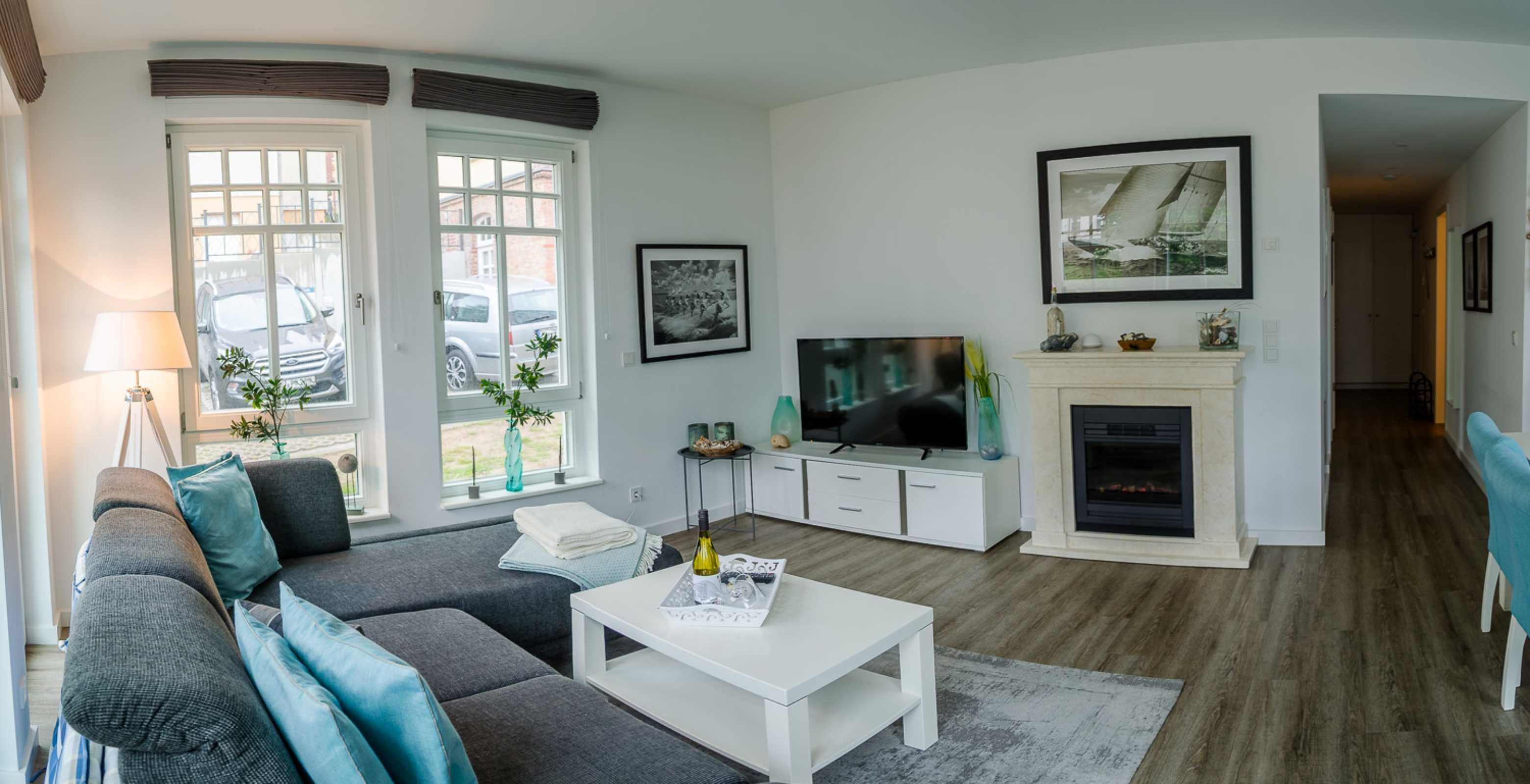 Die moderne 3-Raum-Raumwohnung mit 68 qm bietet Platz für 4 Personen und ist Richtung Garten ausgerichet. Sie verfügt über einen hellen Wohn-Essbereich mit gemütliche große Couch, Flat-TV und Elektrokamin sowie offener, voll ausgestatteter Küche. Die beiden modern eingerichteten Schlafzimmer sind mit Doppelbetten und Flat-TV ausgestattet. Das geräumige Bad verfügt über Dusche und WC sowie eine finnische Sauna. Ein separates Gäste-WC ist ebenfalls vorhanden. Die komplette Wohnung ist mit Fußbodenheizung ausgestattet.