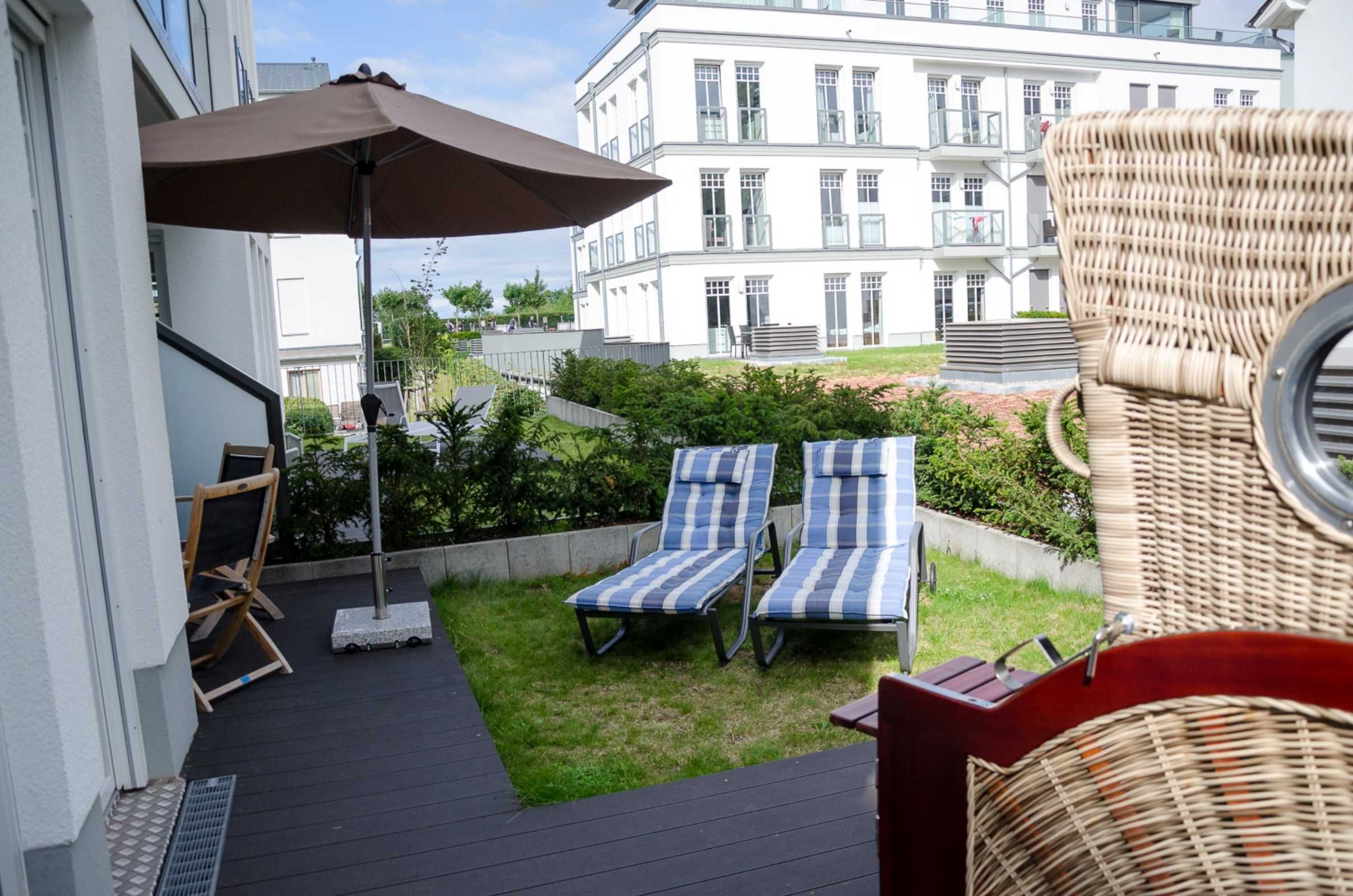 Die Wohnung verfügt über eine große möblierte Terrasse mit Sonnenliegen und Sonnenschirm.