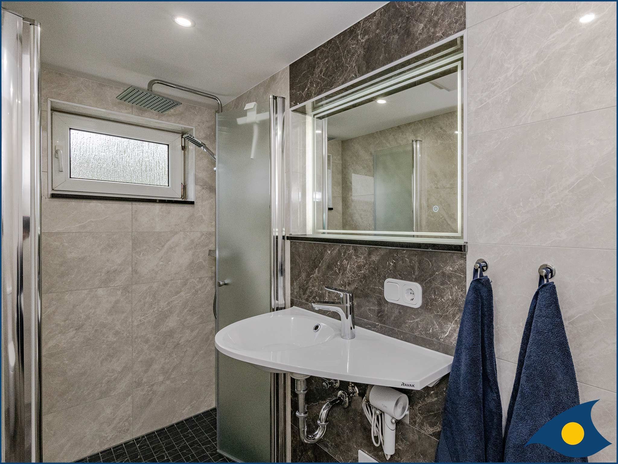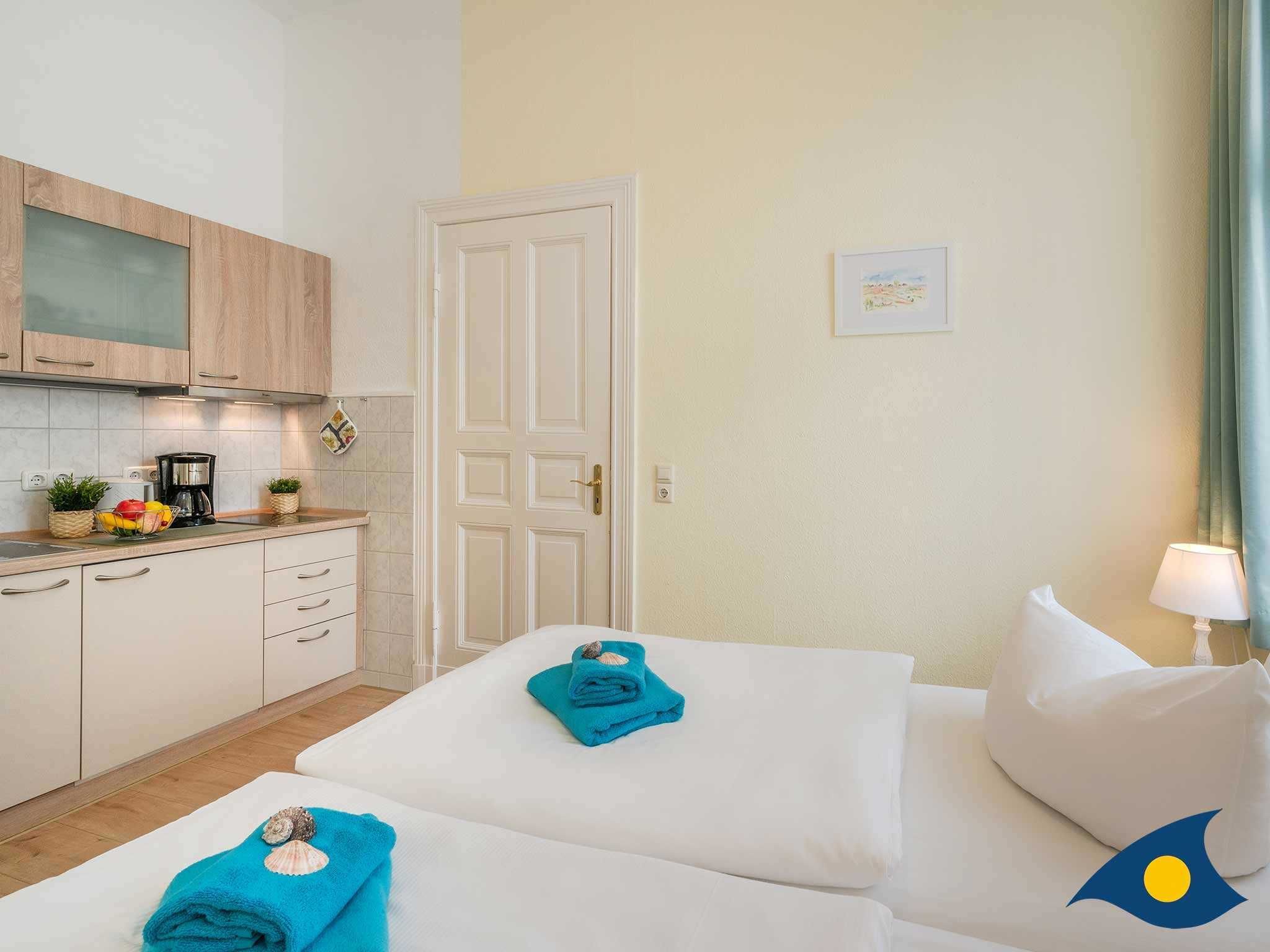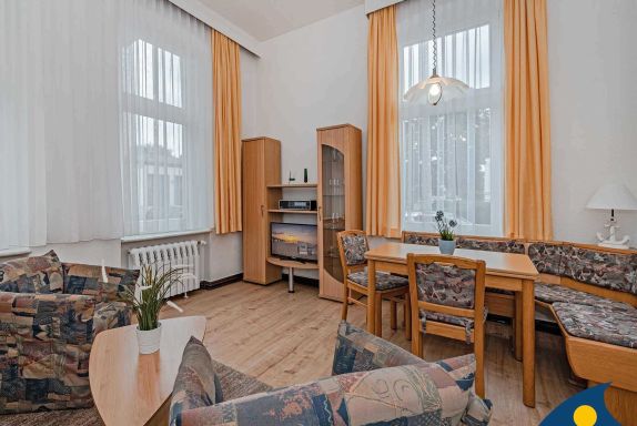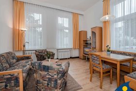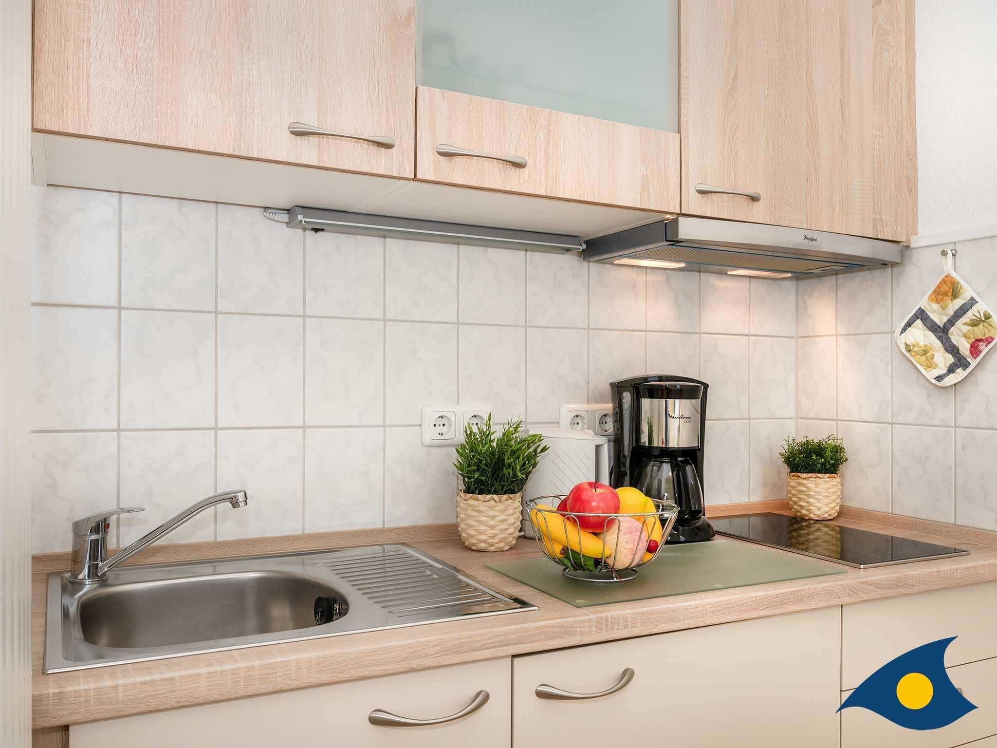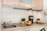 Die Wohnung ist mit einem Schlafzimmer mit integrierter Küche ausgestattet.In der Wohnstube befindet sich eine ausziehbare Couch, ein Fernseher und ein Essbereich mit einem großen Tisch und einer Sitzecke. Die Küche ist komplett ausgestattet mit Kühlschrank, Herd, Besteck, Geschirr, Kaffeemaschine und Toaster. Außerdem befindet sich in der Wohnung ein Bad mit Dusche sowie ein separater Eingangsbereich mit Kleiderschrank. Das Haus besitzt eine Zentralheizung. Ein Fahrzeugstellplatz am Haus ist vorhanden für normale Pkw´s (nicht geeignet sind Kleinbusse, Transporter etc.).