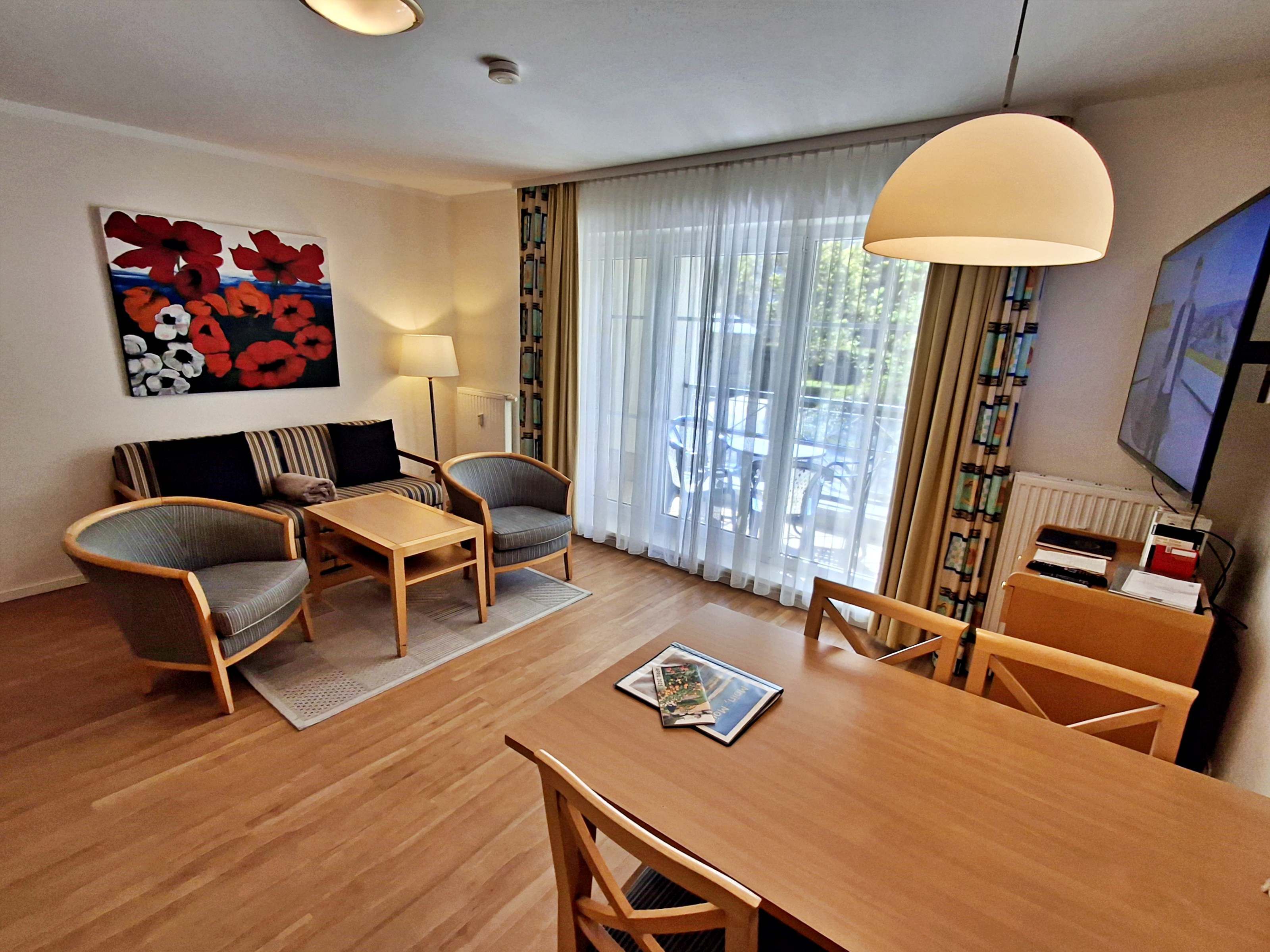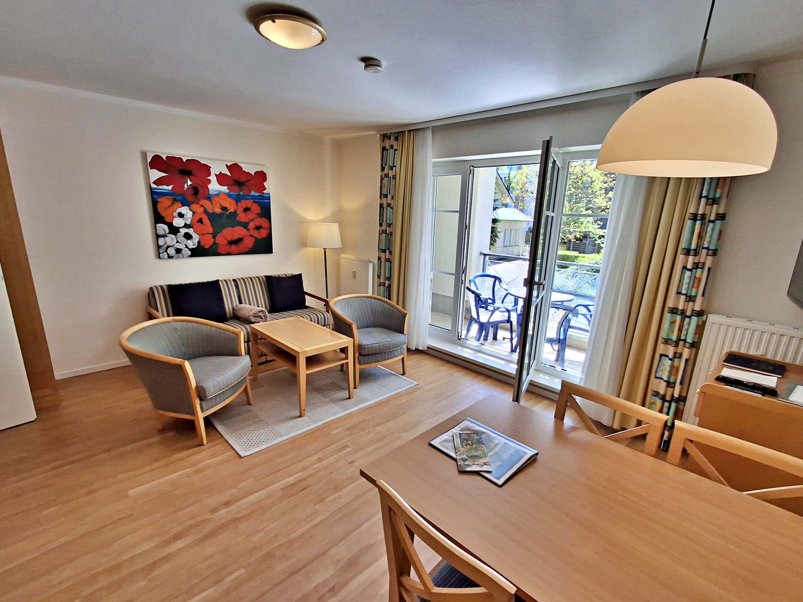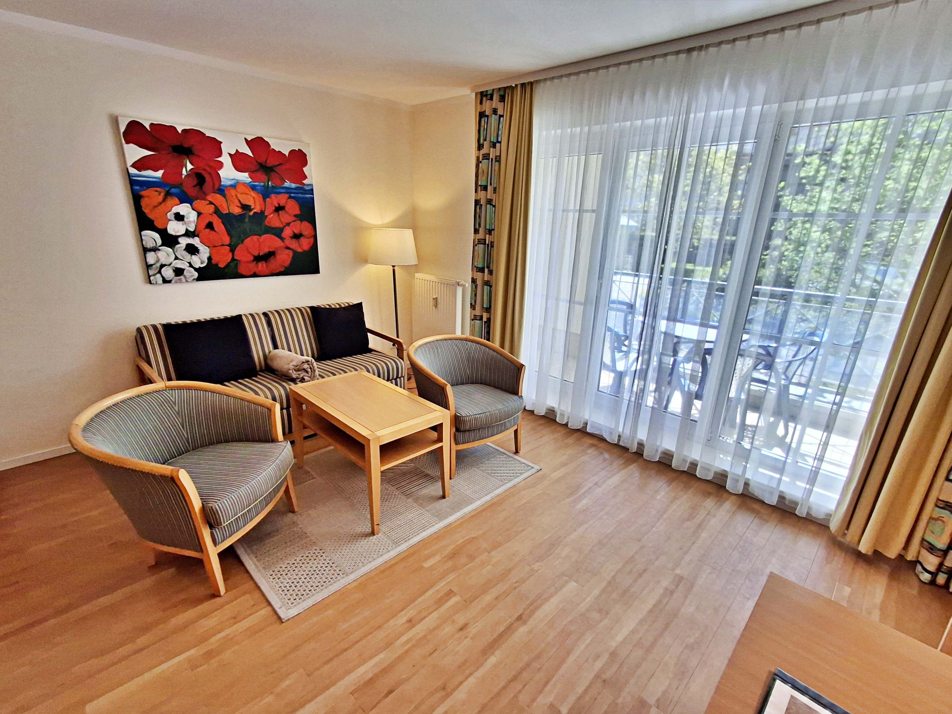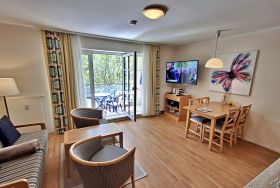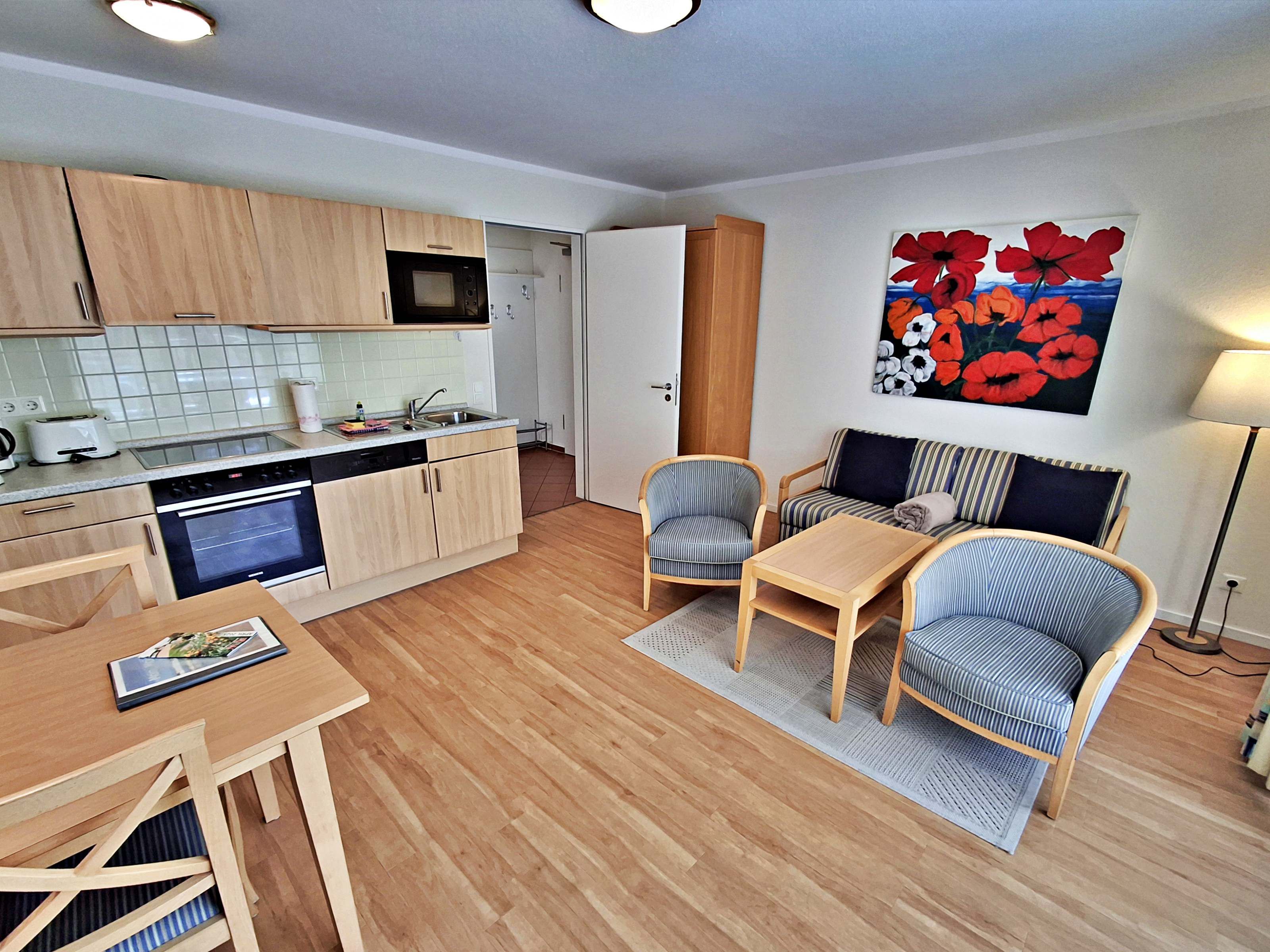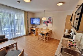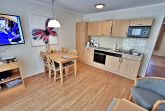 Die 47 qm große 2-Raum-Ferienwohnung befindet sich im 1. OG (mit Lift) der Appartementanlage und ist für bis zu vier Personen ausgestattet. Die Wohnung verfügt über ein Wohnzimmer mit einem gemütlichen Sofa (Schlafsofa), TV, Stereo-Anlage, Gratis W-LAN, eine vollständig ausgestattete Küche mit modernem Ceranherd mit Umluftbackofen, Mikrowelle, Kühlschrank mit Gefrierfach, Spülmaschine etc. Im Schlafzimmer befindet sich ein Doppelbett und ein zweiter Flachbild-TV. Das Tageslicht-Bad ist mit Dusche/WC, Haarfön sowie Kosmetikspiegel ausgestattet. Ein überdachter Balkon/Loggia mit Sitzgruppe lädt zum Sitzen und Verweilen ein.
