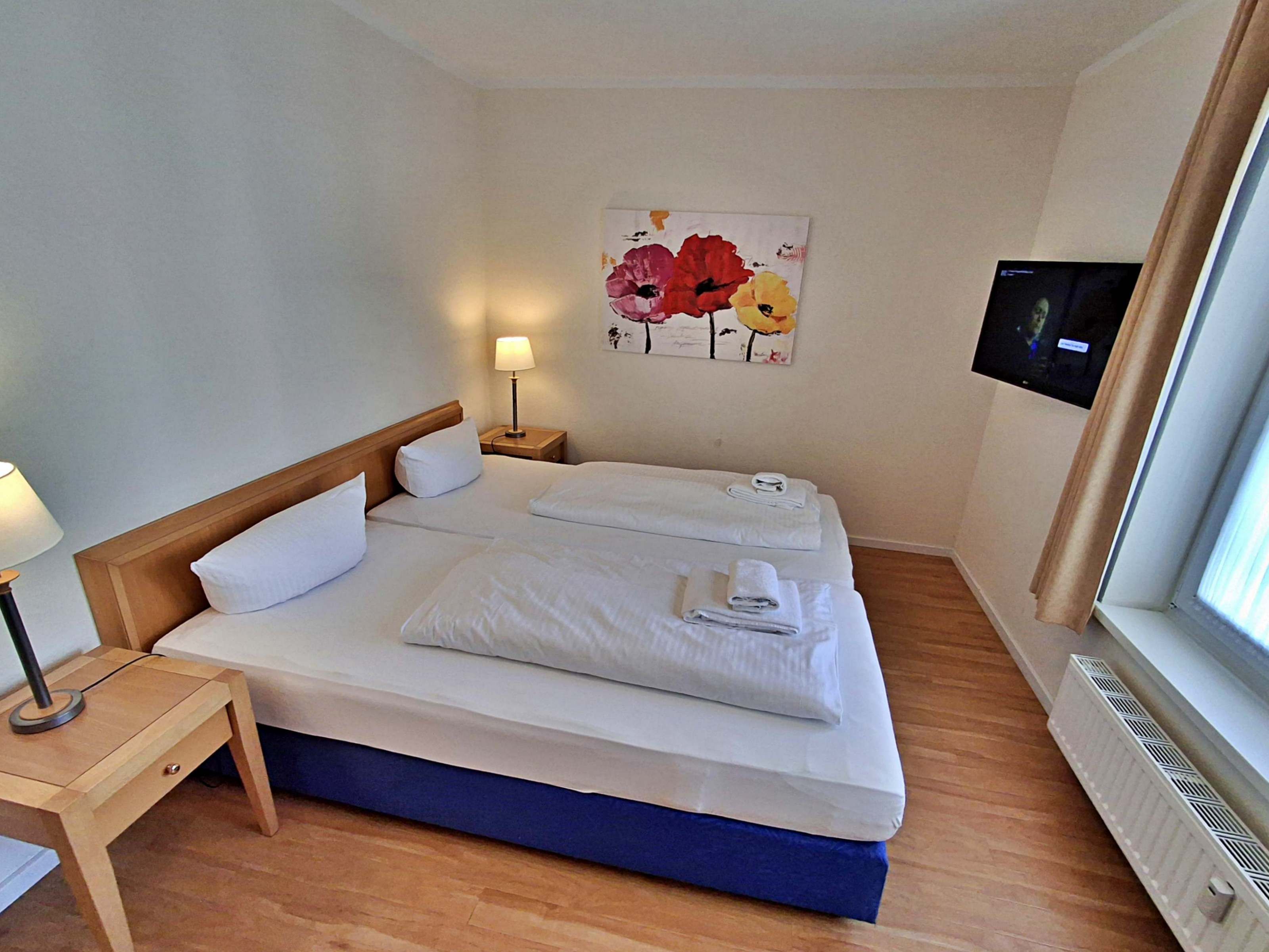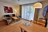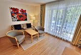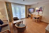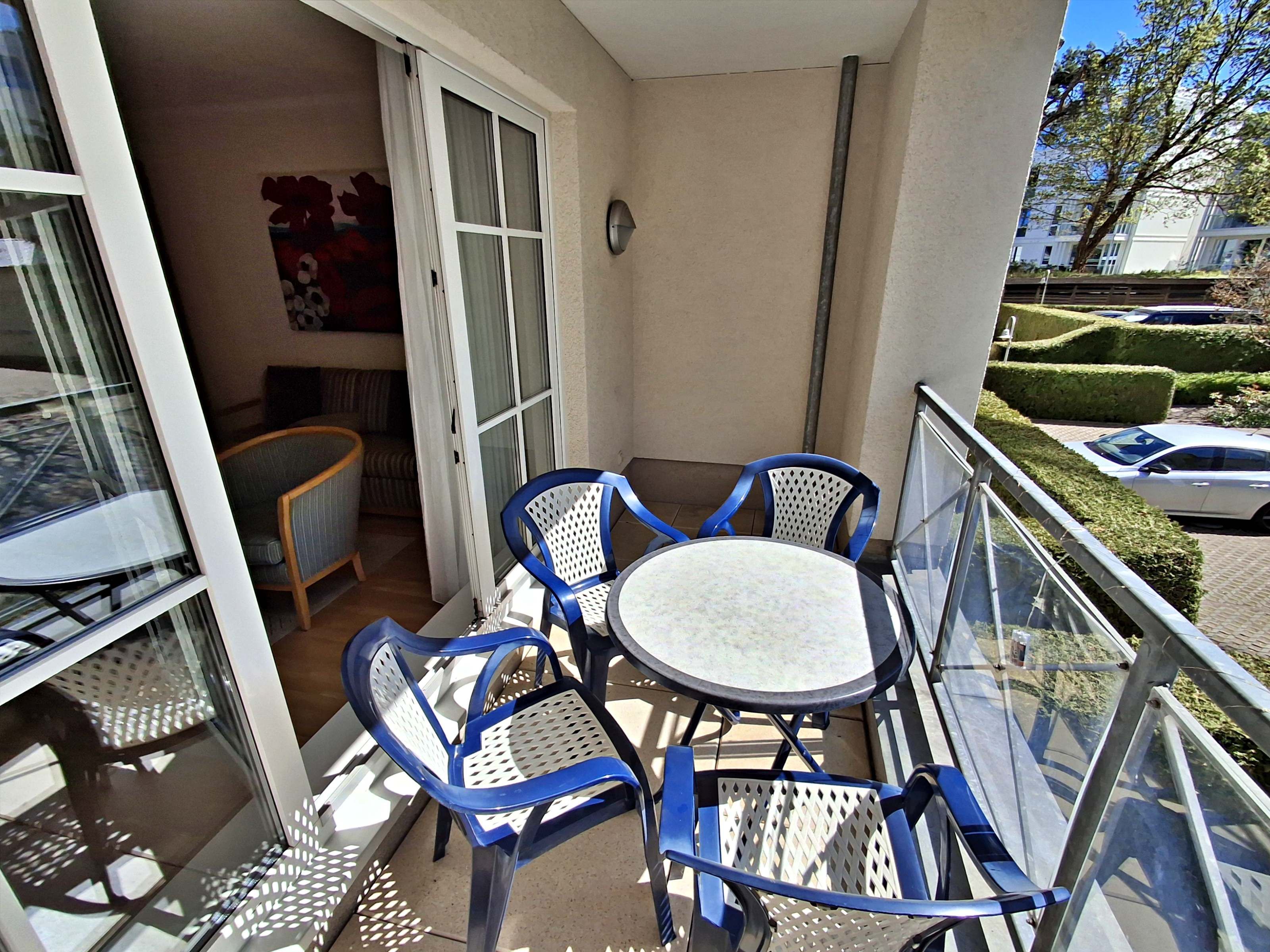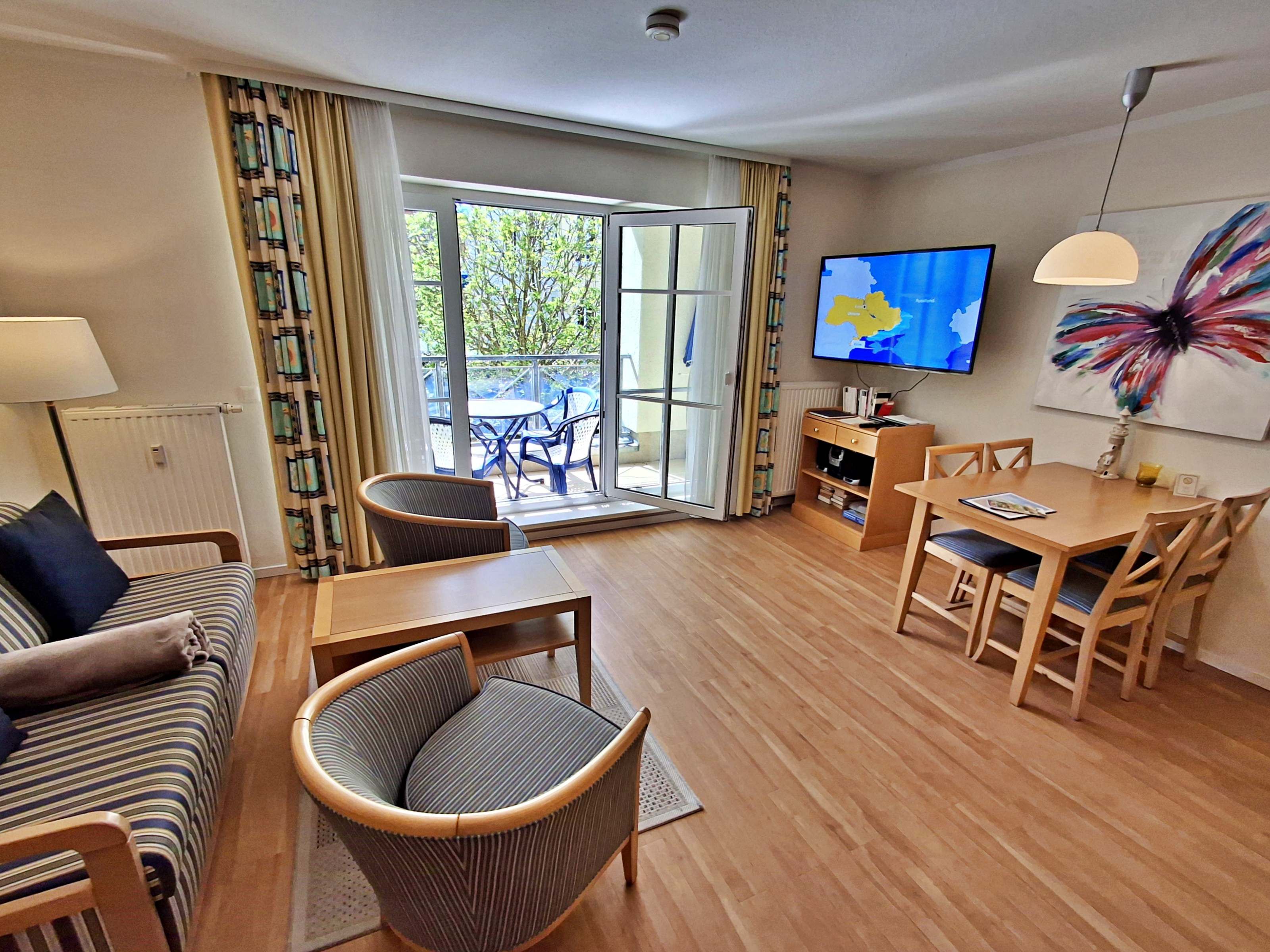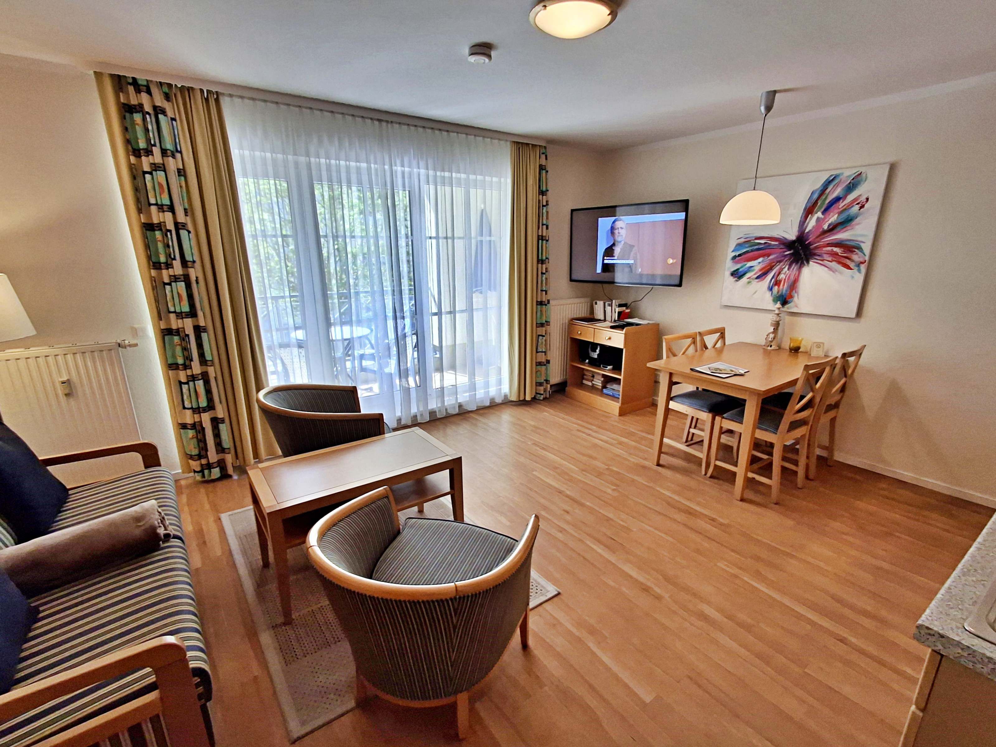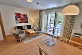 Die 47 qm große 2-Raum-Ferienwohnung befindet sich im 1. OG (mit Lift) der Appartementanlage und ist für bis zu vier Personen ausgestattet. Die Wohnung verfügt über ein Wohnzimmer mit einem gemütlichen Sofa (Schlafsofa), TV, Stereo-Anlage, Gratis W-LAN, eine vollständig ausgestattete Küche mit modernem Ceranherd mit Umluftbackofen, Mikrowelle, Kühlschrank mit Gefrierfach, Spülmaschine etc. Im Schlafzimmer befindet sich ein Doppelbett und ein zweiter Flachbild-TV. Das Tageslicht-Bad ist mit Dusche/WC, Haarfön sowie Kosmetikspiegel ausgestattet. Ein überdachter Balkon/Loggia mit Sitzgruppe lädt zum Sitzen und Verweilen ein.