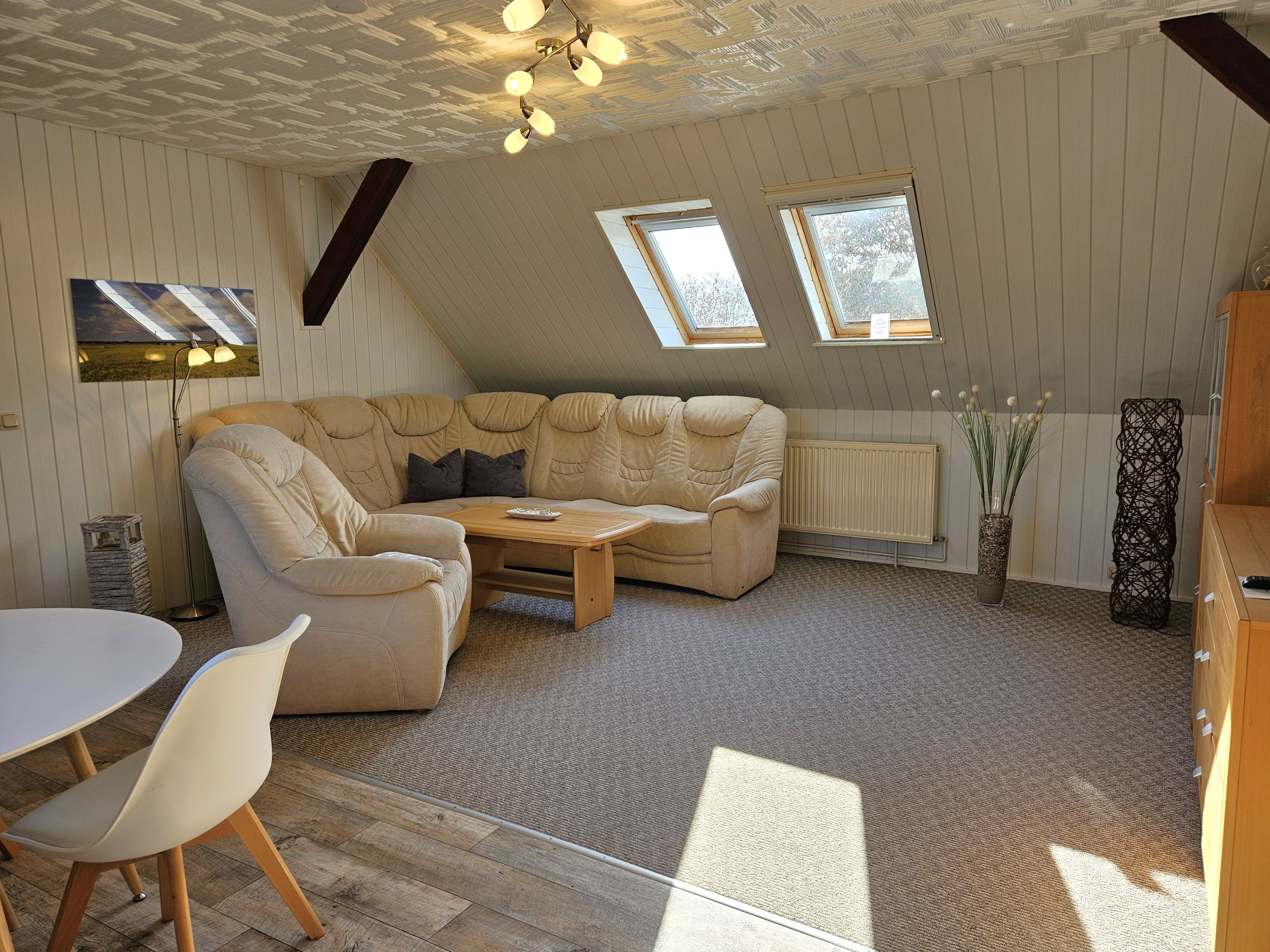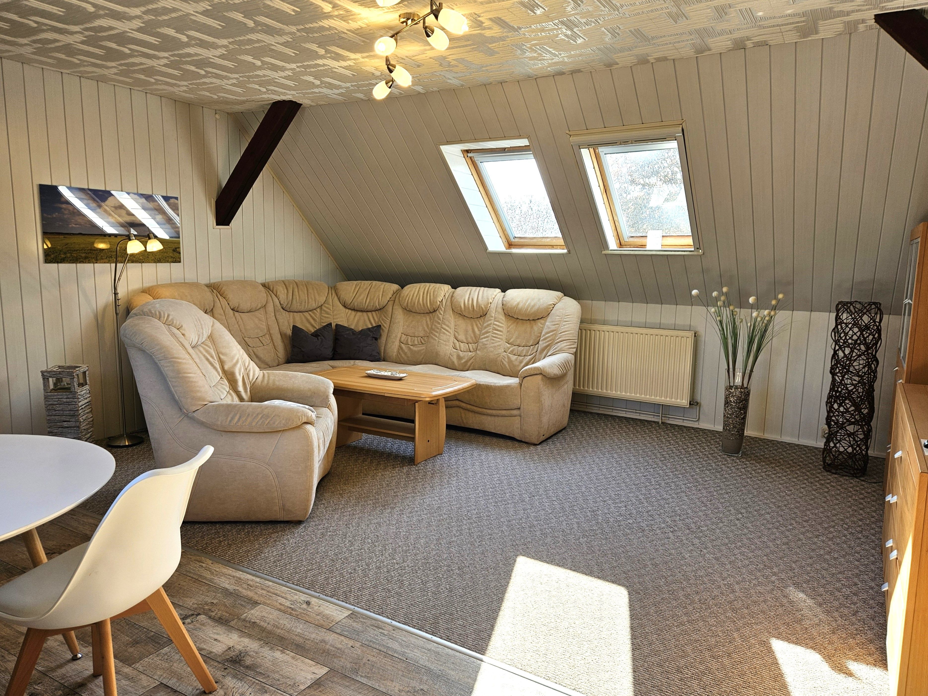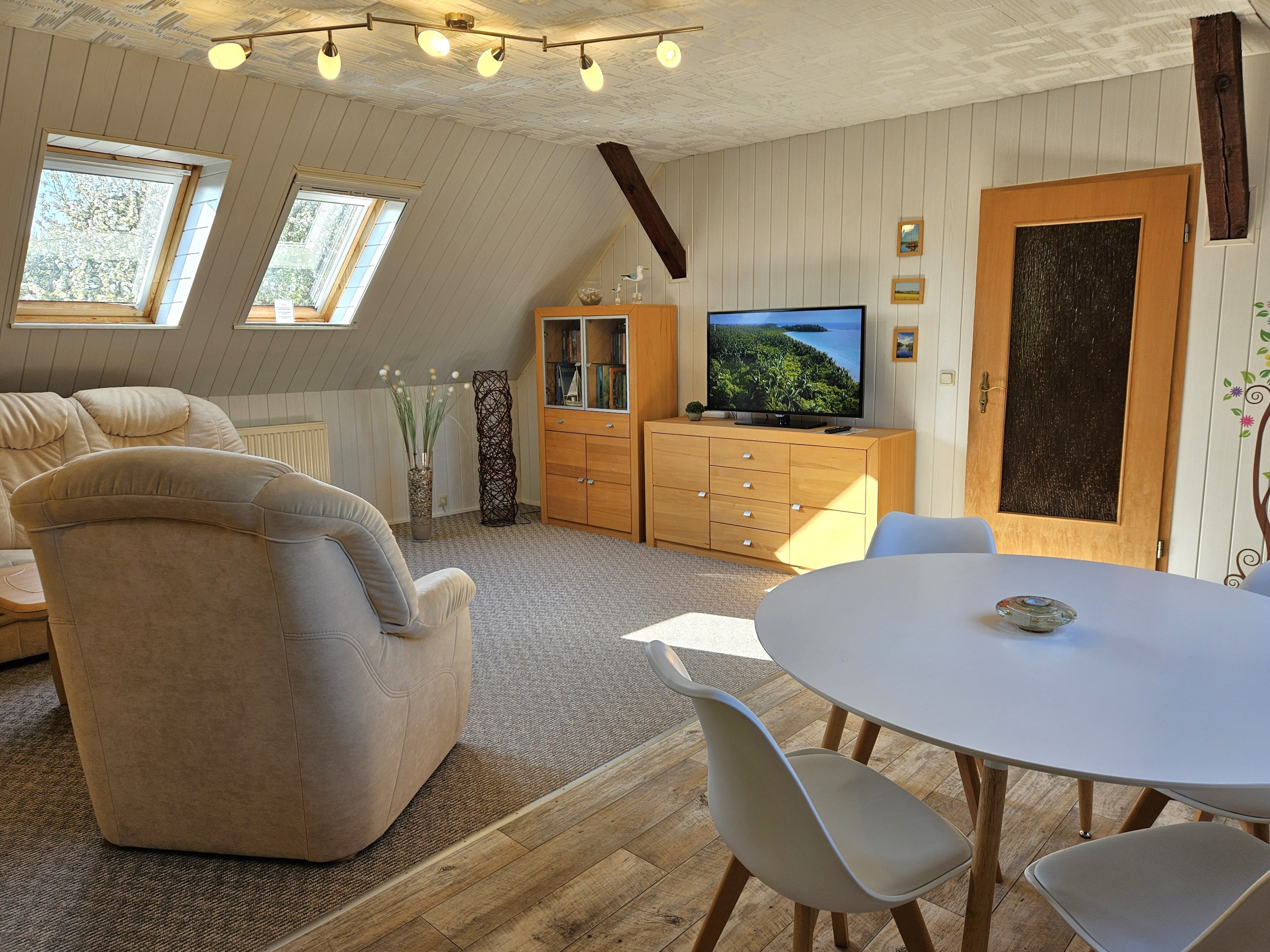 Unsere Ferienwohnung, befindet sich im Dachgeschoss eines 100 Jahre alten Bauernhauses und bietet Platz für bis zu 5 Personen.