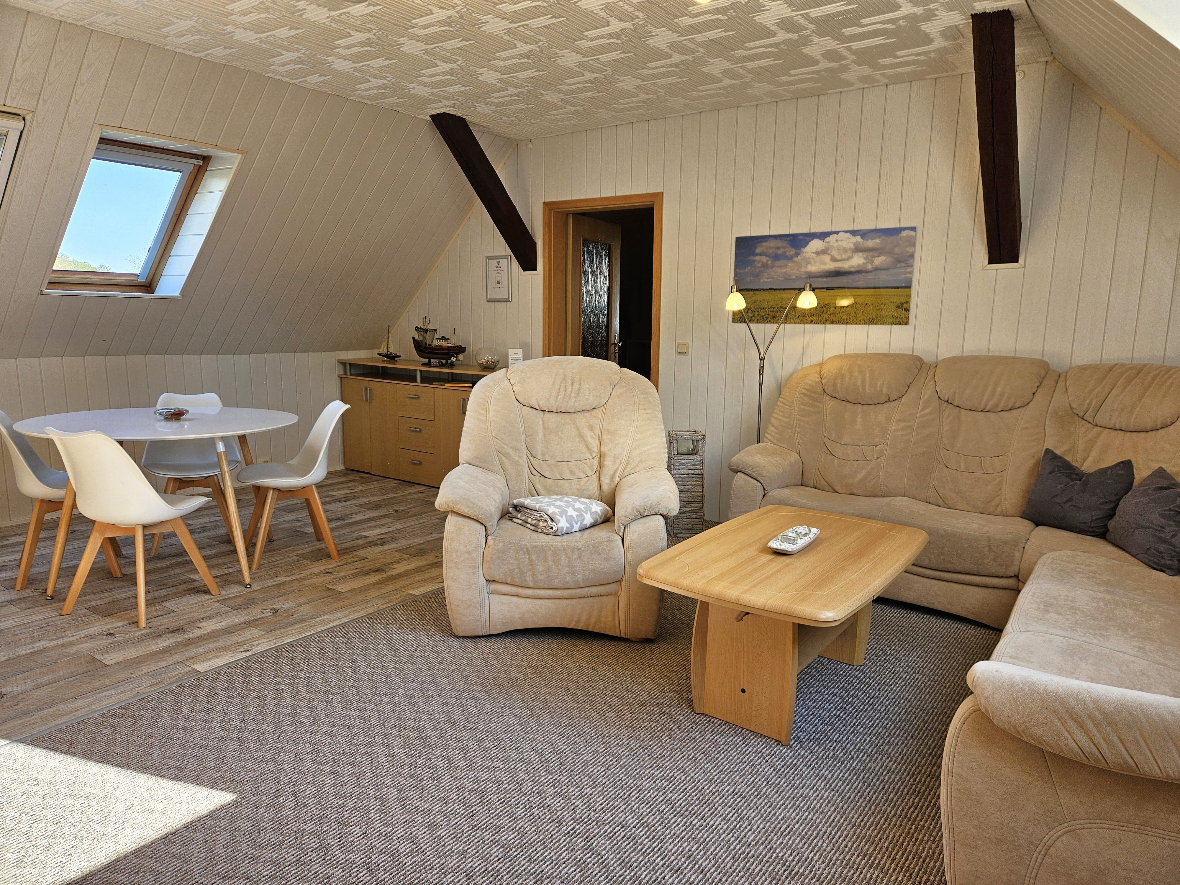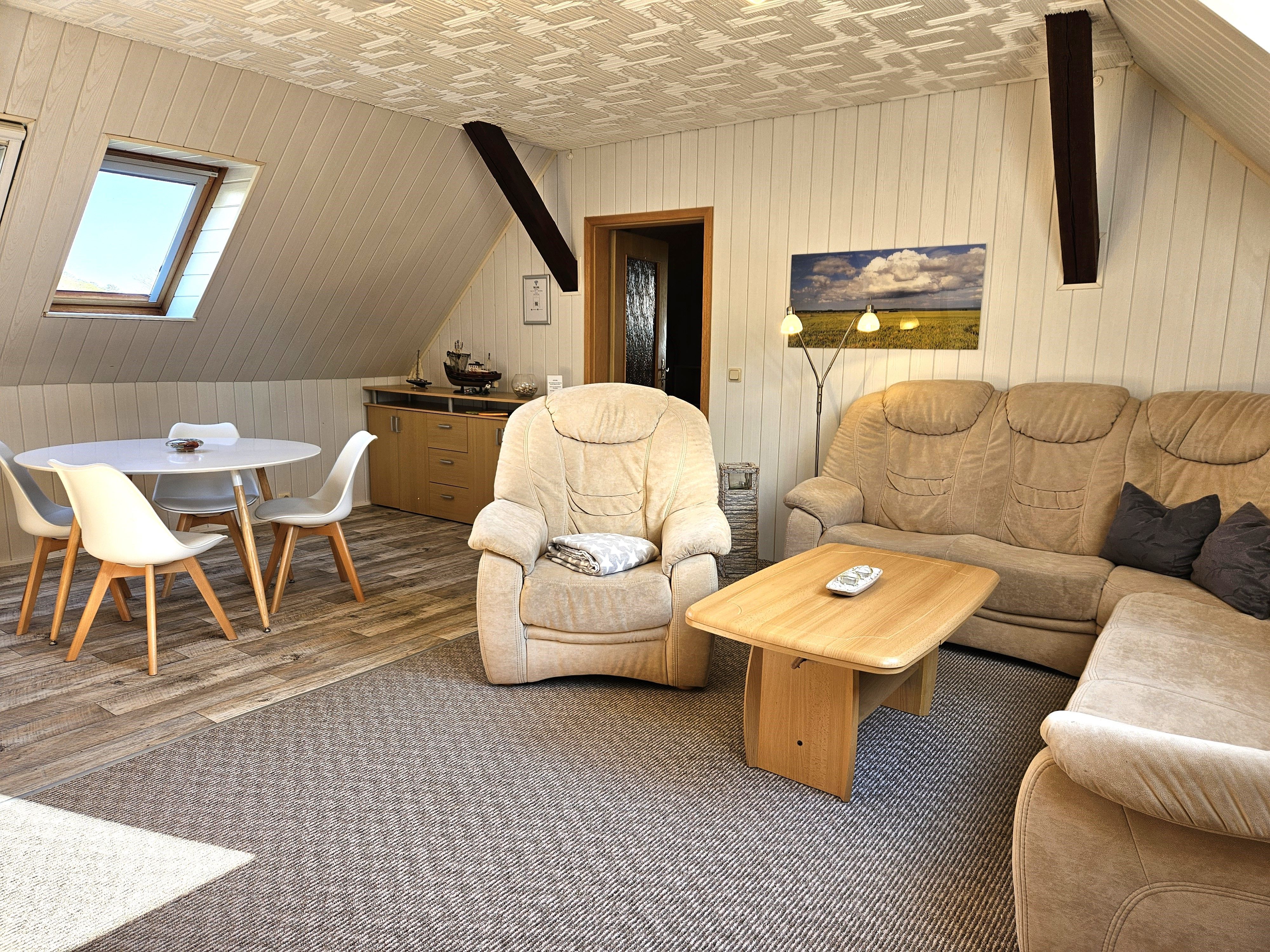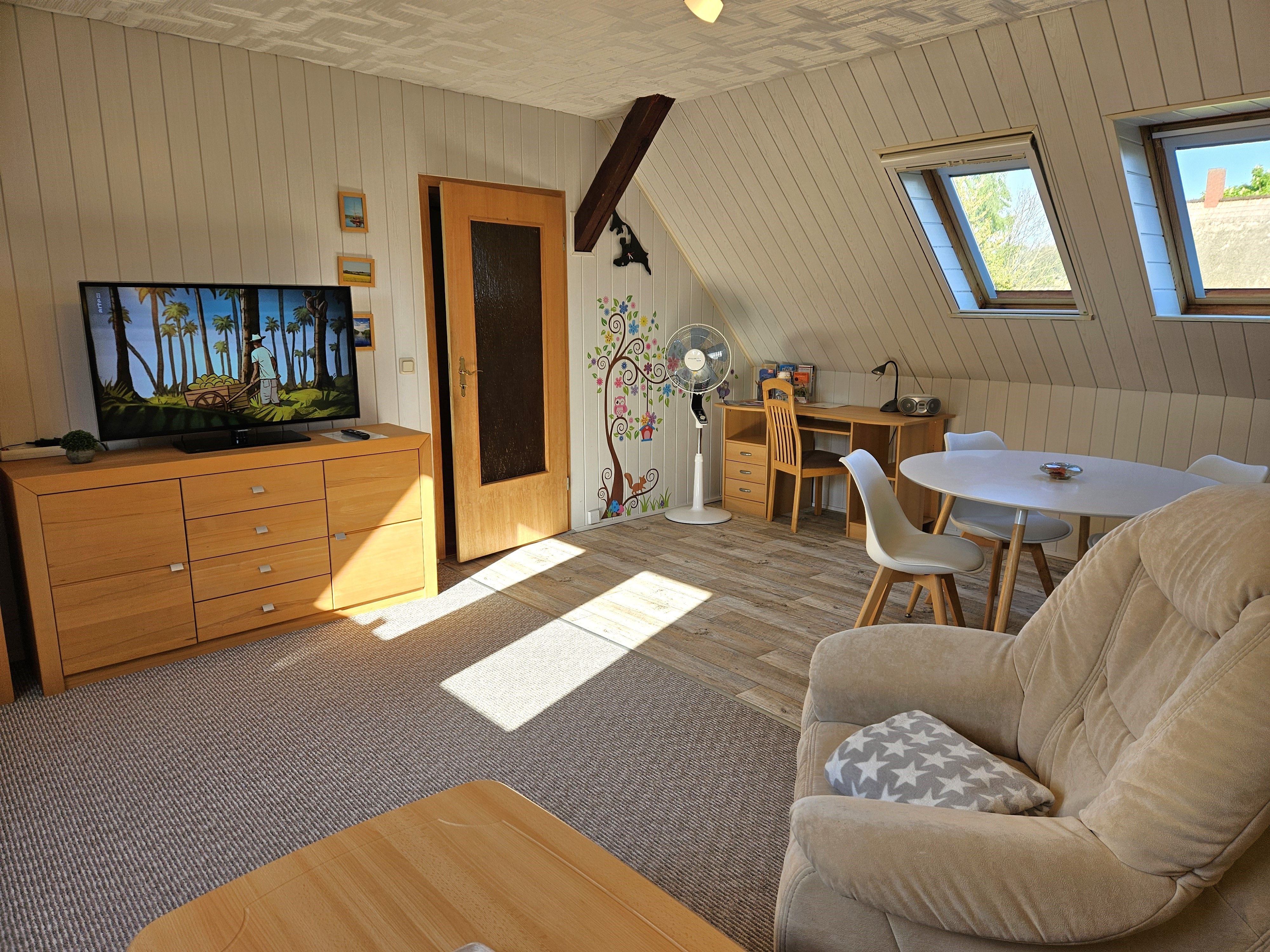 Unsere Ferienwohnung, befindet sich im Dachgeschoss eines 100 Jahre alten Bauernhauses und bietet Platz für bis zu 5 Personen.