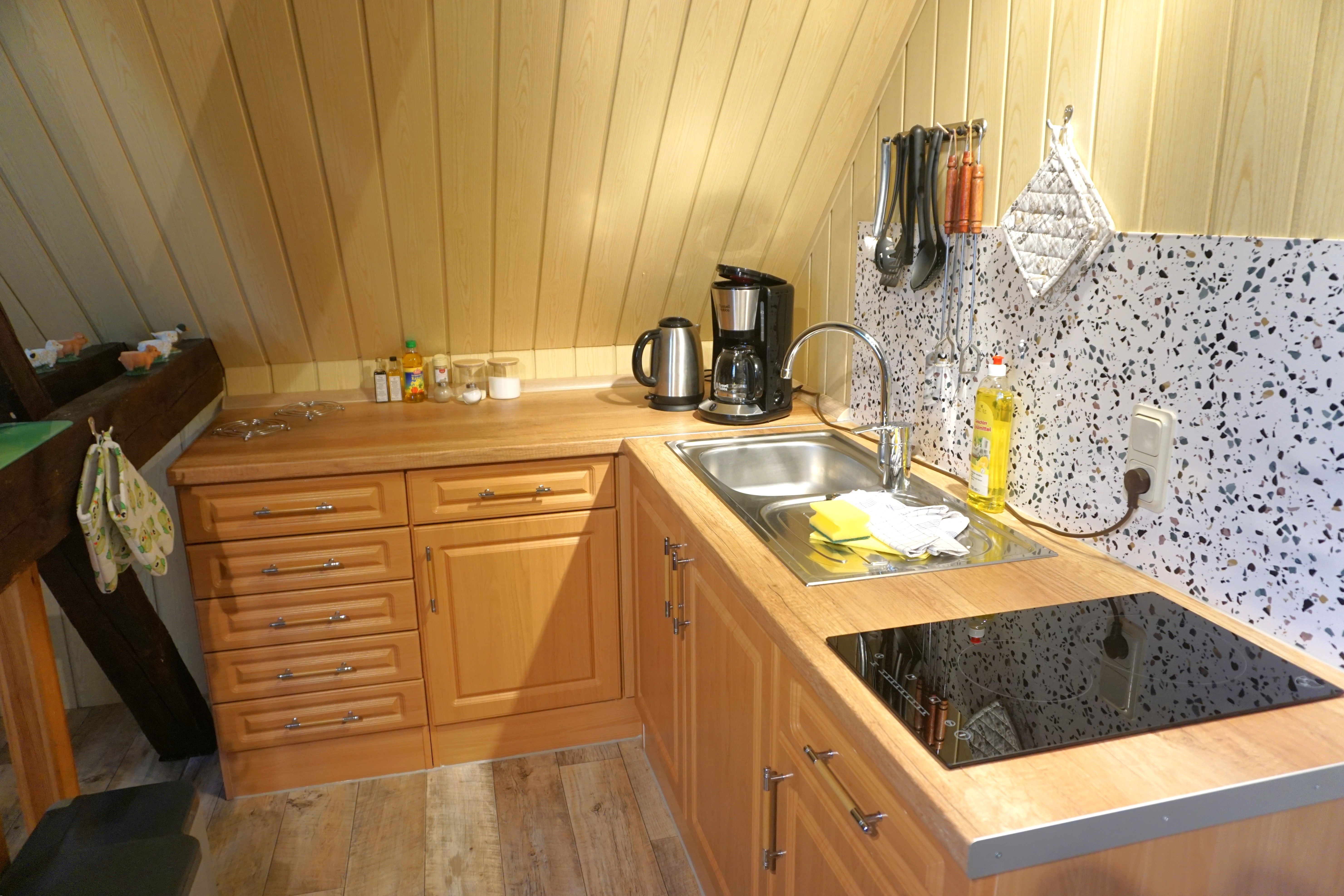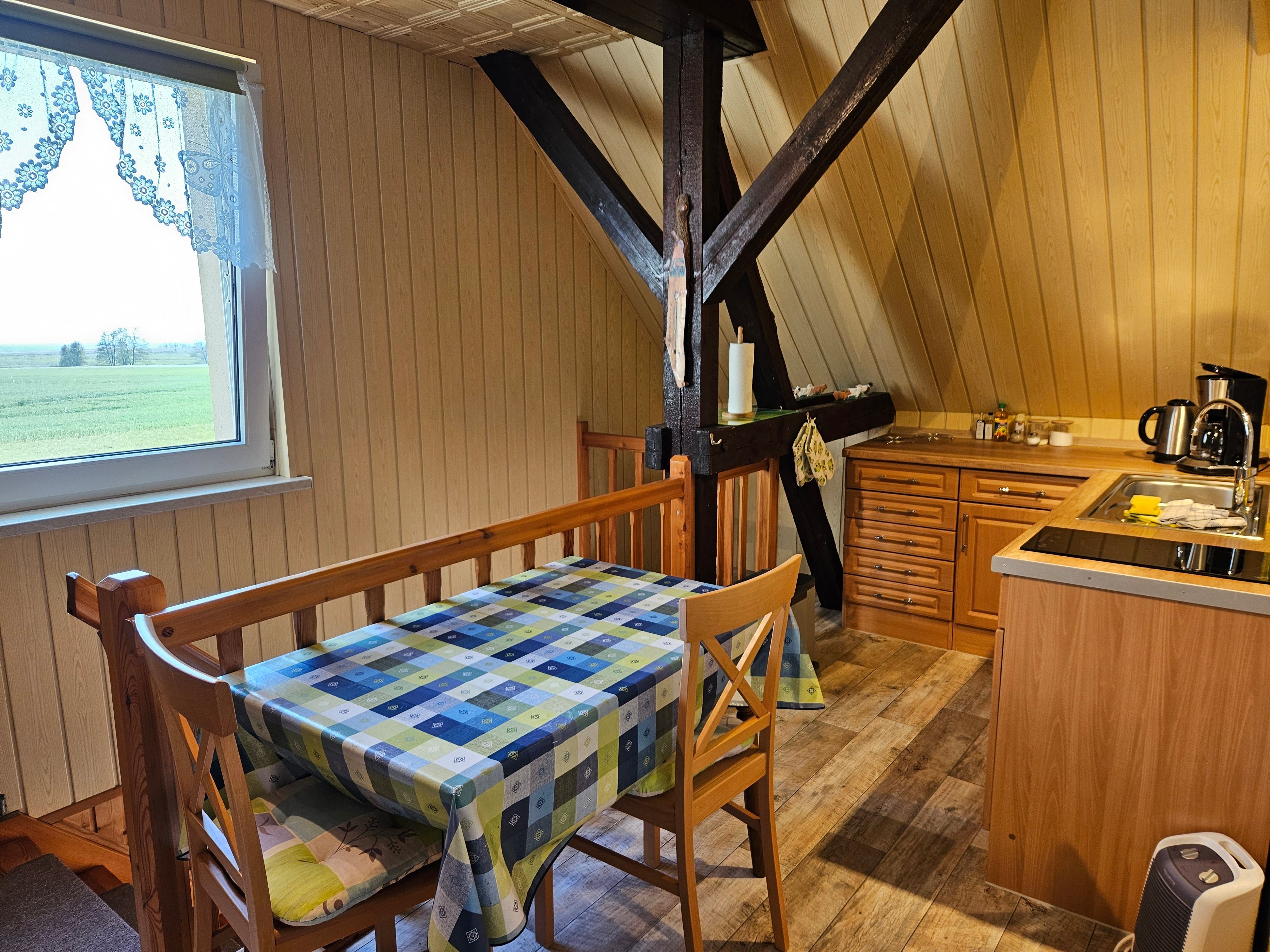 Die Küche mit herrlichem Blick auf das Stettiner Haff, verfügt über eine kleine Küchenzeile mit einem Doppel-Cerankochfeld, einer Mikrowelle mit Backofenfunktion und einem großen Kühlschrank mit Gefrierfach.
