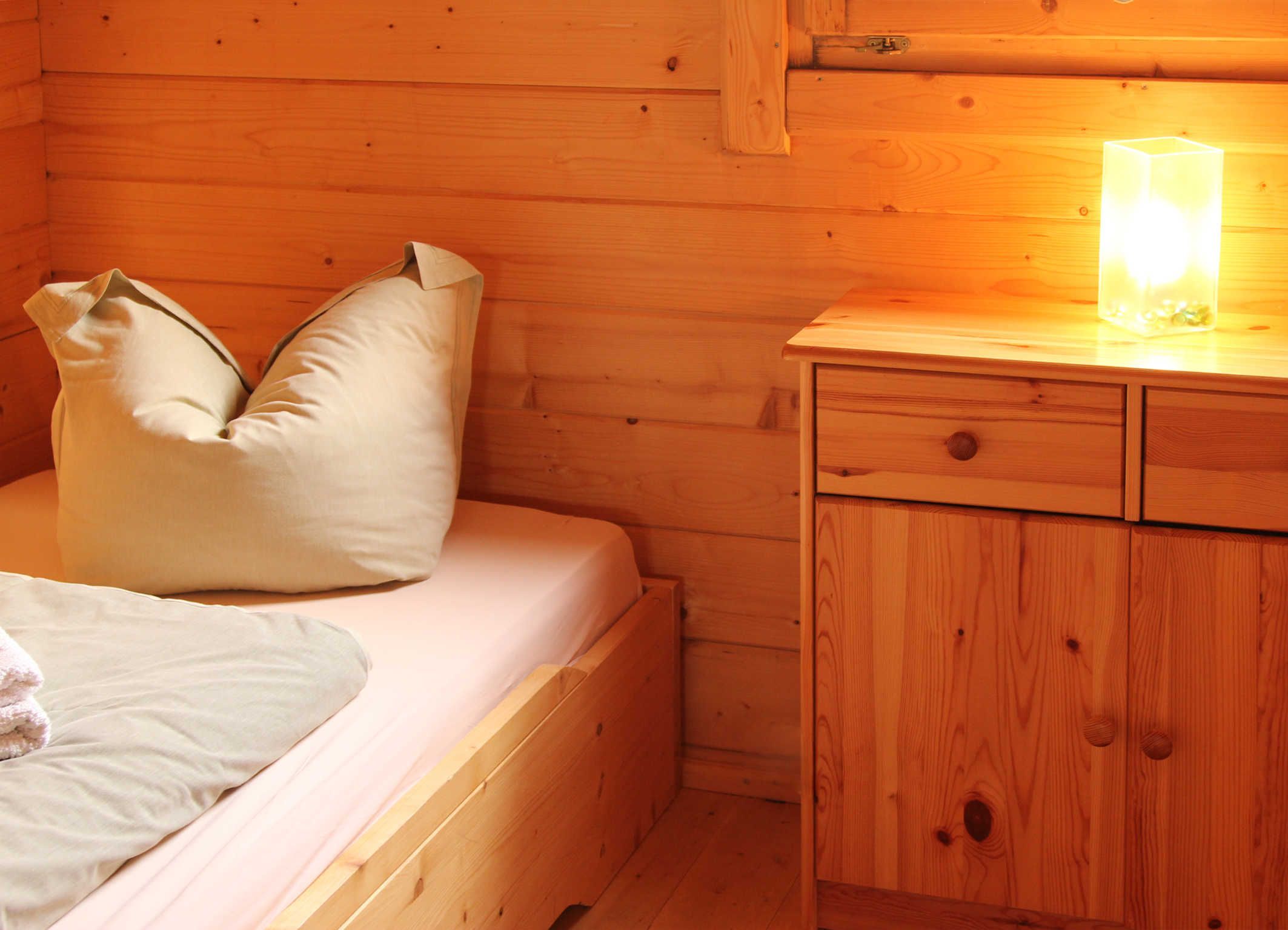 2 Schlafzimmer im EG und ein Schlafboden mit 2 Einzelbetten (über steile Treppe - oben keine Stehhöhe!) bieten gute Ruhemöglichkeiten.