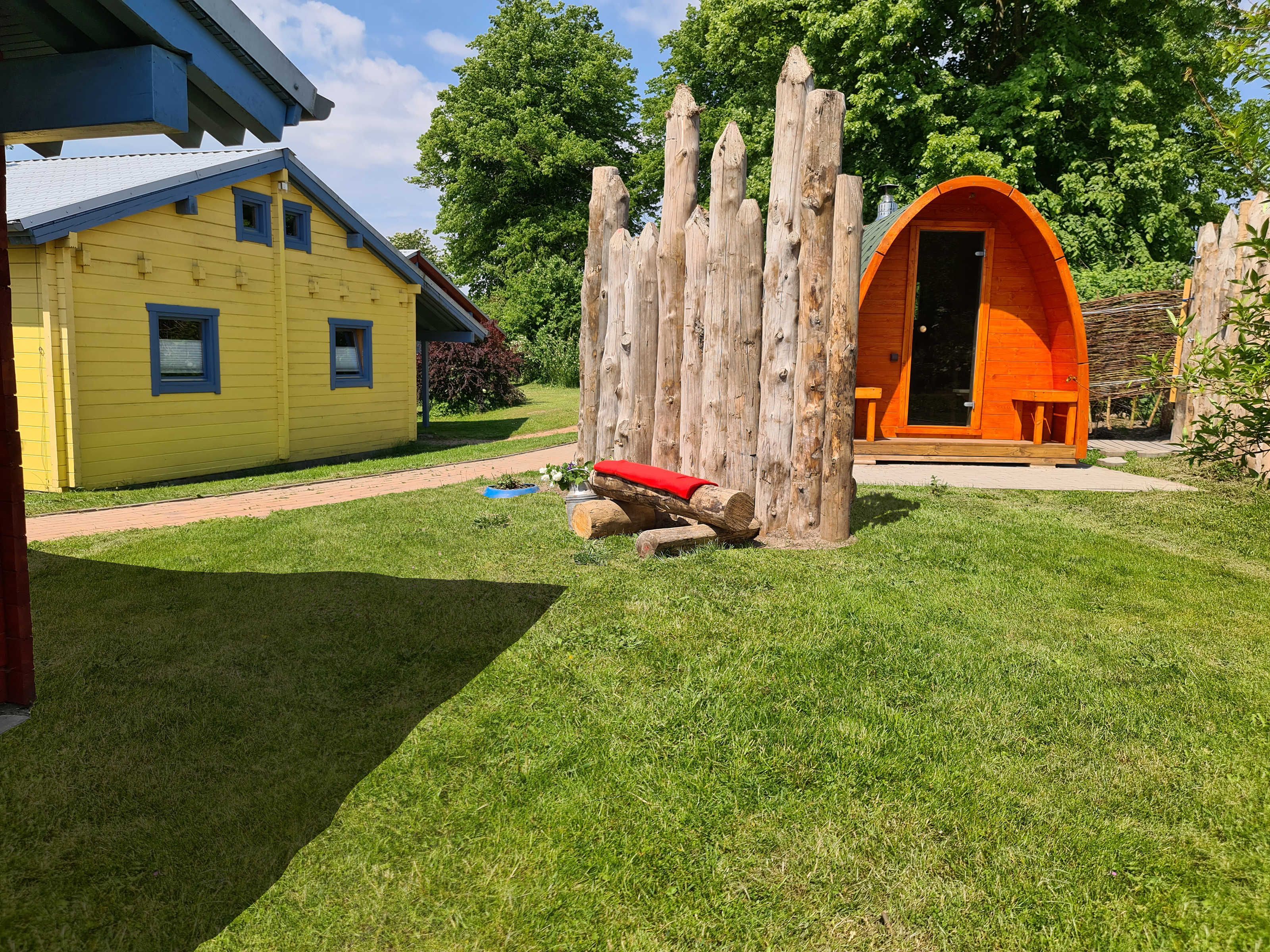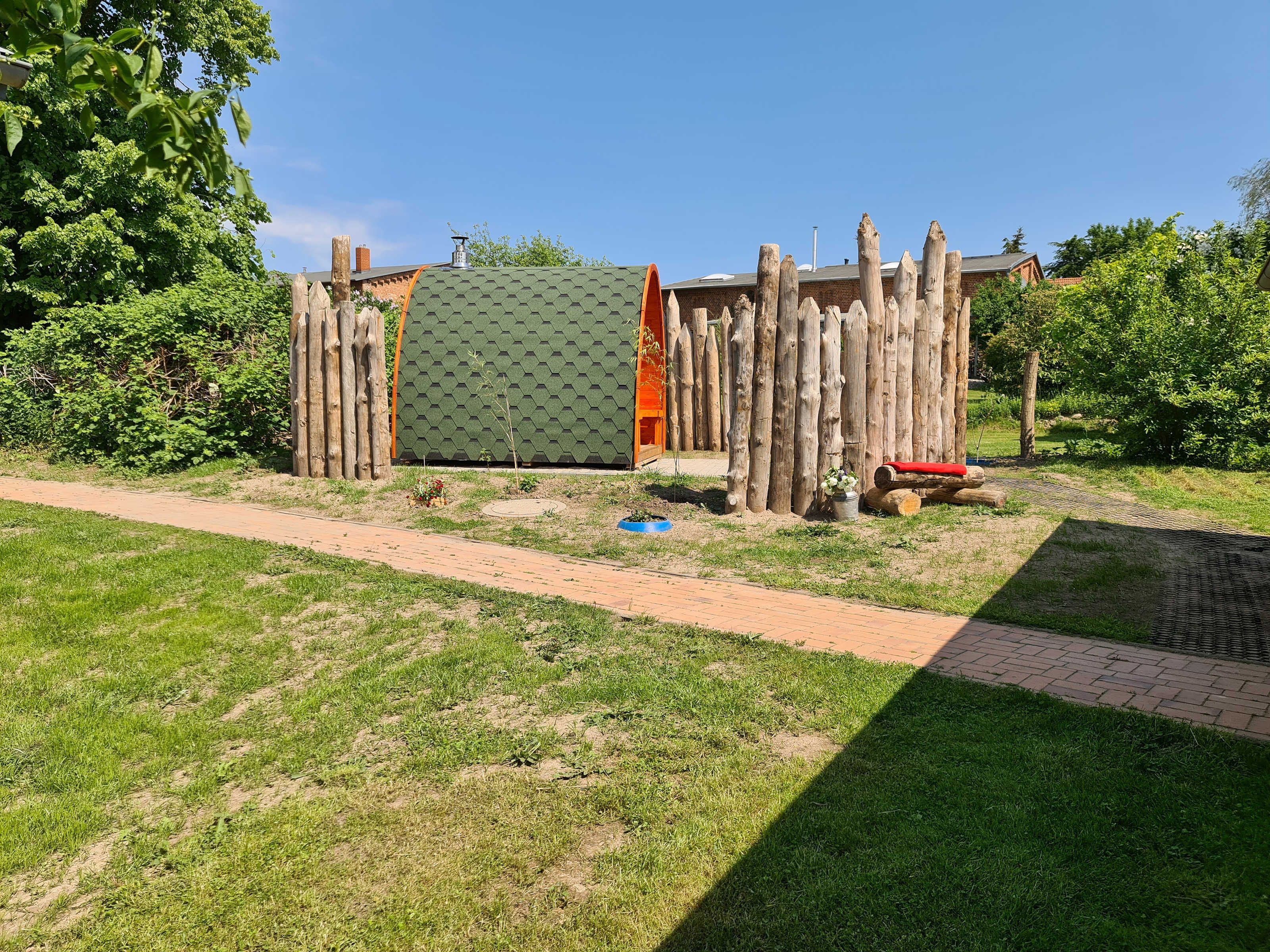 Die Podsauna ist 2021 neu aufgestellt worden. Sie wird mit Holz befeuert. Daneben befindet sich eine kalte Dusche.