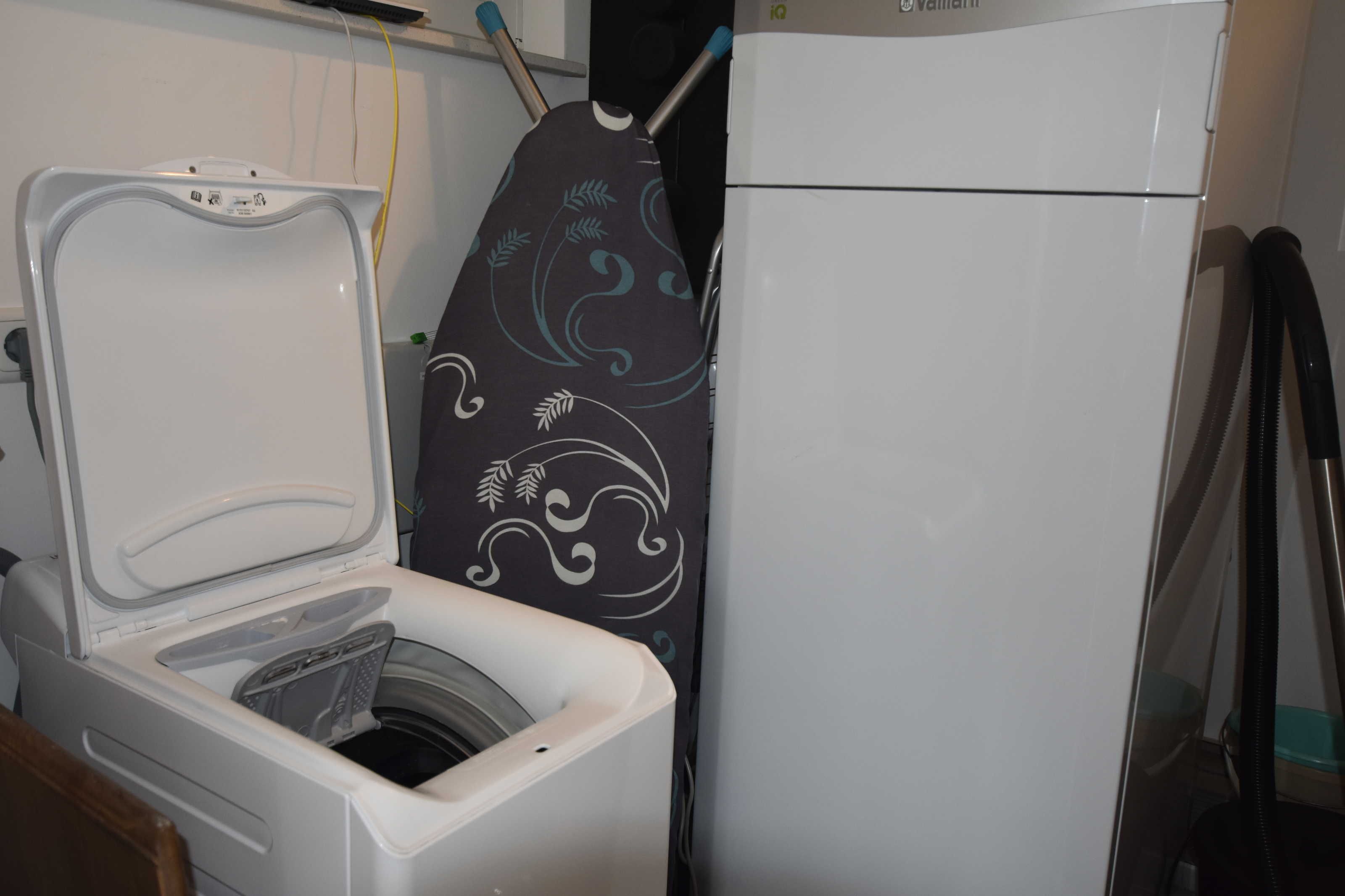 Hauswirtschaftsräume mit Waschmachine und Wäscheständer.