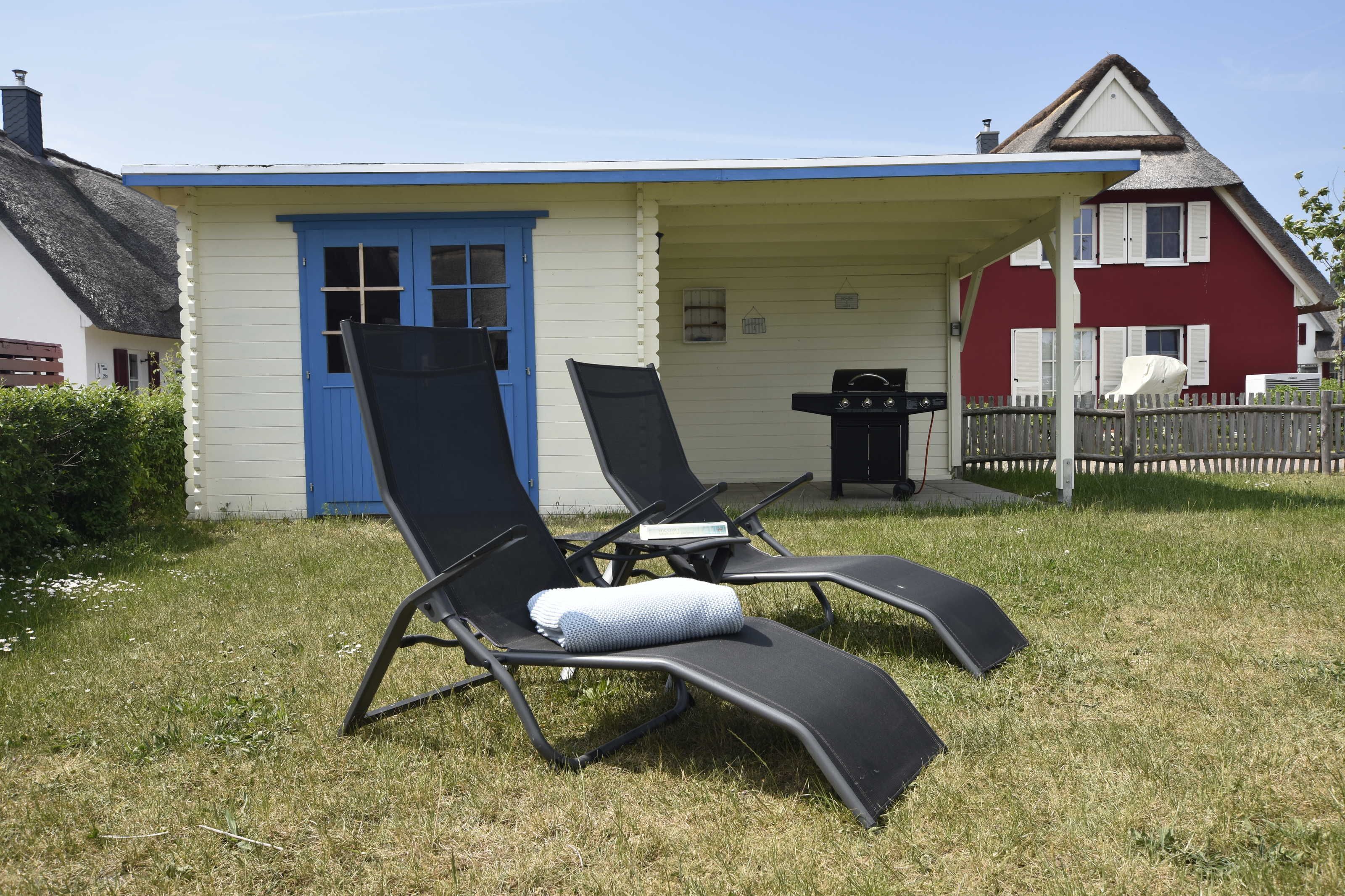 2 Terrassen mit Gartenmöbel, Sonnenschirmen und angrenzenden Garten. Für das BBQ steht ein Gasgrill zur Verfügung.
