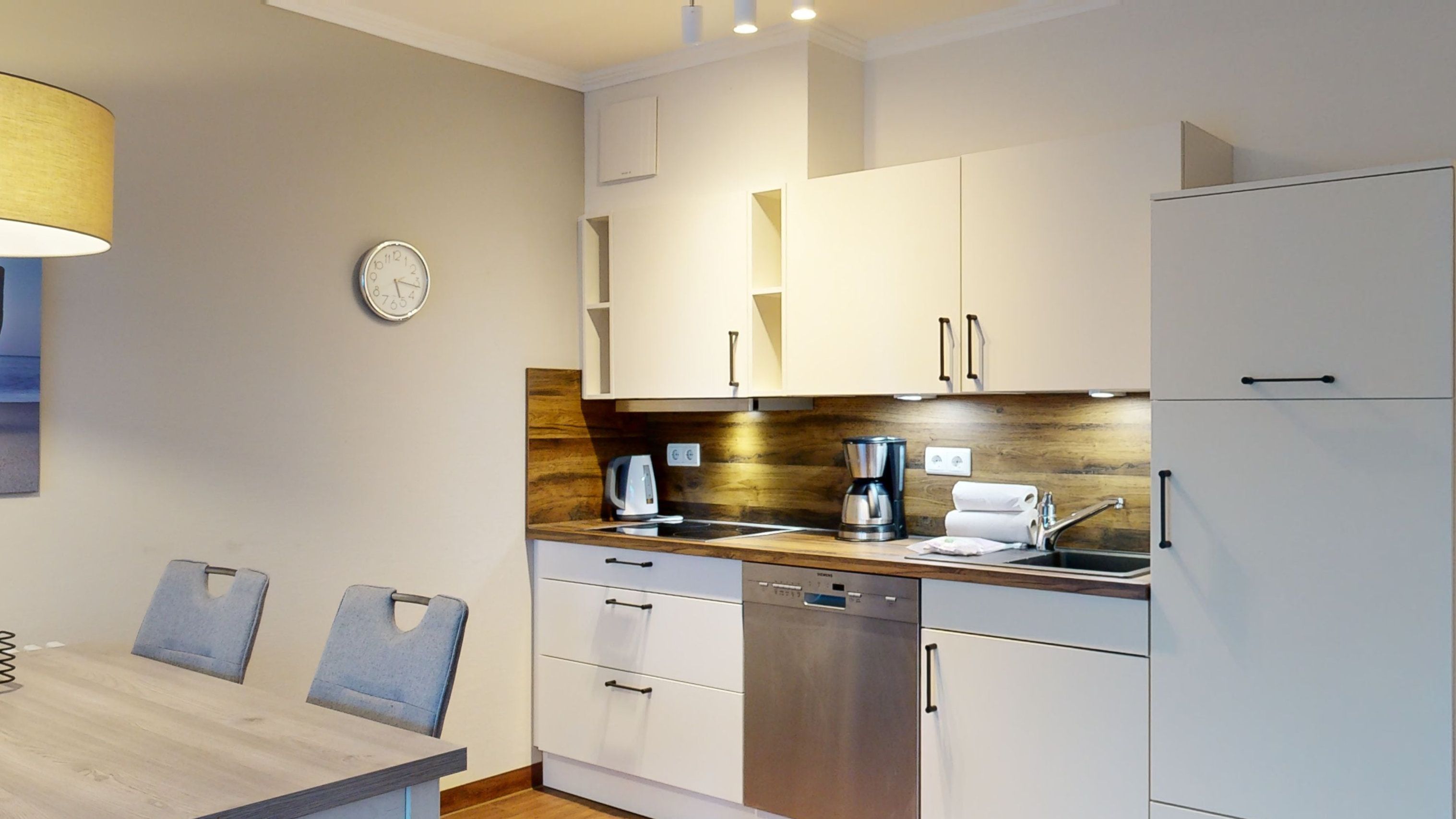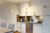 Küche: Moderne Küchenzeile, Ceran-Herd, Mikrowelle mit Back- und Grillfunktion, Spülmaschine, Kühlschrank mit Gefrierfach, Kaffeemaschine, Toaster, Wasserkocher
