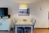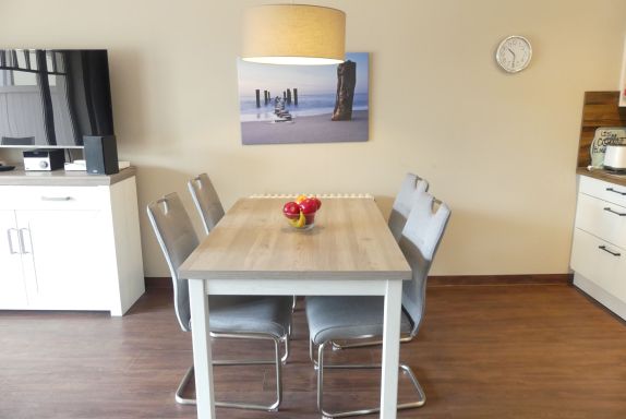 Wohnzimmer: Große Couch (Eck-Schlafcouch für 1 Erwachsenen oder max. 2 Kinder), 2 Sessel, Sat-TV mit gr. Bildschirm, WLAN-Internetanschluss, großer Essplatz mit 4 Stühlen