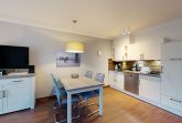 Ausstattung der großzügigen Komfort-Ferienwohnung im Erdgeschoss (2 Zimmer / 61 m², Haus Nr. 3) mit großer Terrasse: