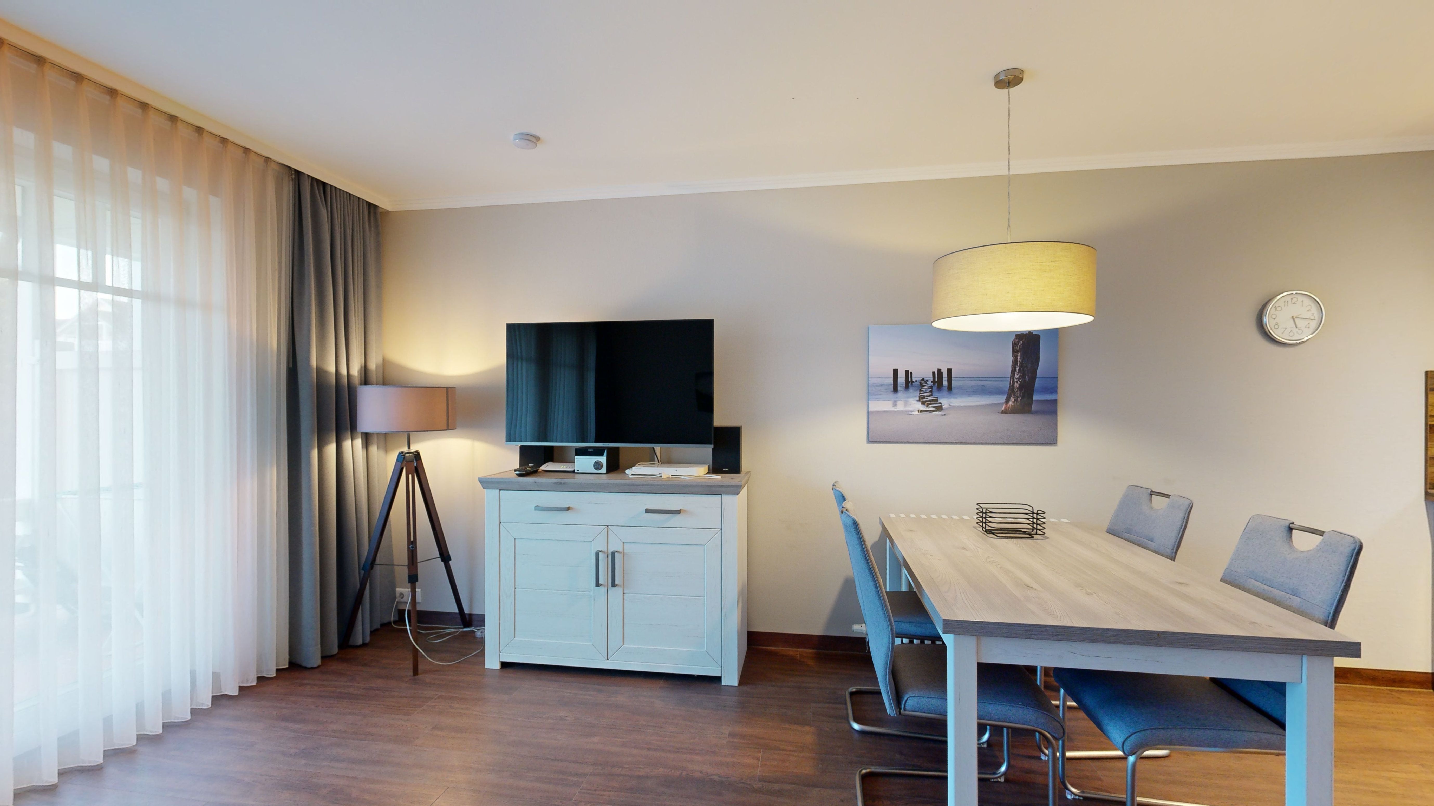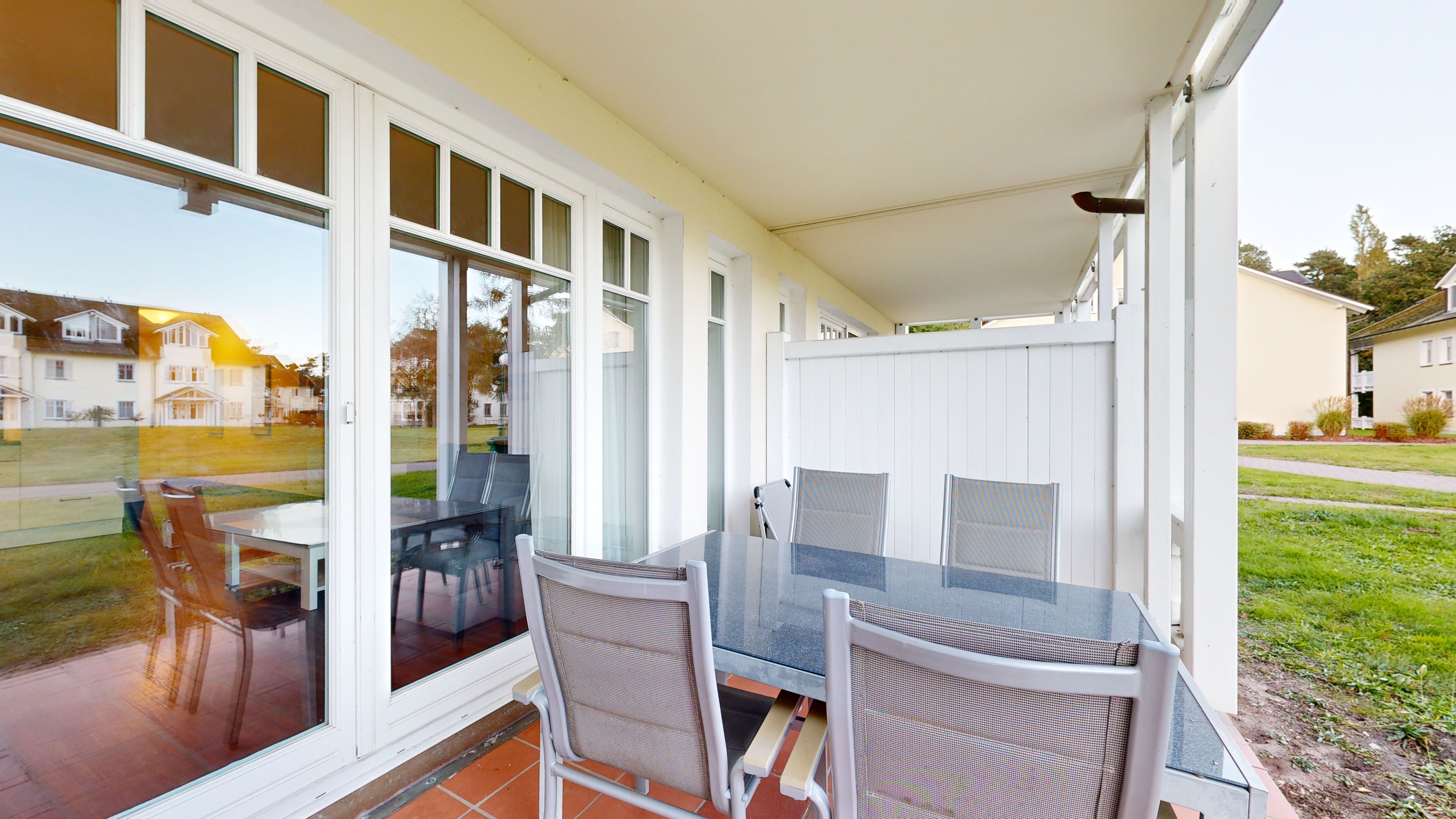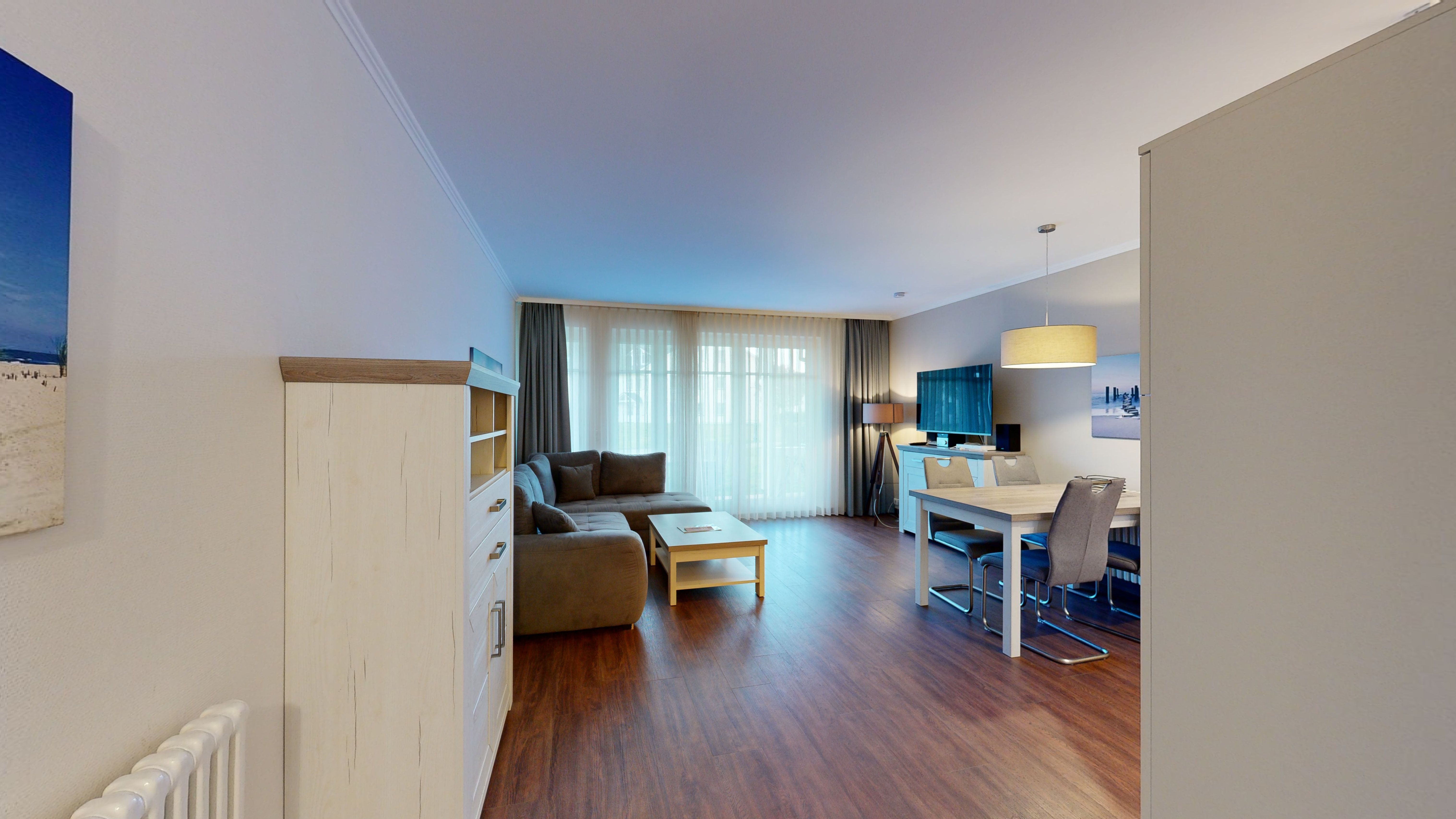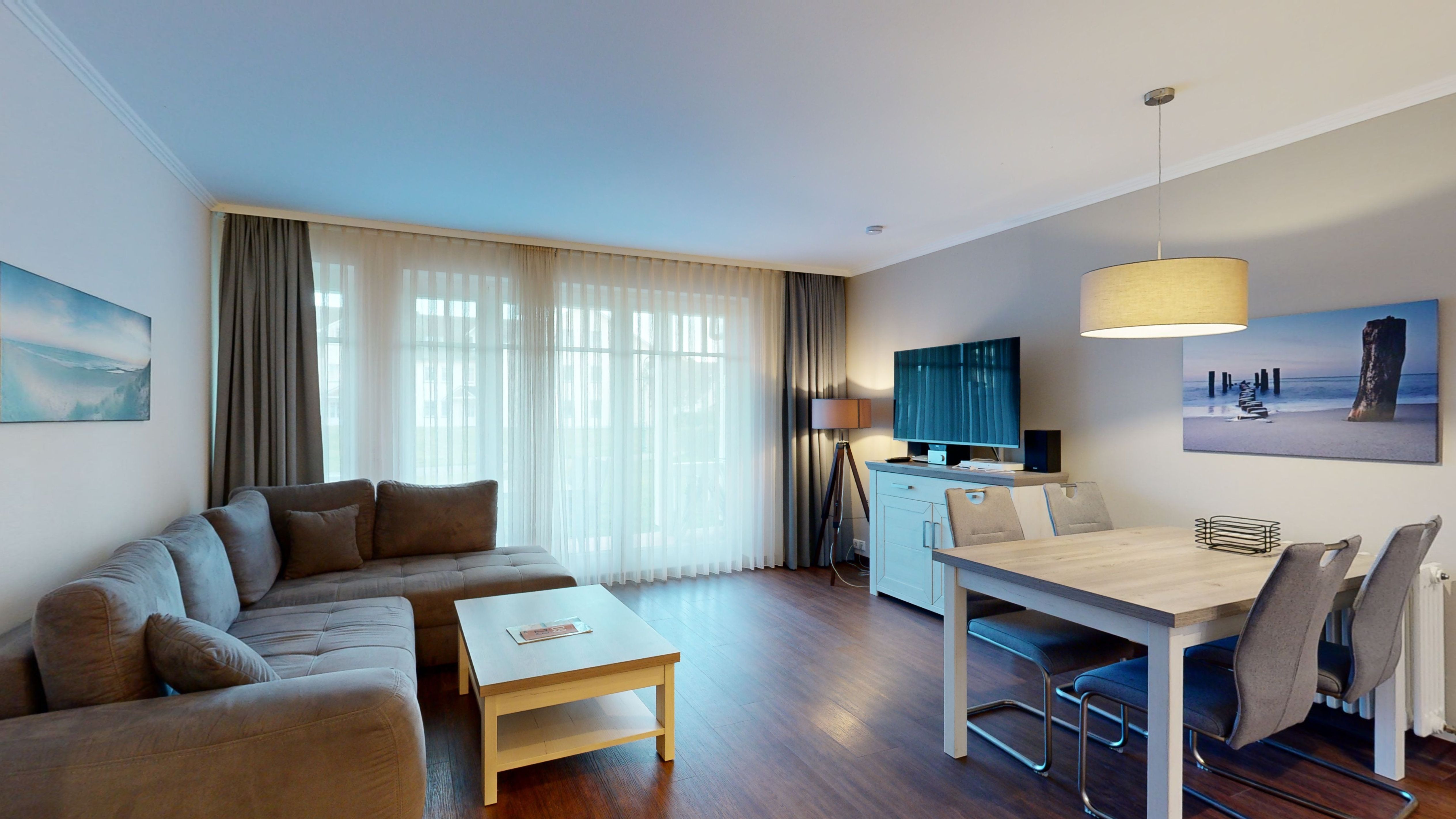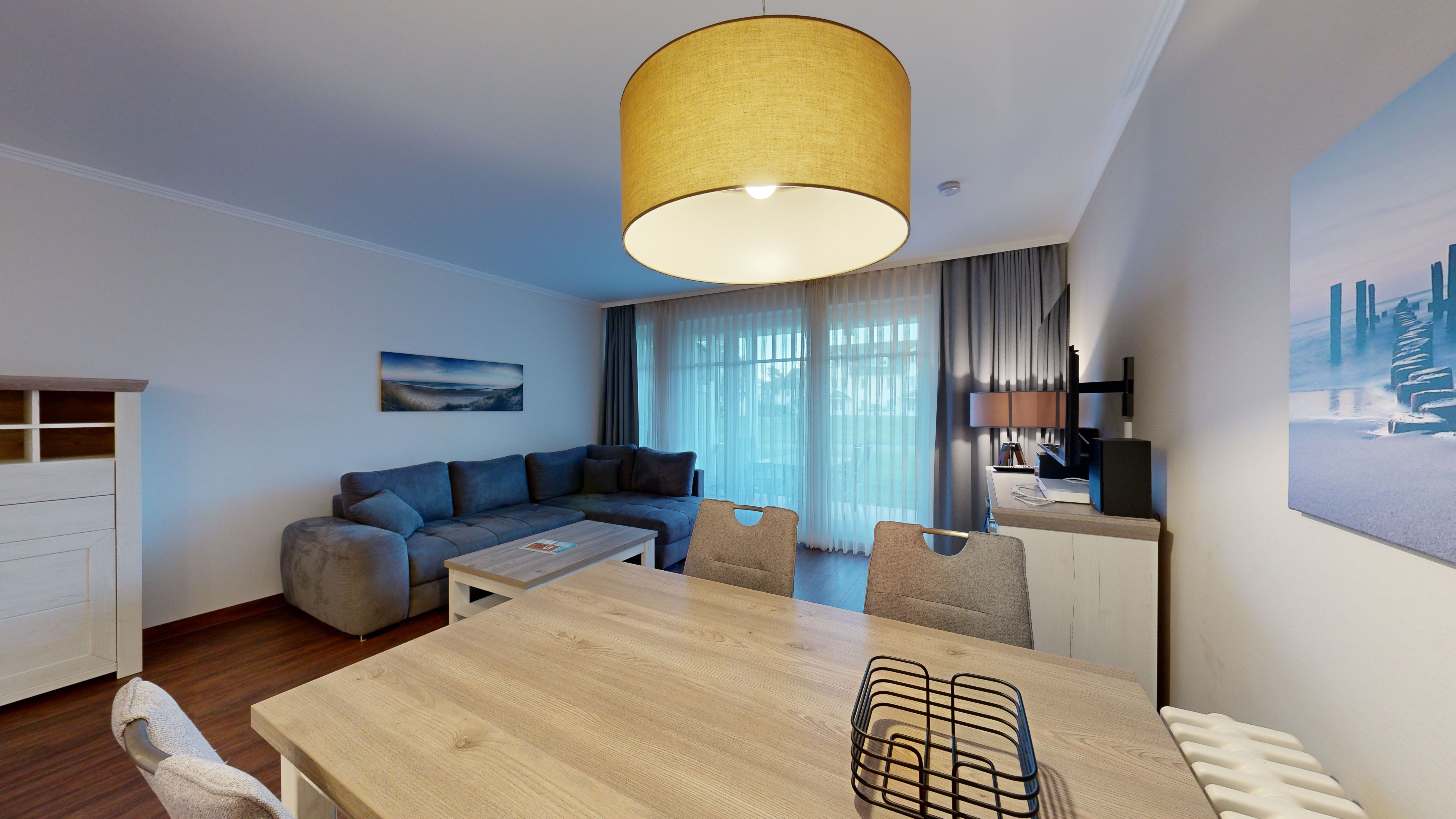 Im Dünenpark Binz befindet sich im Haus 2 die großzügige Komfort-Ferienwohnung im Erdgeschoss (2 Zimmer / 61 m²) mit 1 Schlafzimmer, einer Schlafcouch und mit großer Terrasse