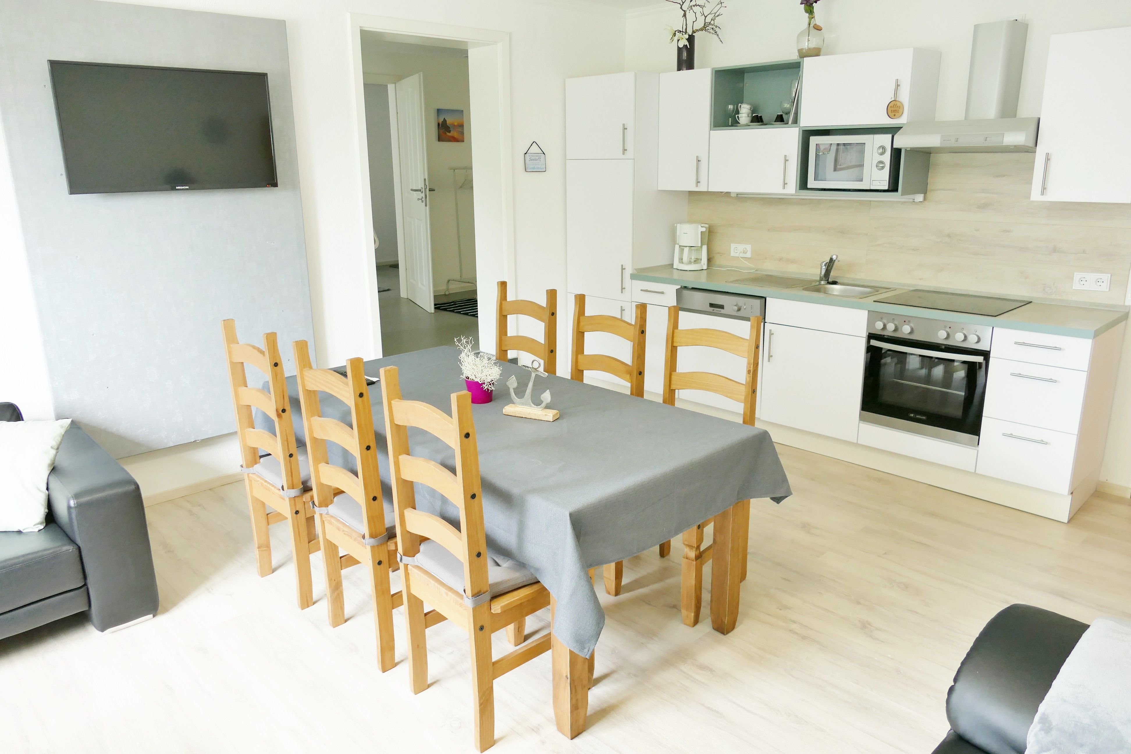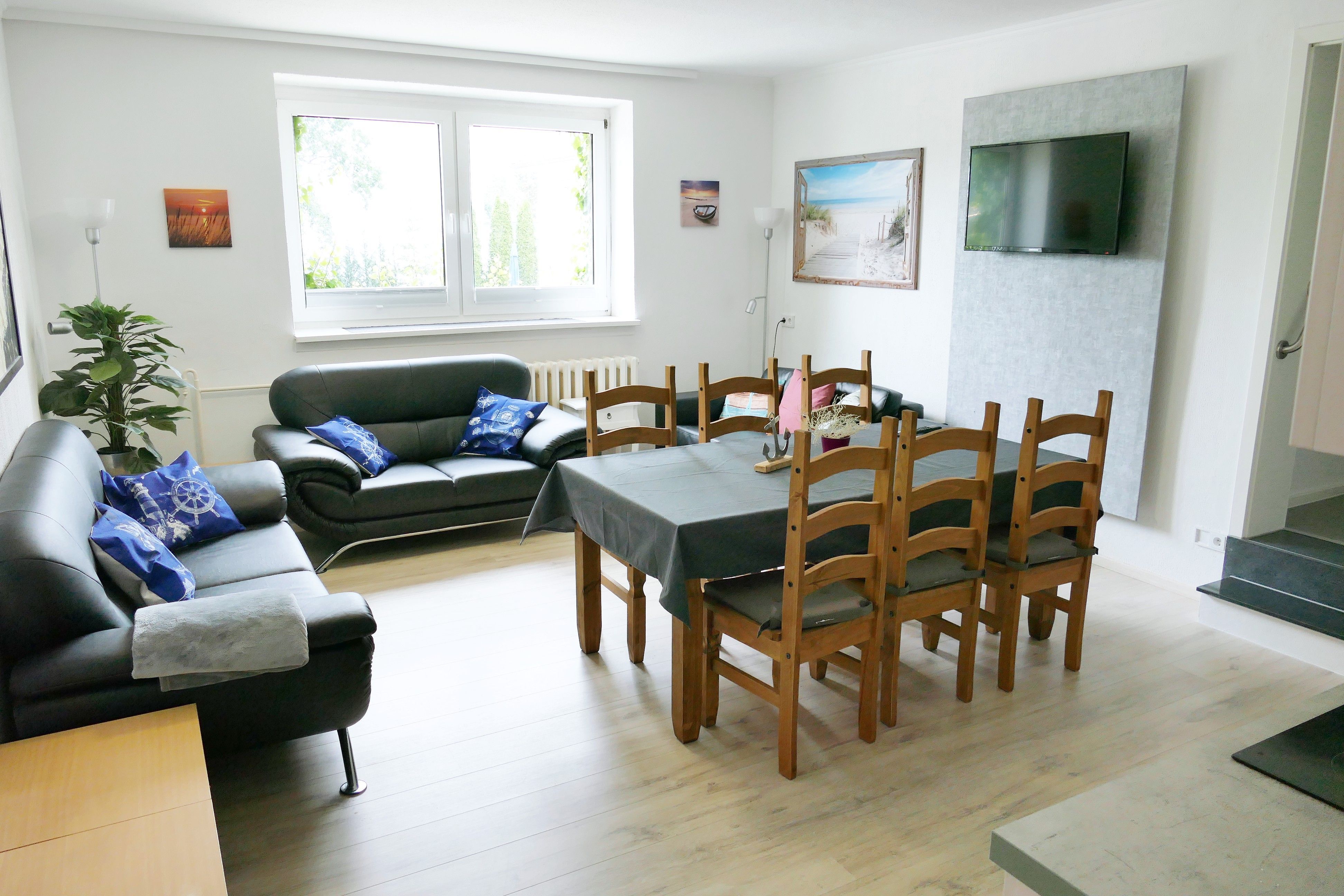 Die 140 qm große und gemütliche Ferienwohnung in Hochparterre ist für bis zu 6 Personen ausgestattet. Sie besteht aus einem Wohn-und Essraum mit eingebauter Küche und Esstisch, sowie einer Sitzlandschaft und TV. Der Küchenbereich ist mit Kühlschrank, Backofen, Spülmaschine u.v.m. ausgestattet.
