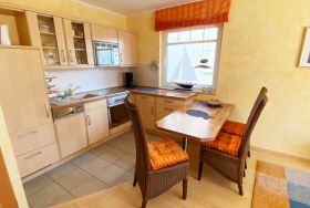 • Küche mit Essbereich (Tresen) für 3 Personen, offen zum Wohnzimmer, komplett eingerichtete Einbauküche mit Backofen, Ceranfeld, Mikrowelle, Geschirrspüler, Toaster, Kaffeemaschine, Wasserkocher, Kühlschrank mit Tiefkühlfach