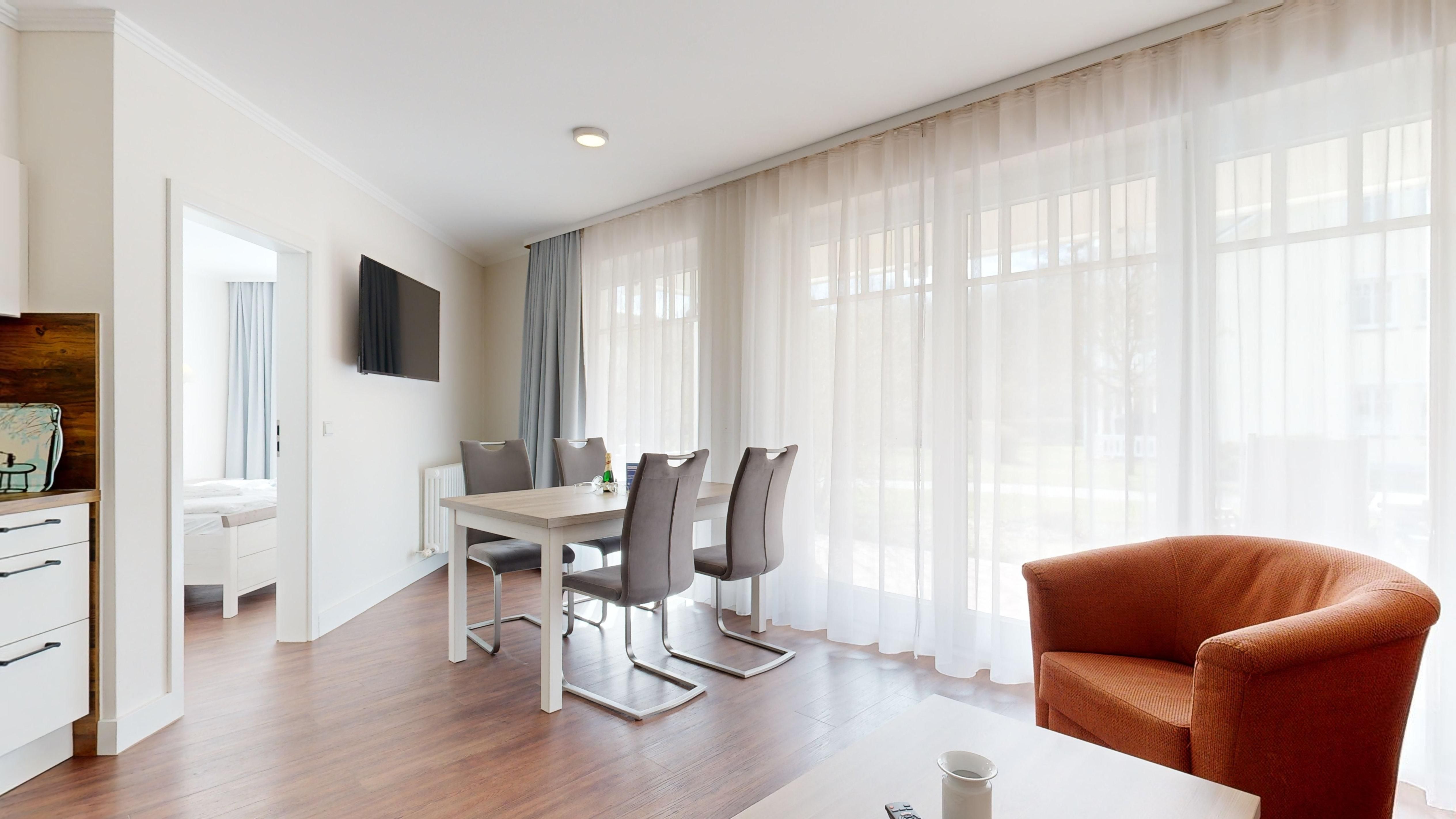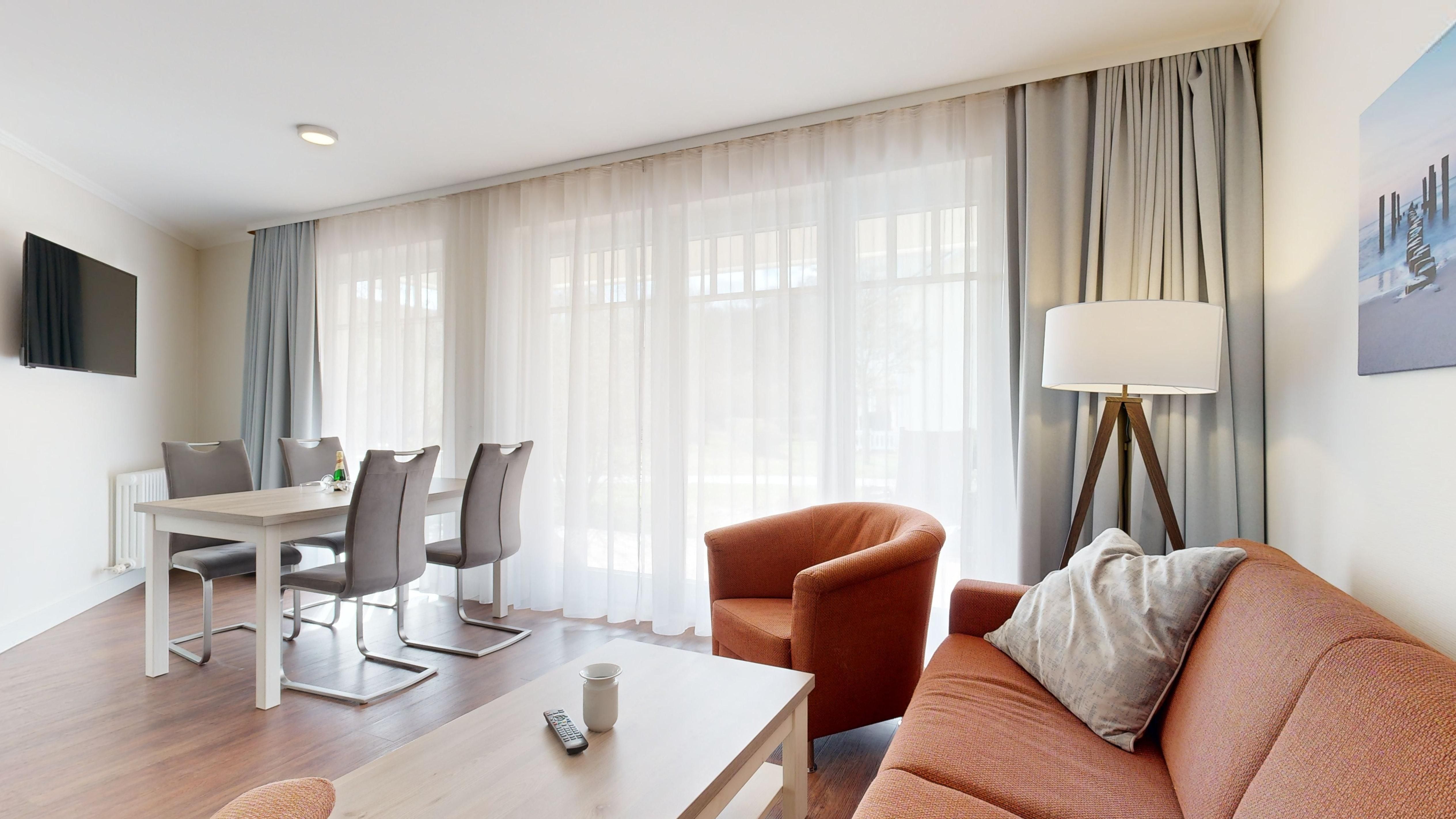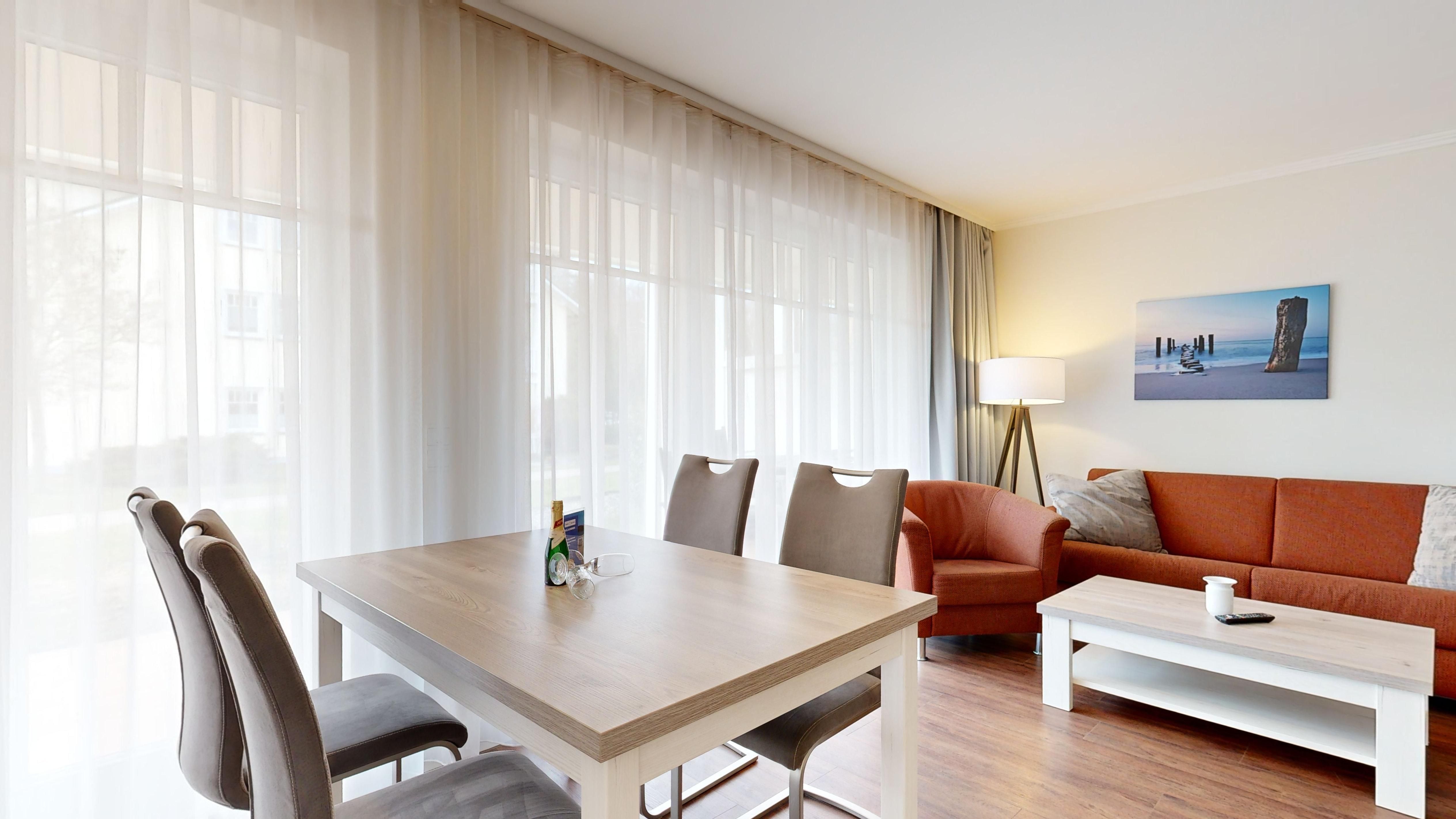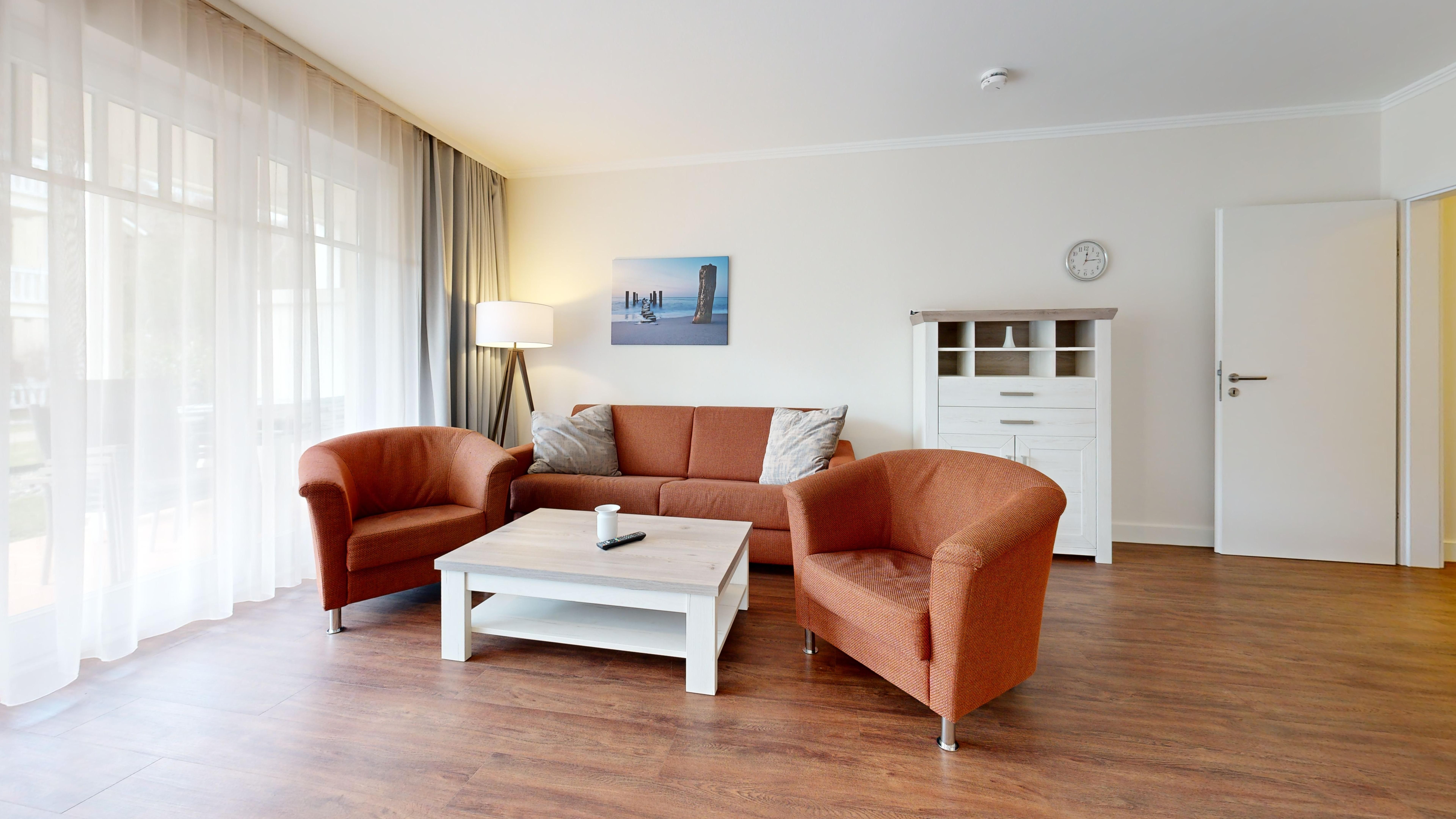 Im Dünenpark Binz befindet sich im Haus 8 die großzügige Komfort-Ferienwohnung im Erdgeschoss (2 Zimmer / 61 m²) mit 1 Schlafzimmer, einer Schlafcouch und mit großer Terrasse