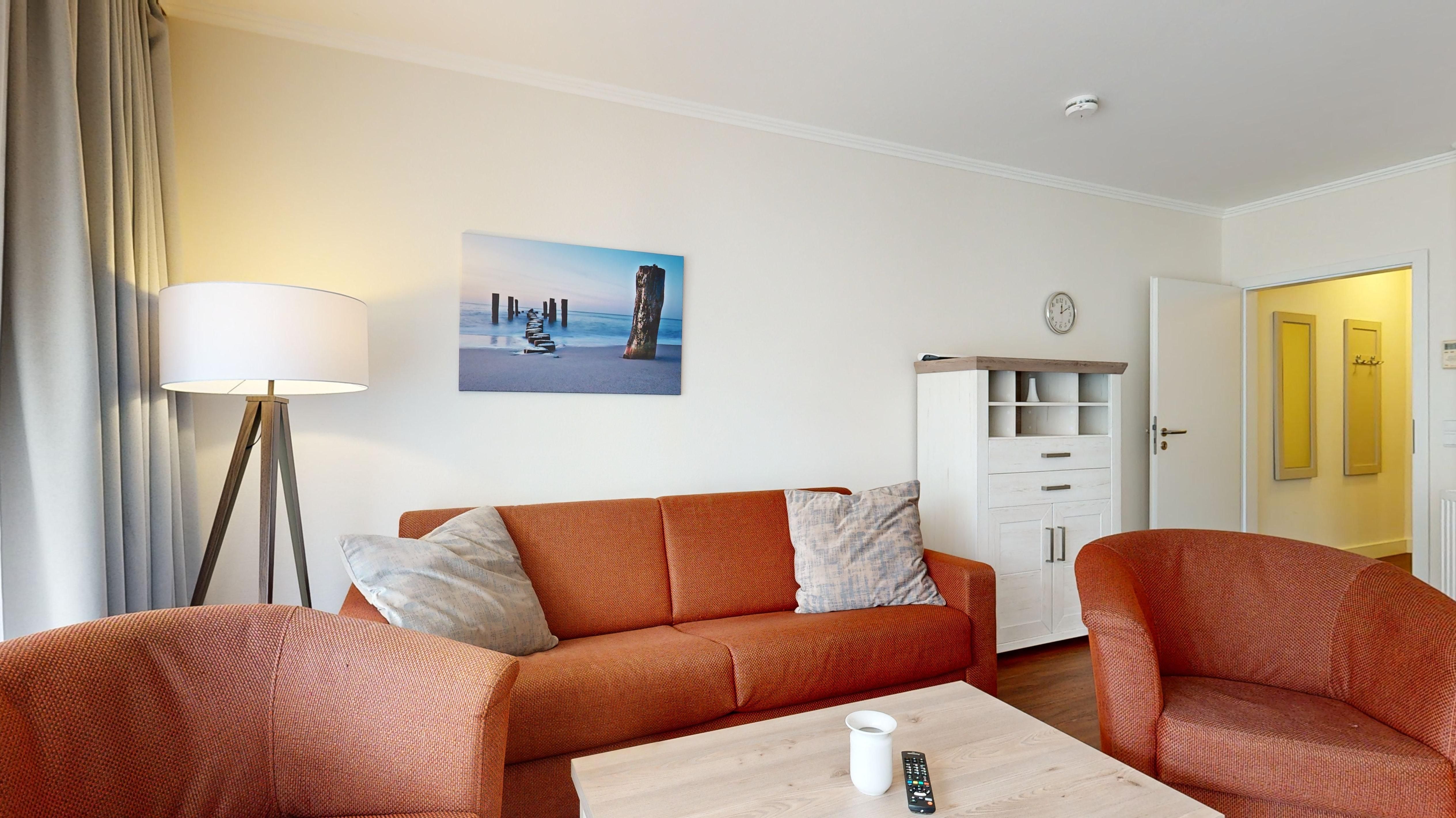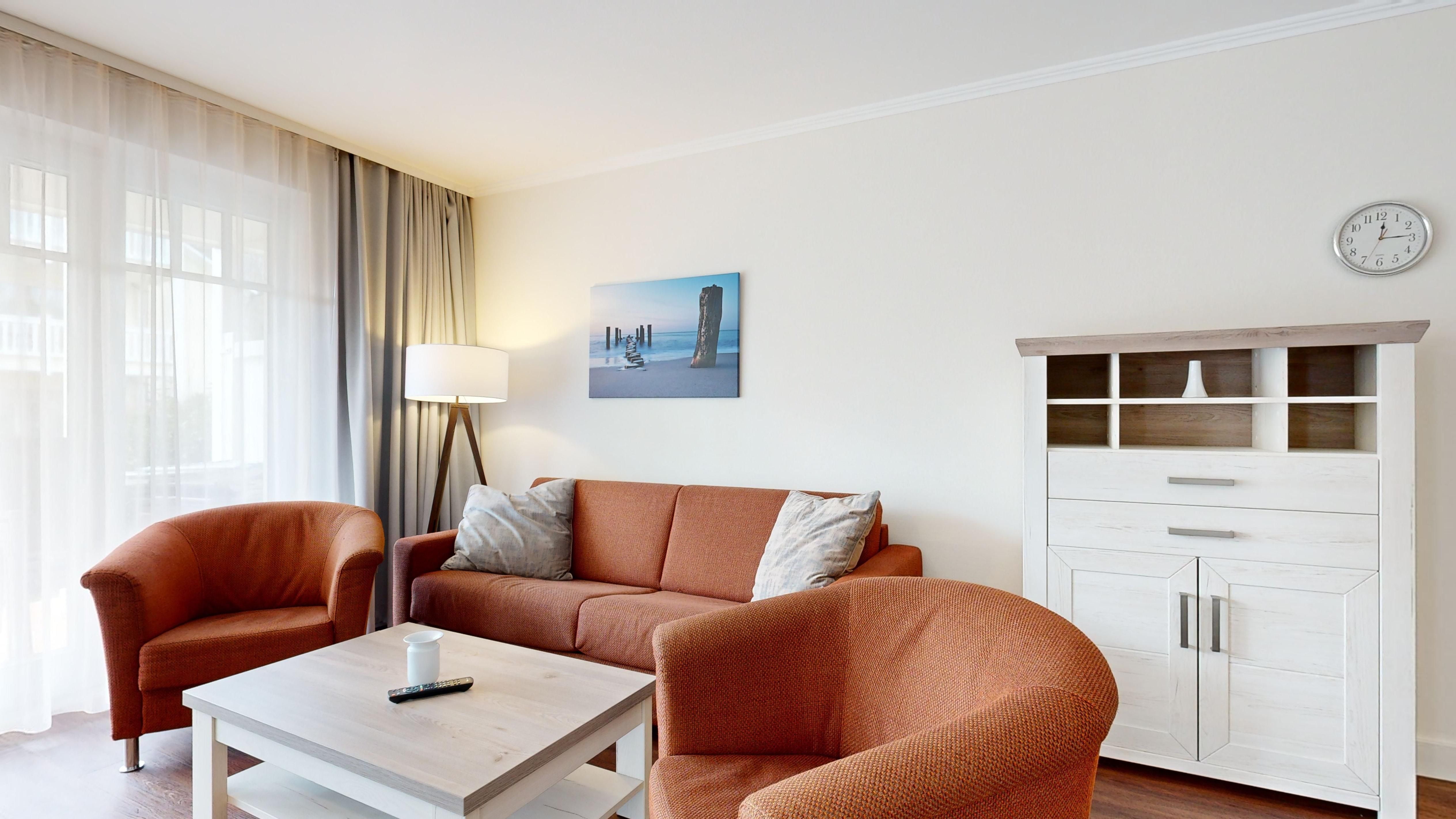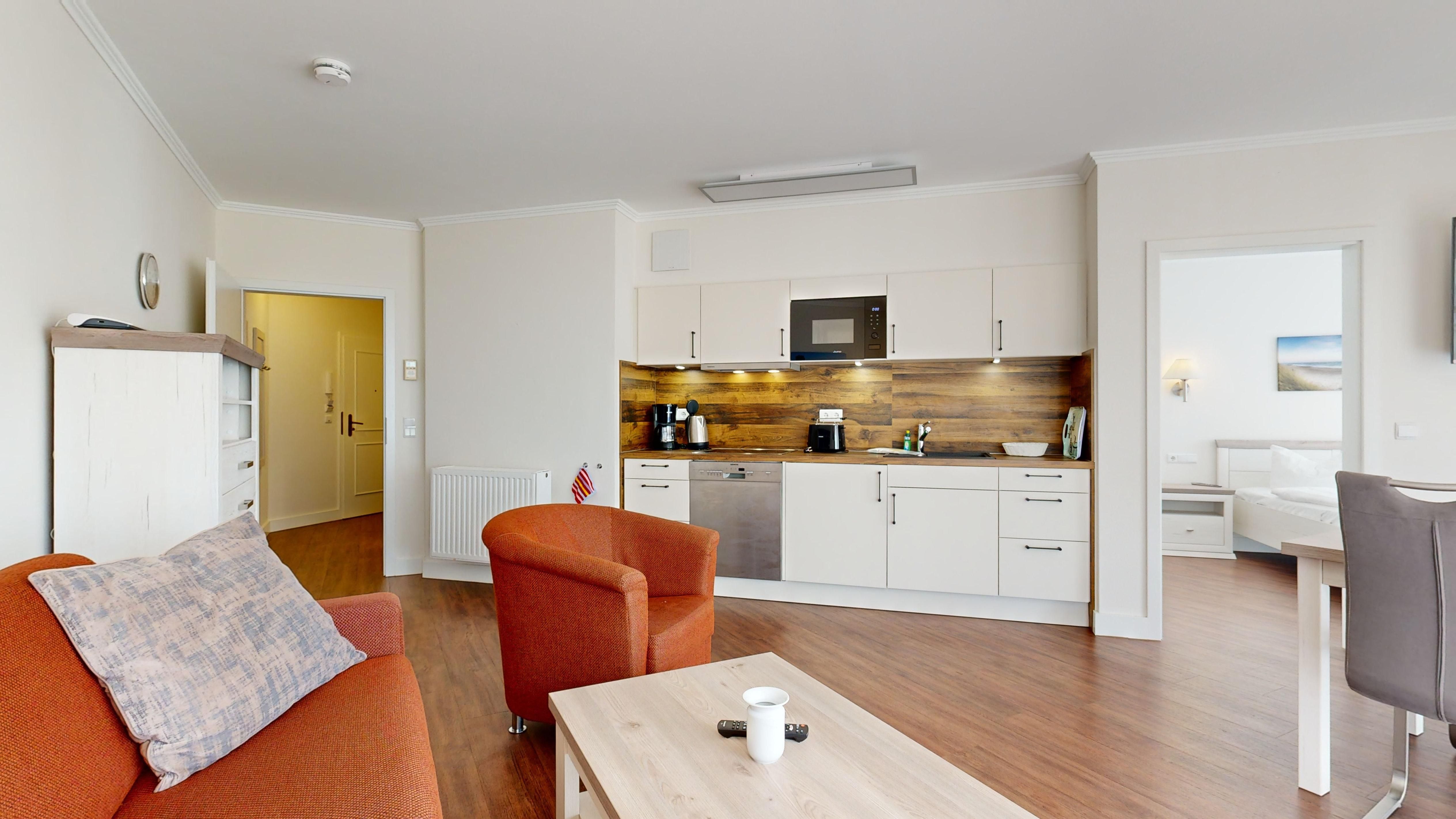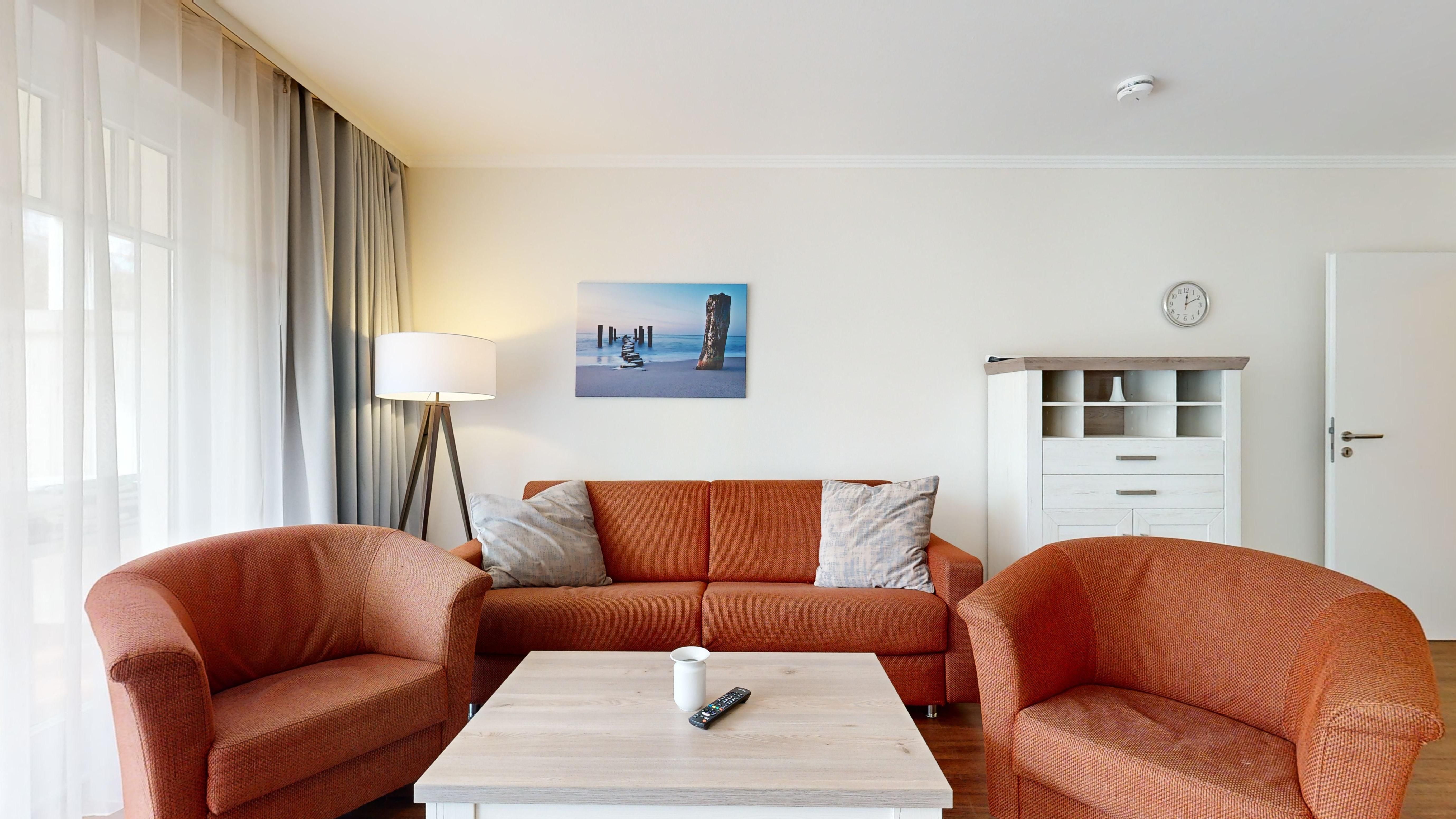 Im Dünenpark Binz befindet sich im Haus 8 die großzügige Komfort-Ferienwohnung im Erdgeschoss (2 Zimmer / 61 m²) mit 1 Schlafzimmer, einer Schlafcouch und mit großer Terrasse
