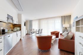 In der Ende der 90er Jahren neu gebauten Anlage gibt es großzügige Ferienwohnungen mit 1 Schlafzimmer, Internet und Terrasse oder Balkon. Je ein Außenstellplatz oder ein Tiefgaragen-Stellplatz stehen pro Wohnung zur Verfügung.