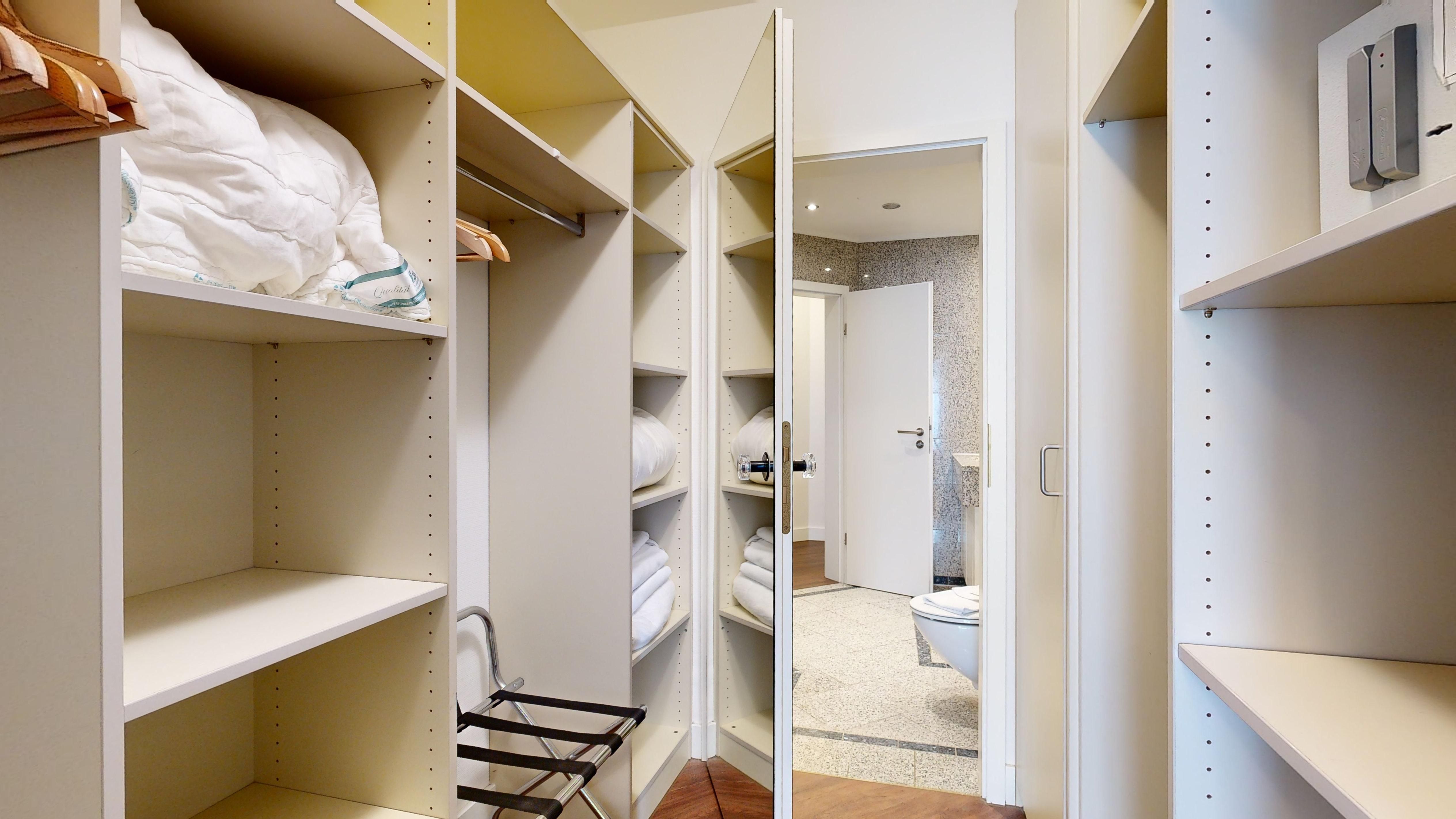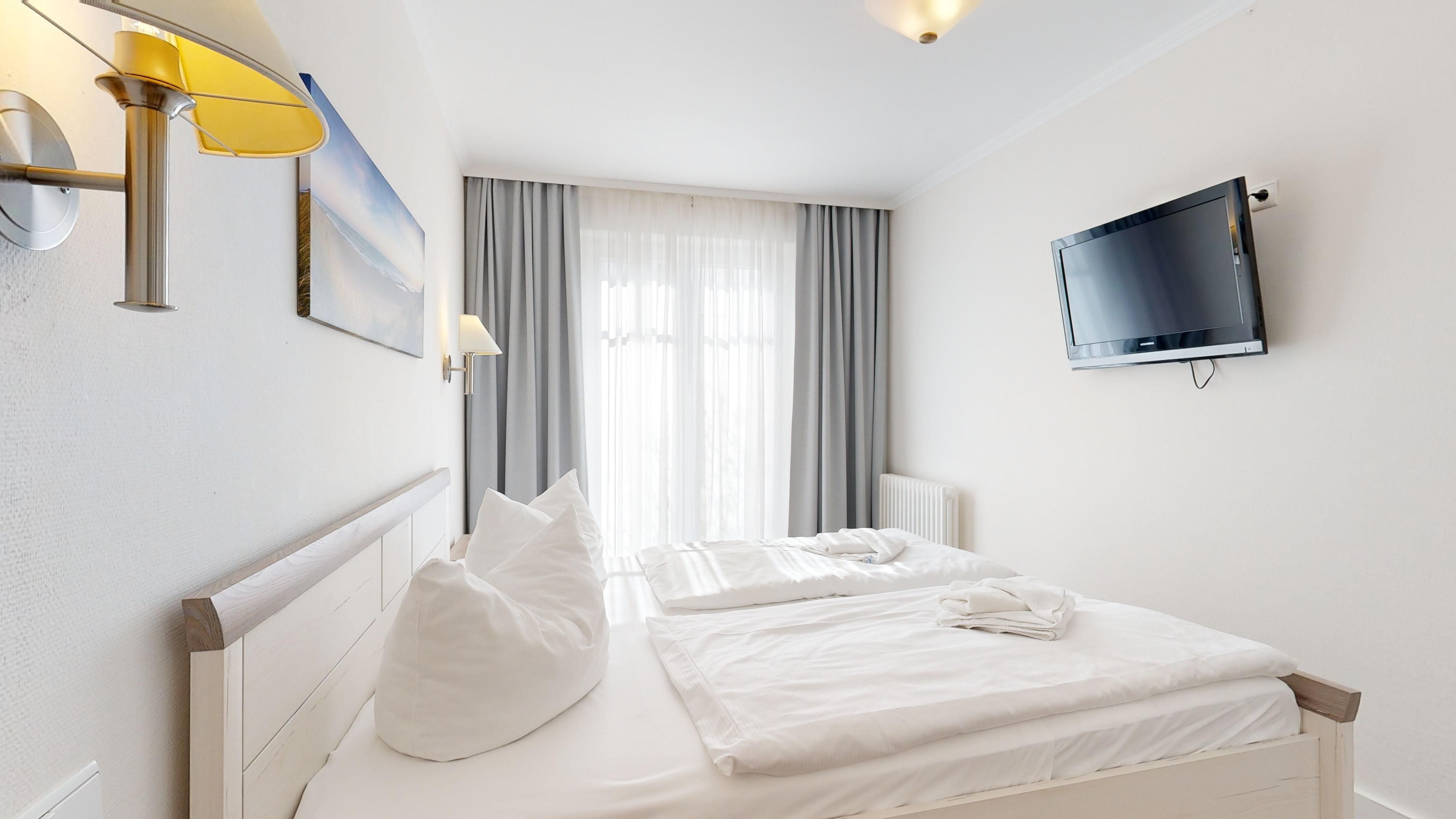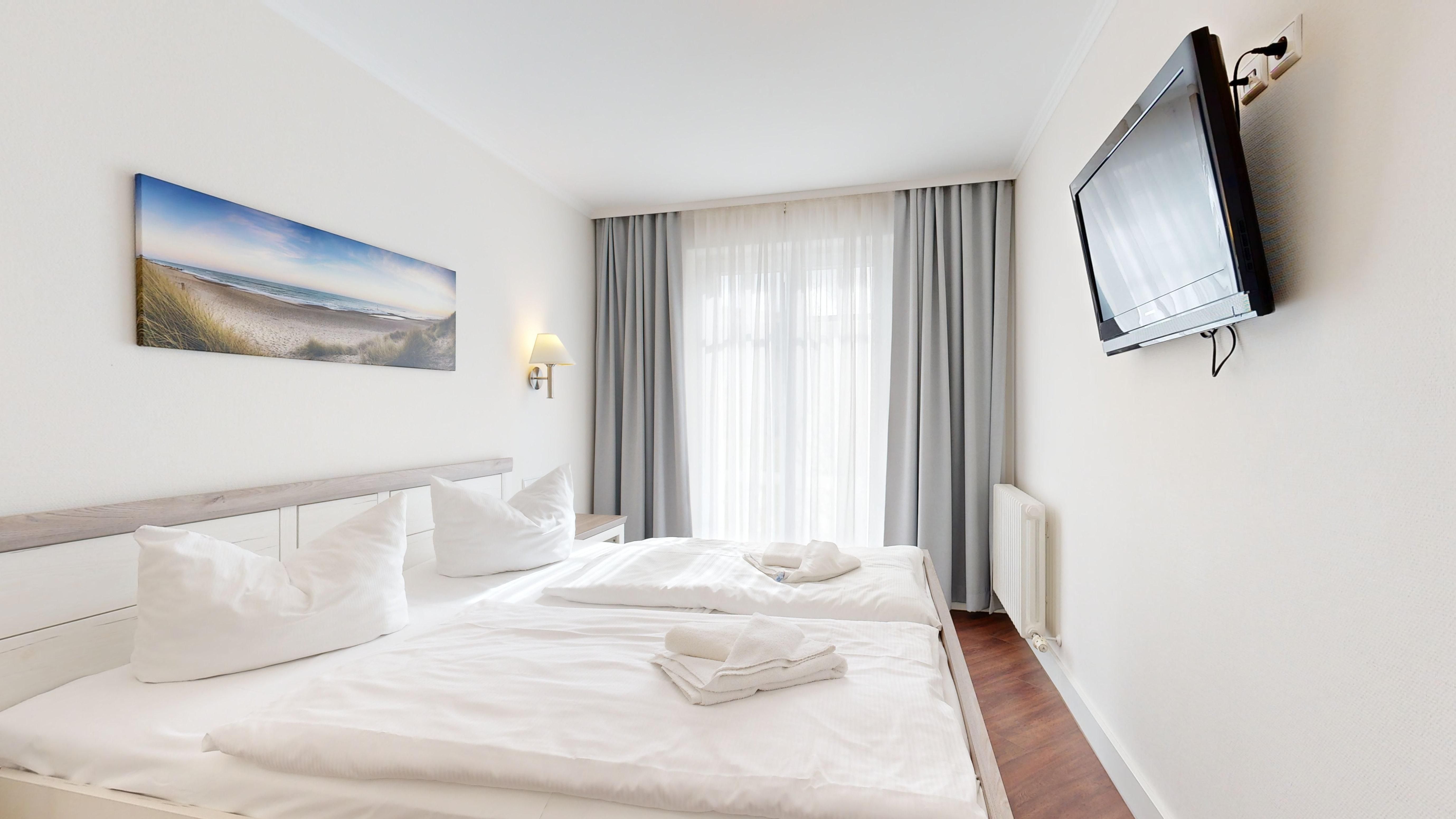 1 Schlafzimmer mit einem Doppelbett (1,80 m breit), begehbaren Kleiderschrank, Zusatz-TV, Safe