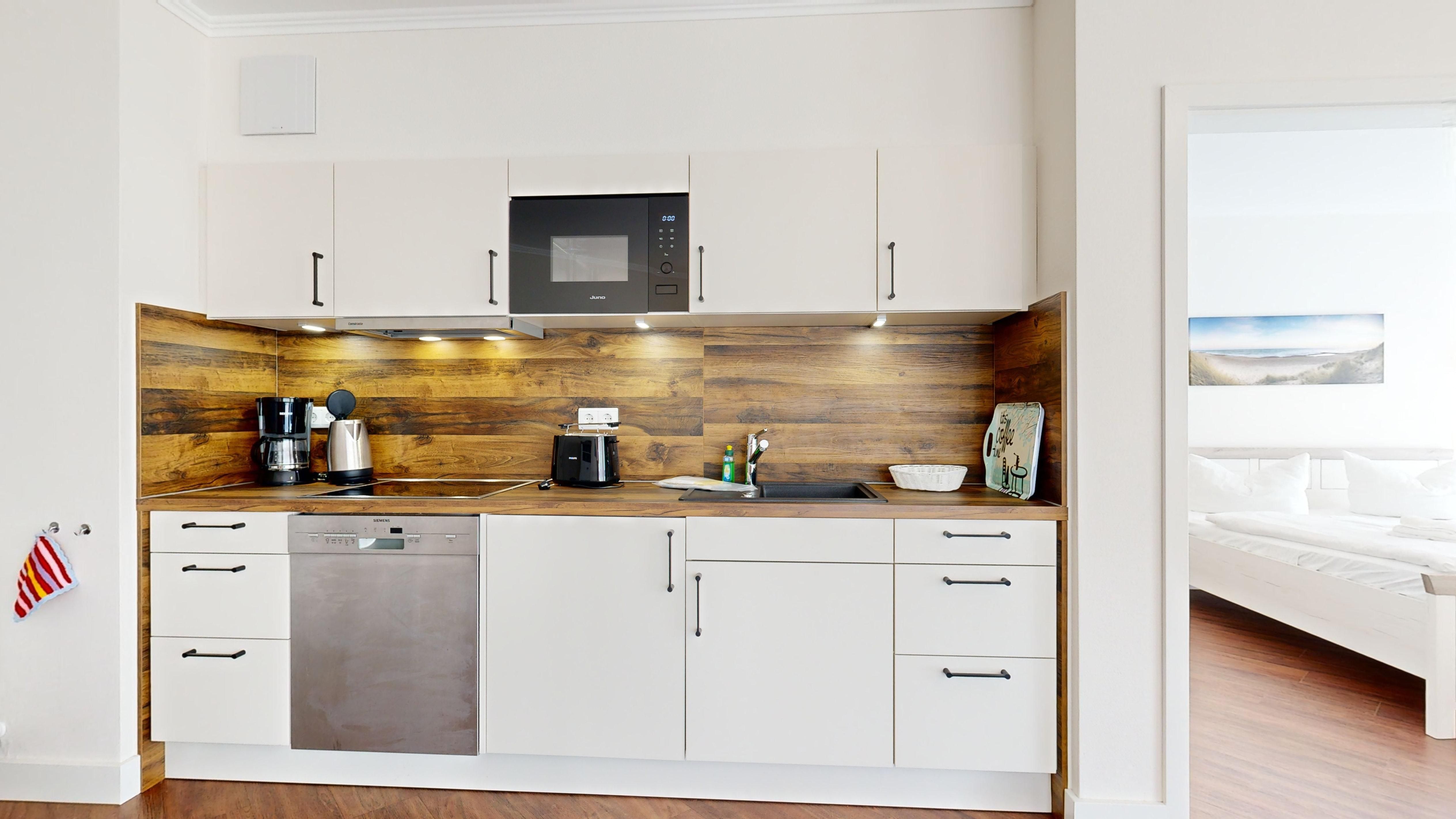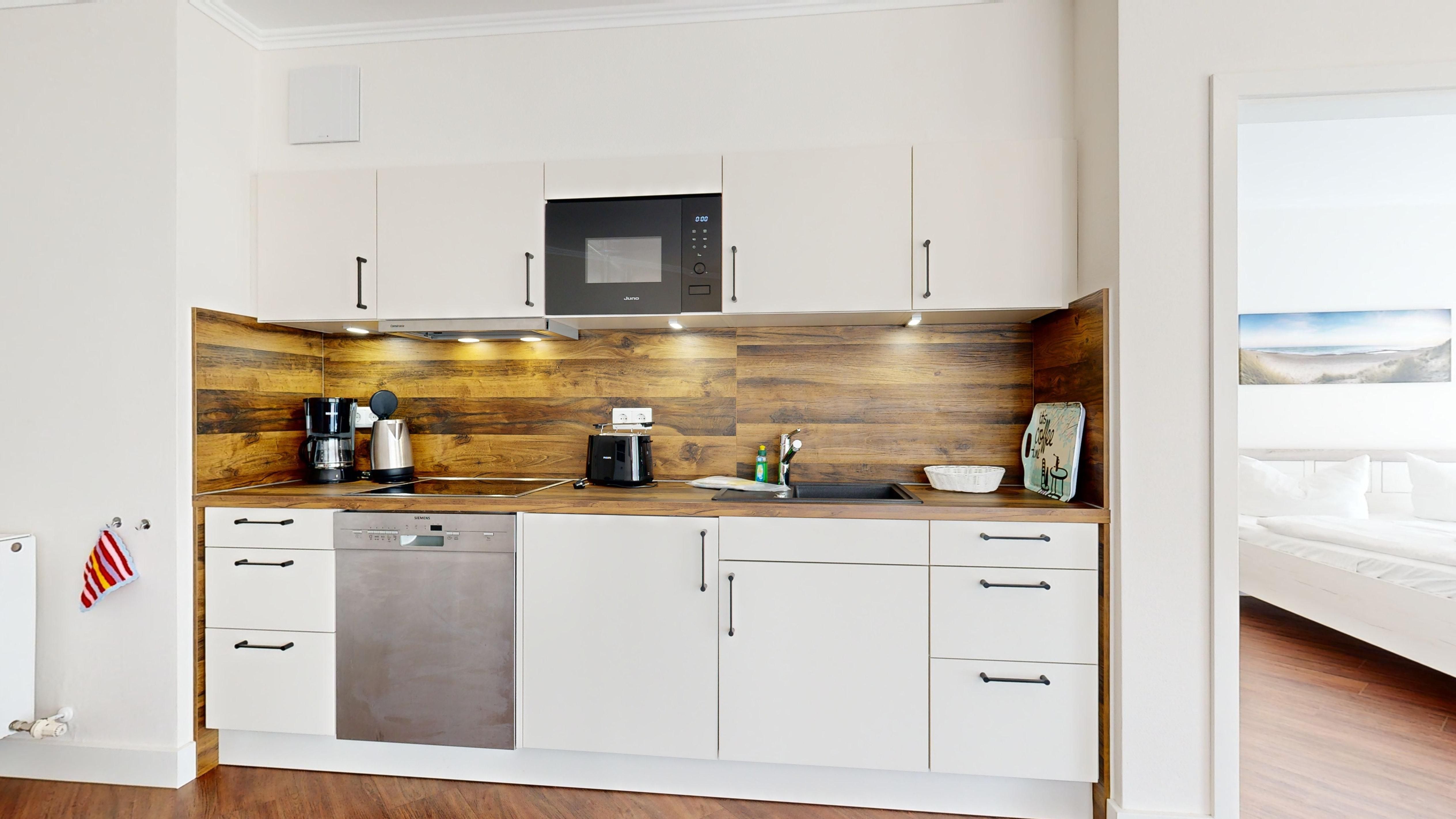 Küche: Moderne Küchenzeile, Ceran-Herd, Mikrowelle mit Back- und Grillfunktion, Spülmaschine, Kühlschrank mit Gefrierfach, Kaffeemaschine, Toaster, Wasserkocher