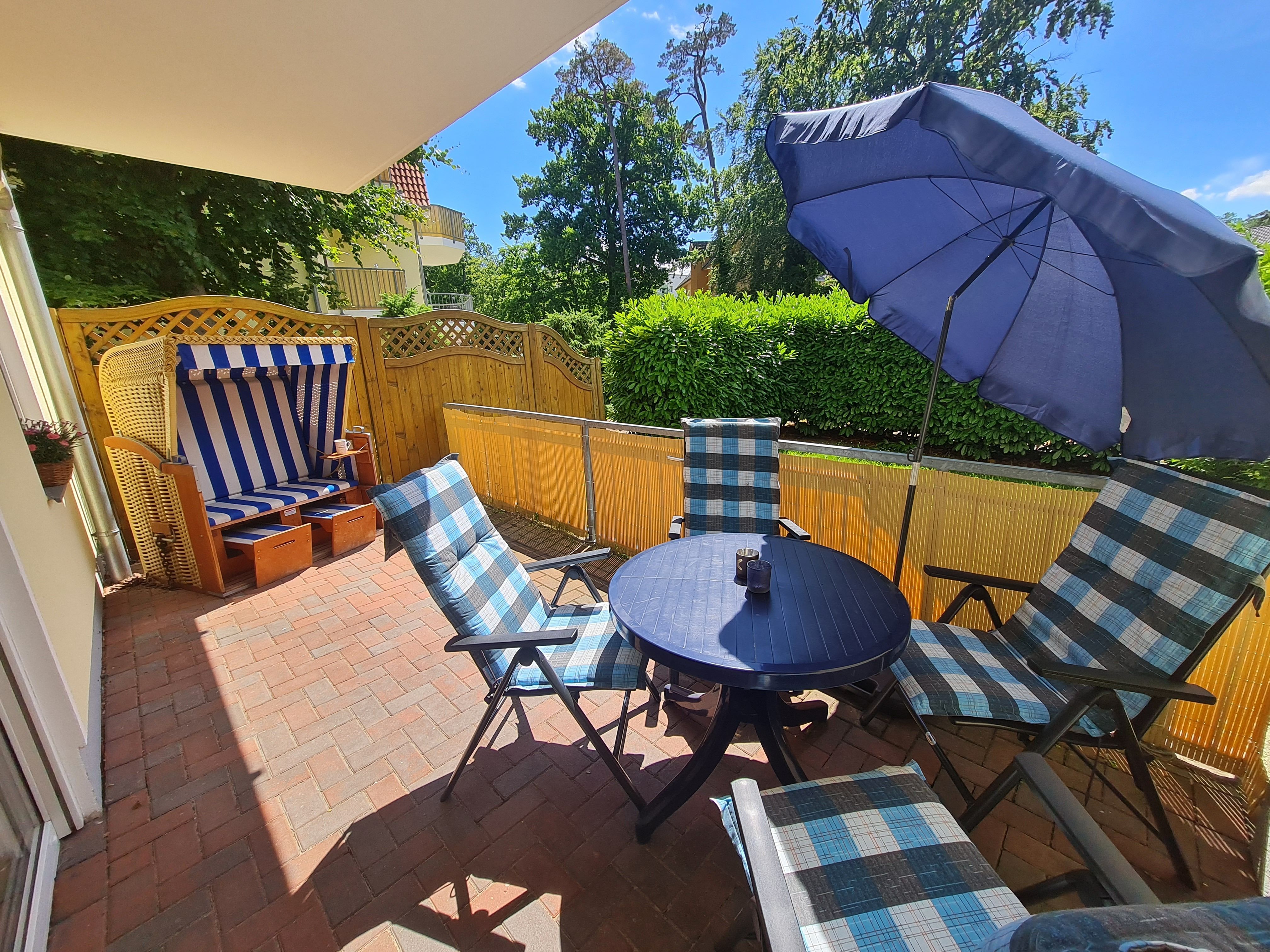 • Terrasse: Südausrichtung mit Gartenstück, Tisch, 4 Stühle, Strandkorb