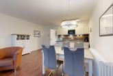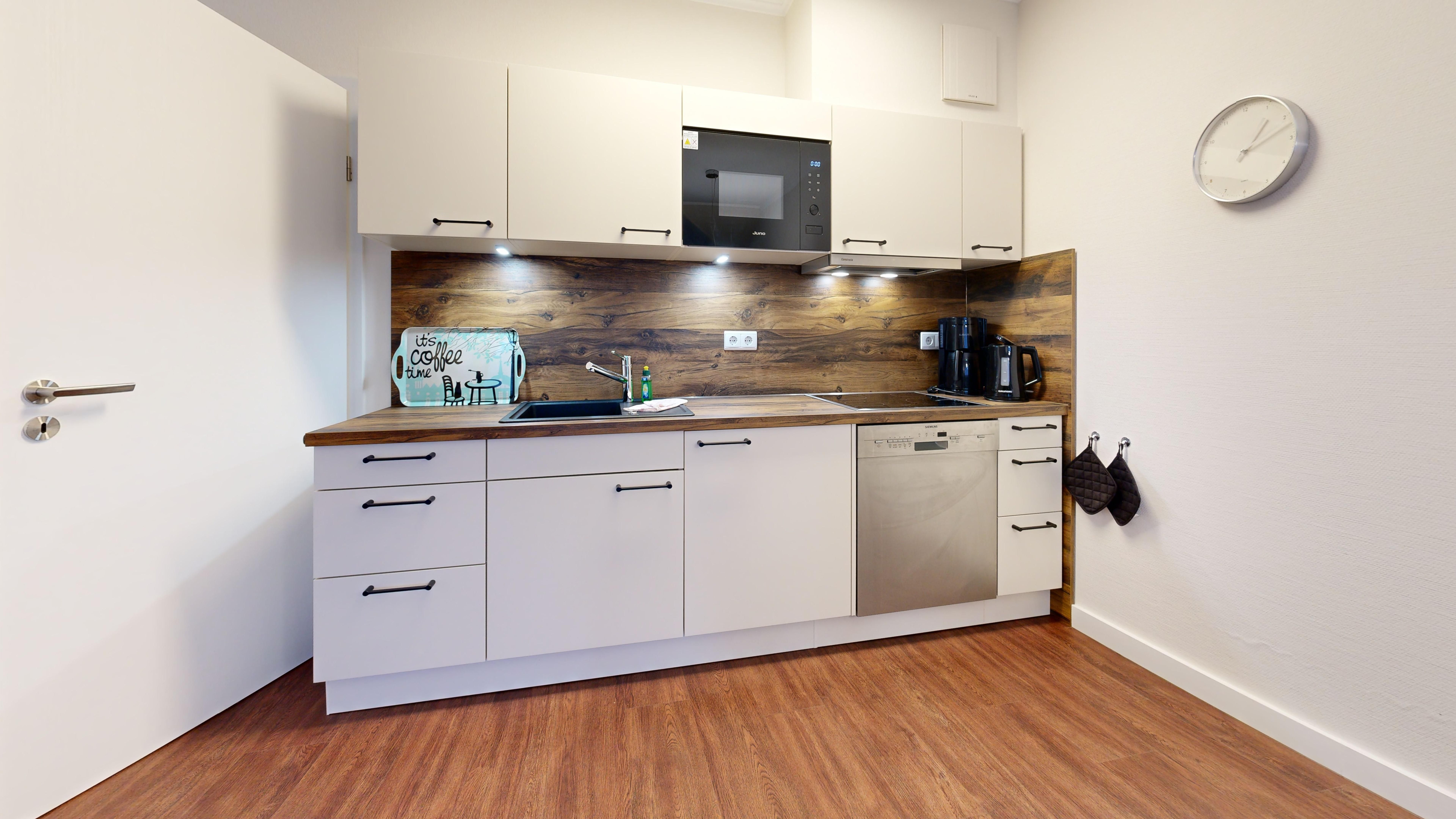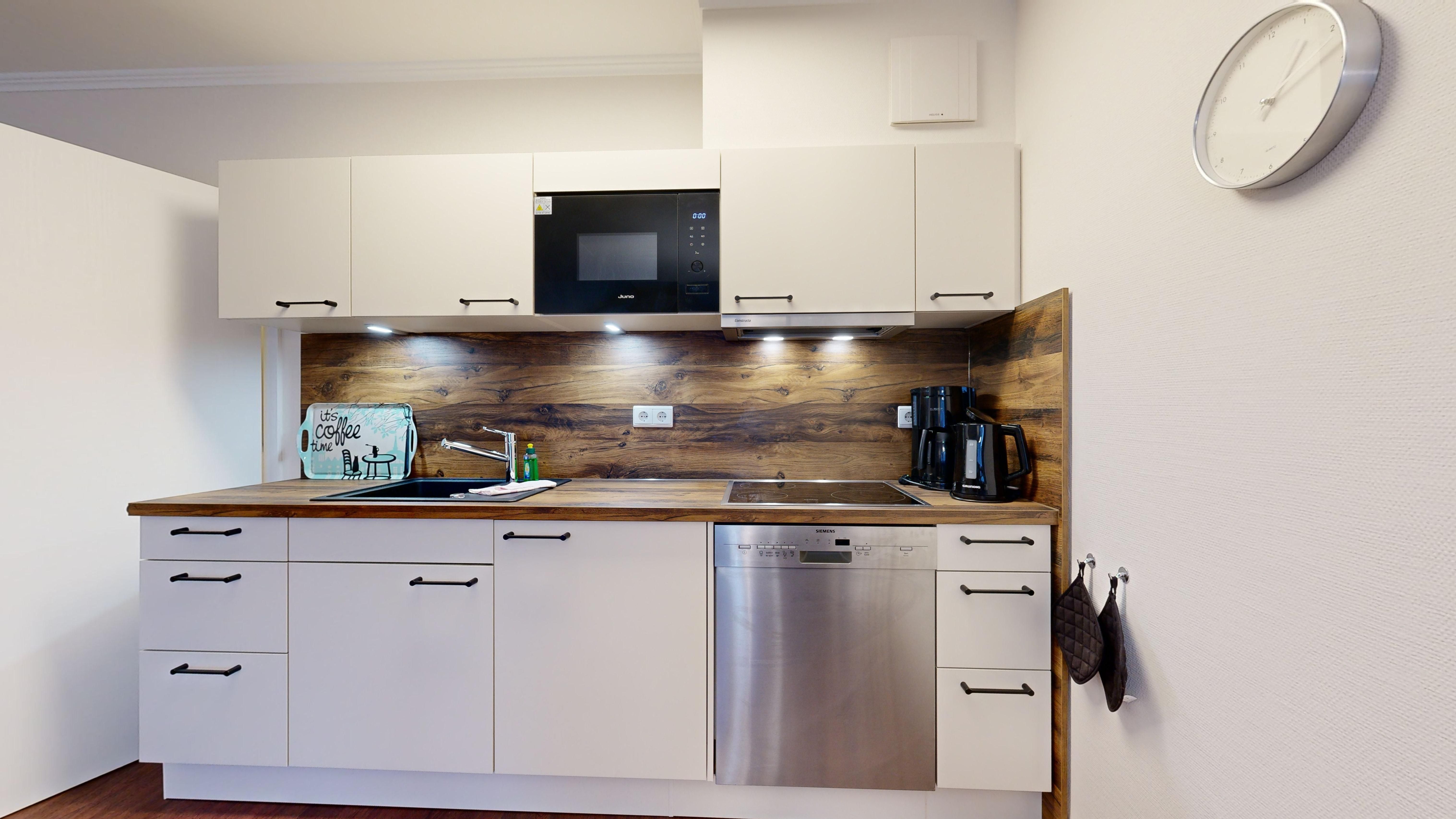 Küche: Küchenzeile, Ceran-Kochfeld, Spülmaschine, Kühlschrank mit Gefrierfach, Mikrowelle mit Backfunktion, Kaffeemaschine, Toaster und Wasserkocher