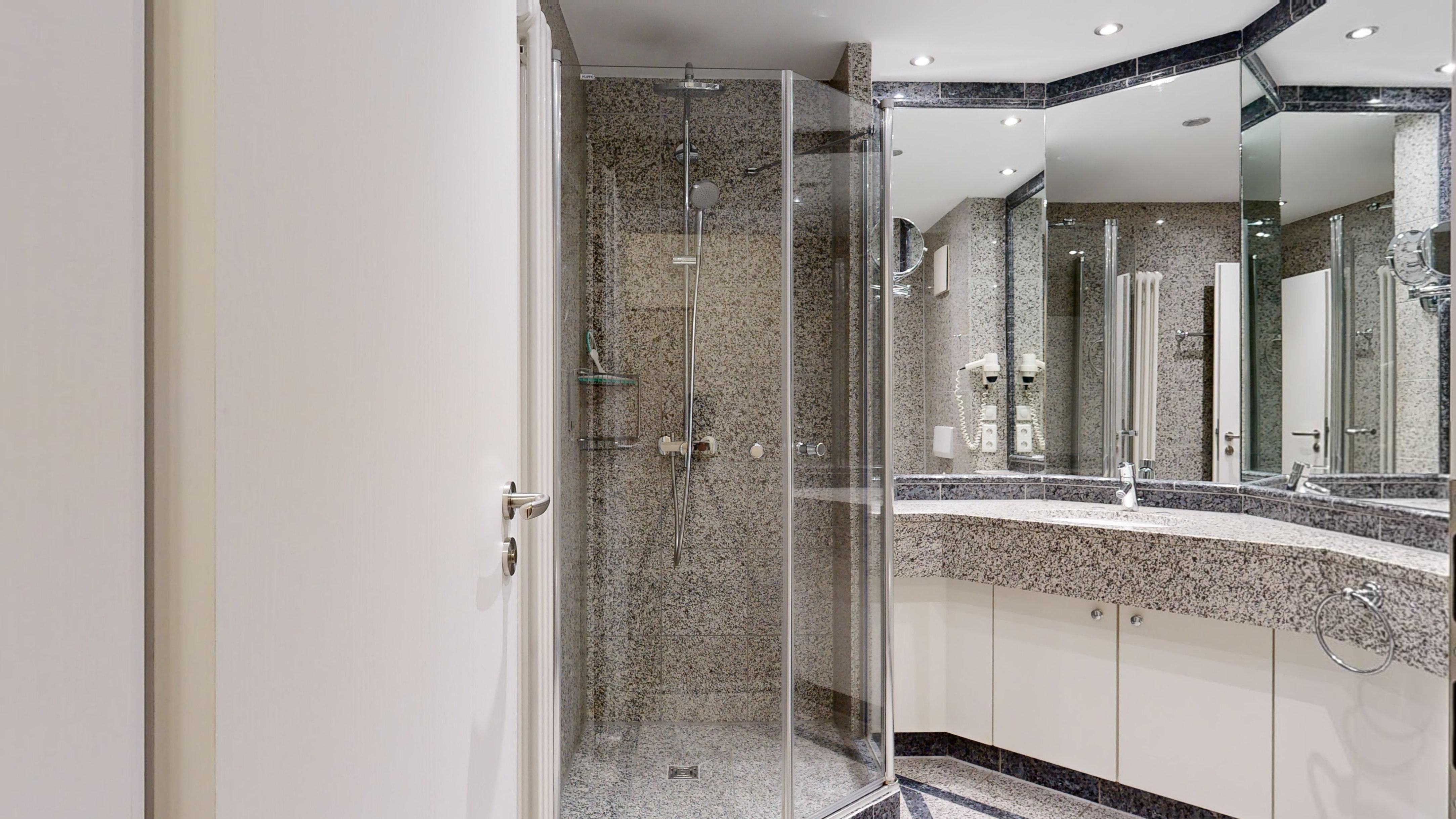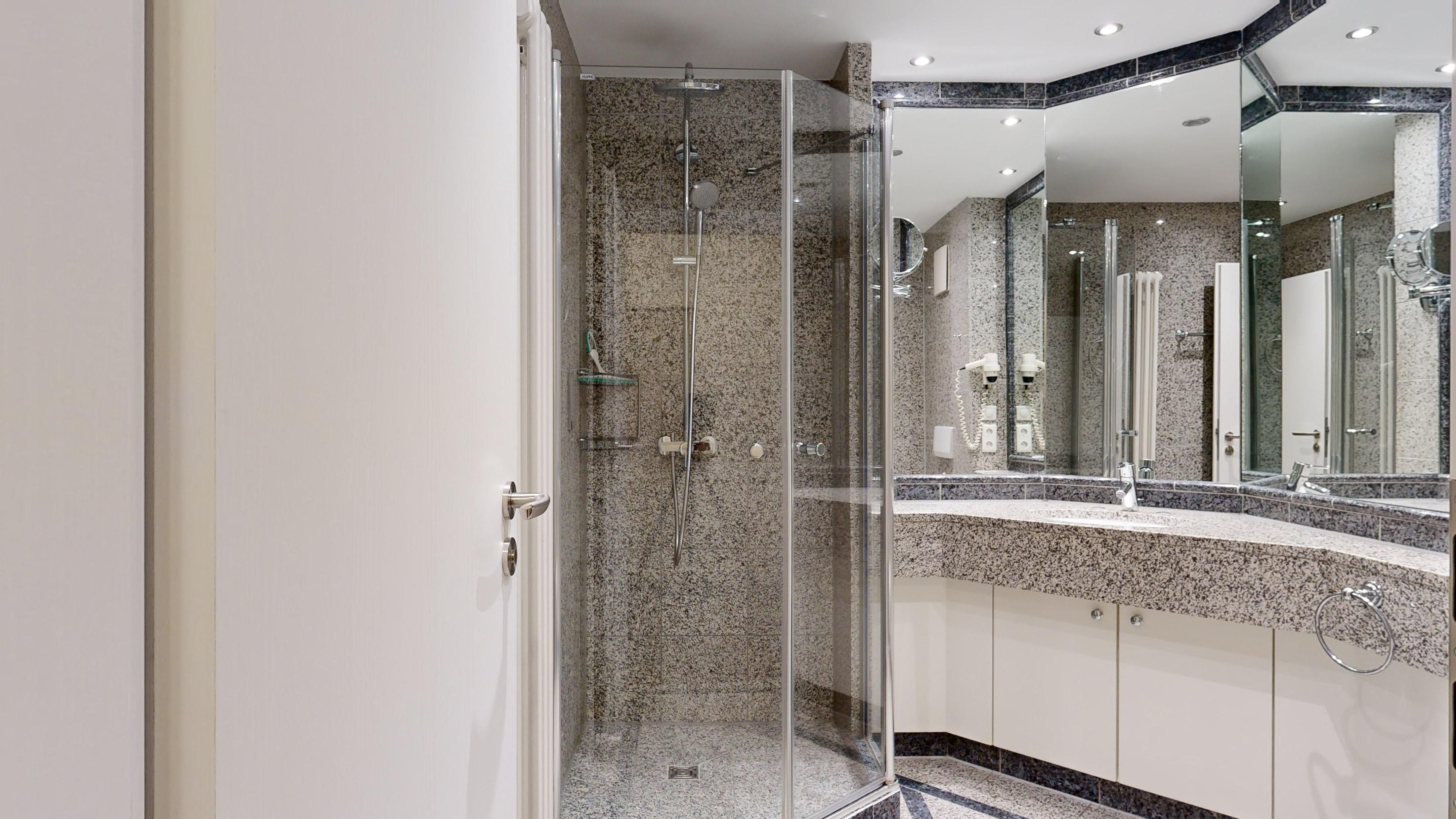 1 Badezimmer mit Dusche, WC und Föhn