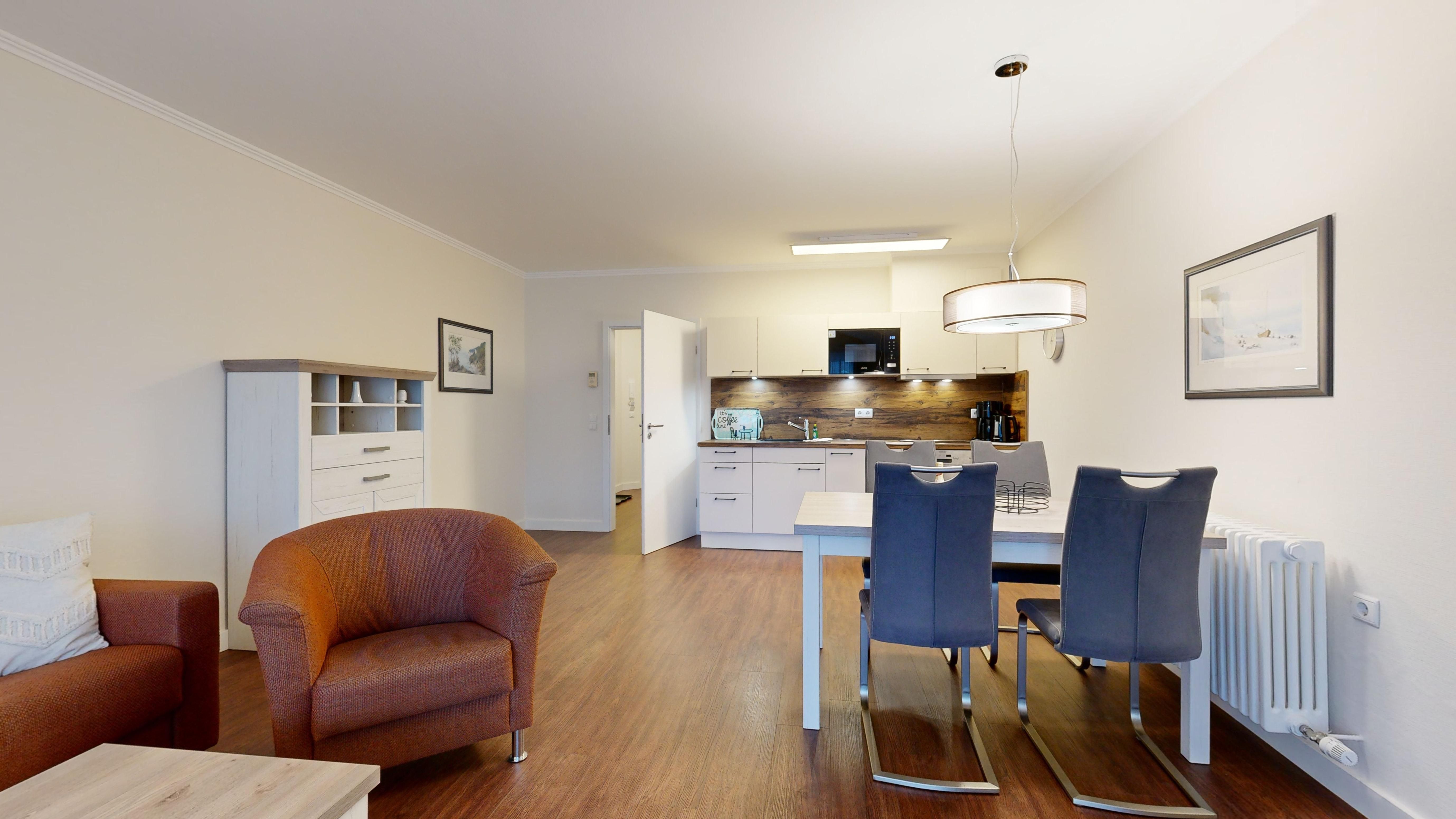 Wohnzimmer: Große Couch mit Schlafgelegenheit für 1-2 Personen, 2 Sessel, Sat-TV mit Flachbildschirm, WLAN-Internetanschluss, großer Essplatz mit 4 Stühlen