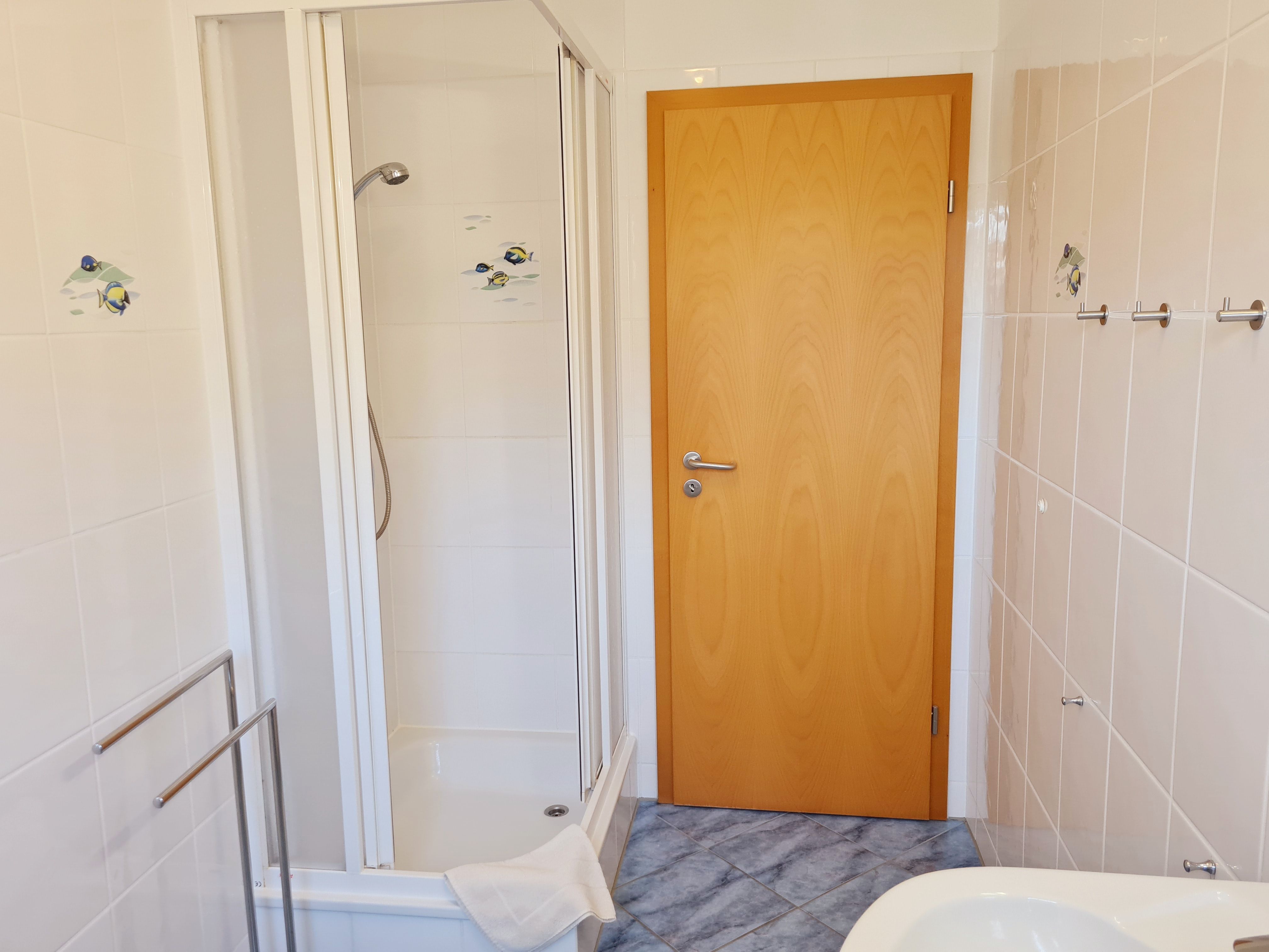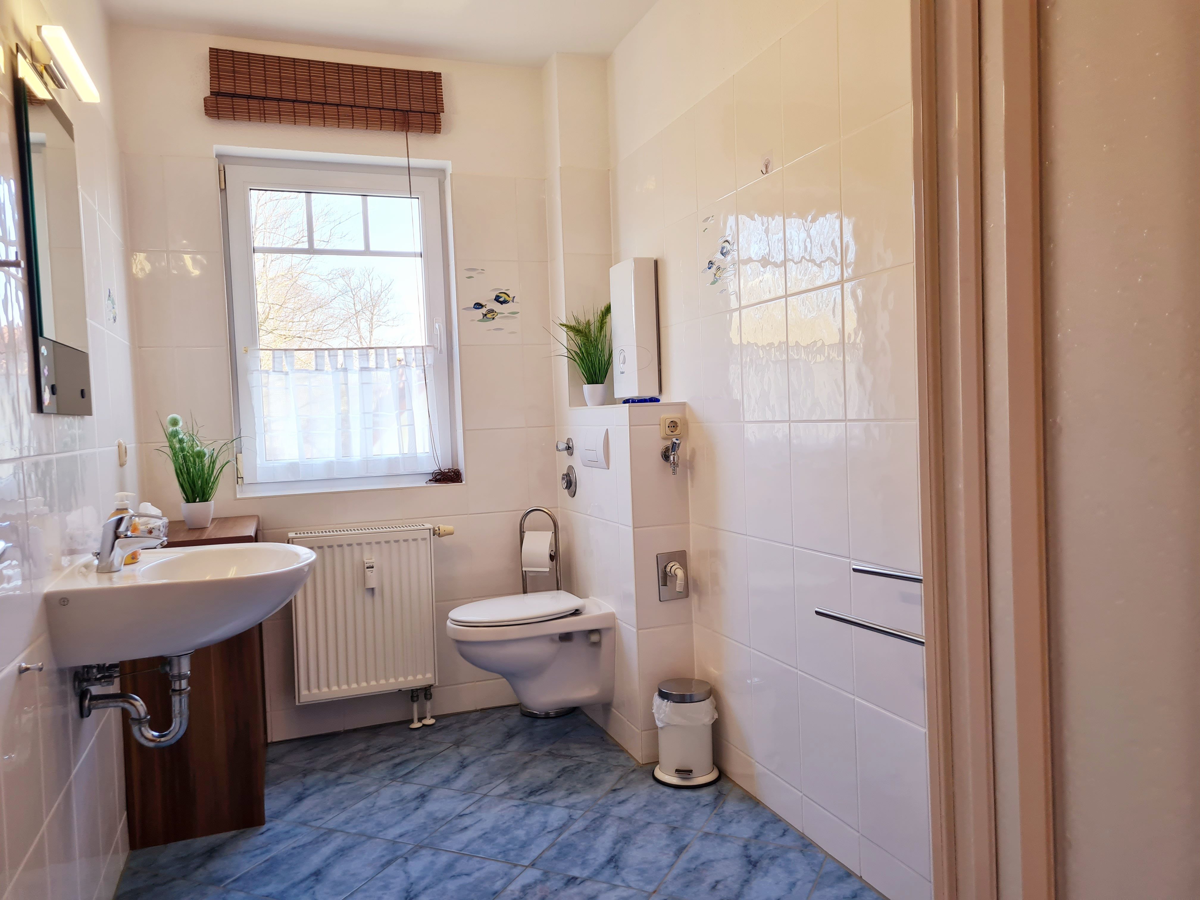 • Bad: mit Fenster, Dusche, Waschbecken, Toilette, Spiegel, Schrank, Handtuchhalter