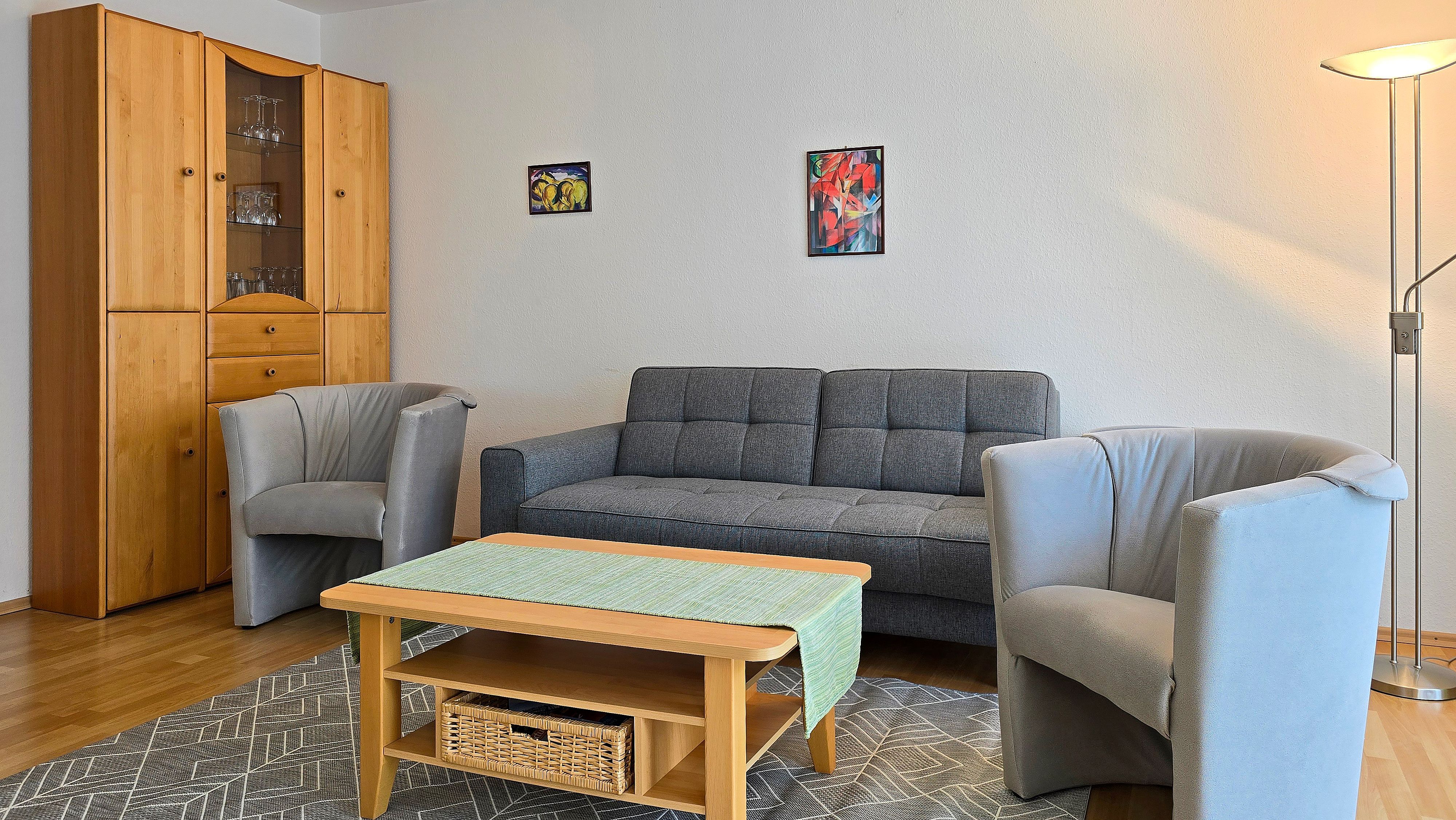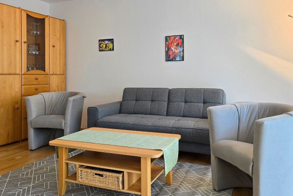 Im gemütlichen Wohnzimmer mit Couchgarnitur, die auch als Aufbettung dient, steht ein Esstisch mit 4 Stühlen, ein Flachbild TV, WLAN,Radio und CD-Player.