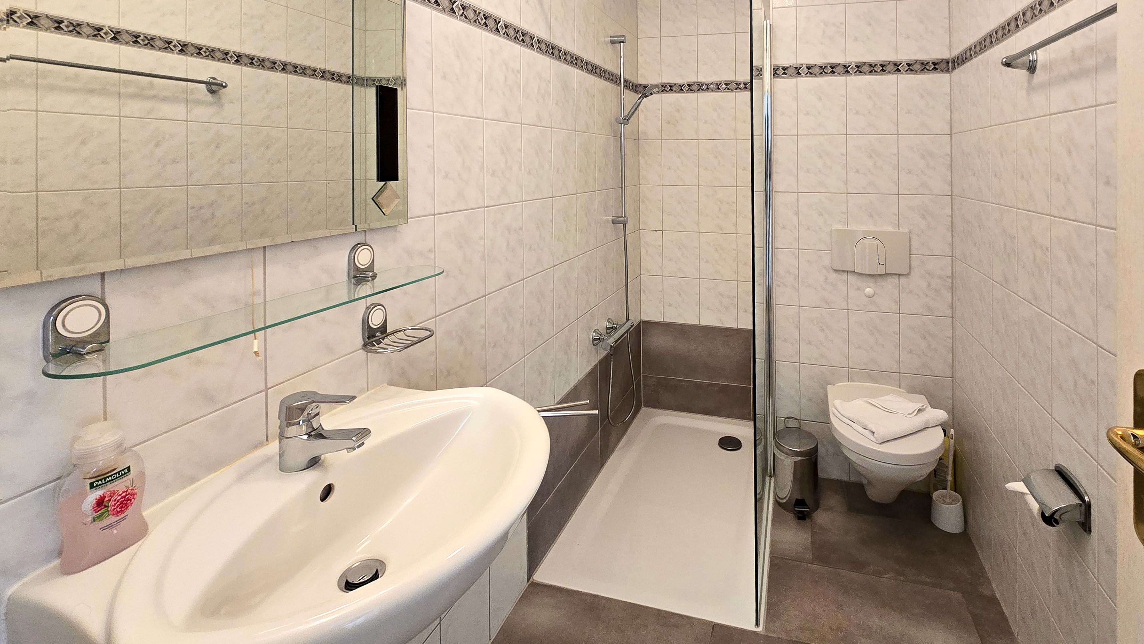 Das Bad ist mit Dusche, WC und Fön ausgestattet. Pro Person liegen ein großes und ein kleines Handtuch bereit.