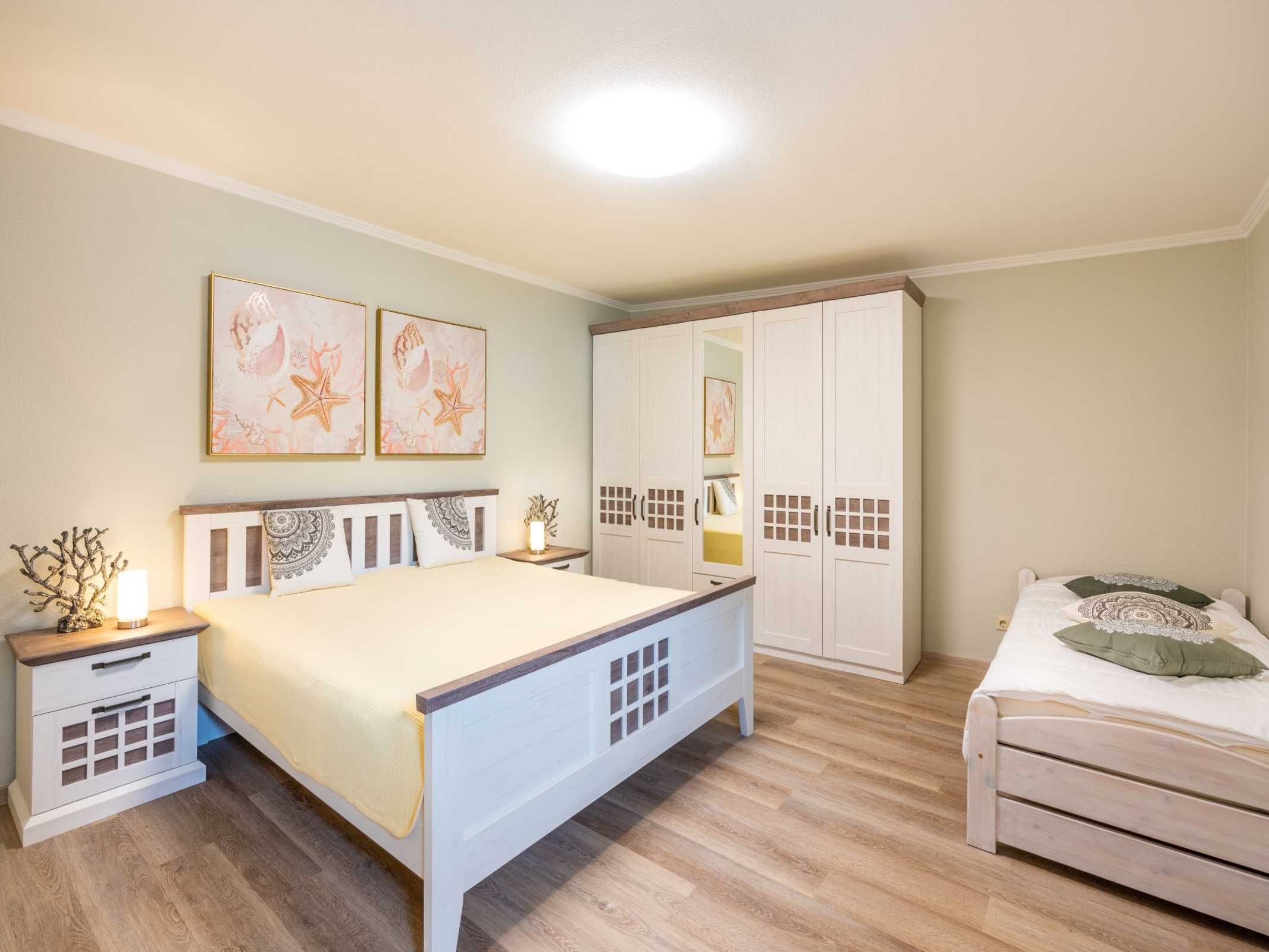 Im angrenzenden Schlafzimmer mit einem Doppelbett (180 x 200cm/getrennte Matratzen) können im Kleiderschrank Ihre persönlichen Dinge unterbringen. Eine 3. Person kann auf dem Einzelbett im Schlafzimmer übernachten.