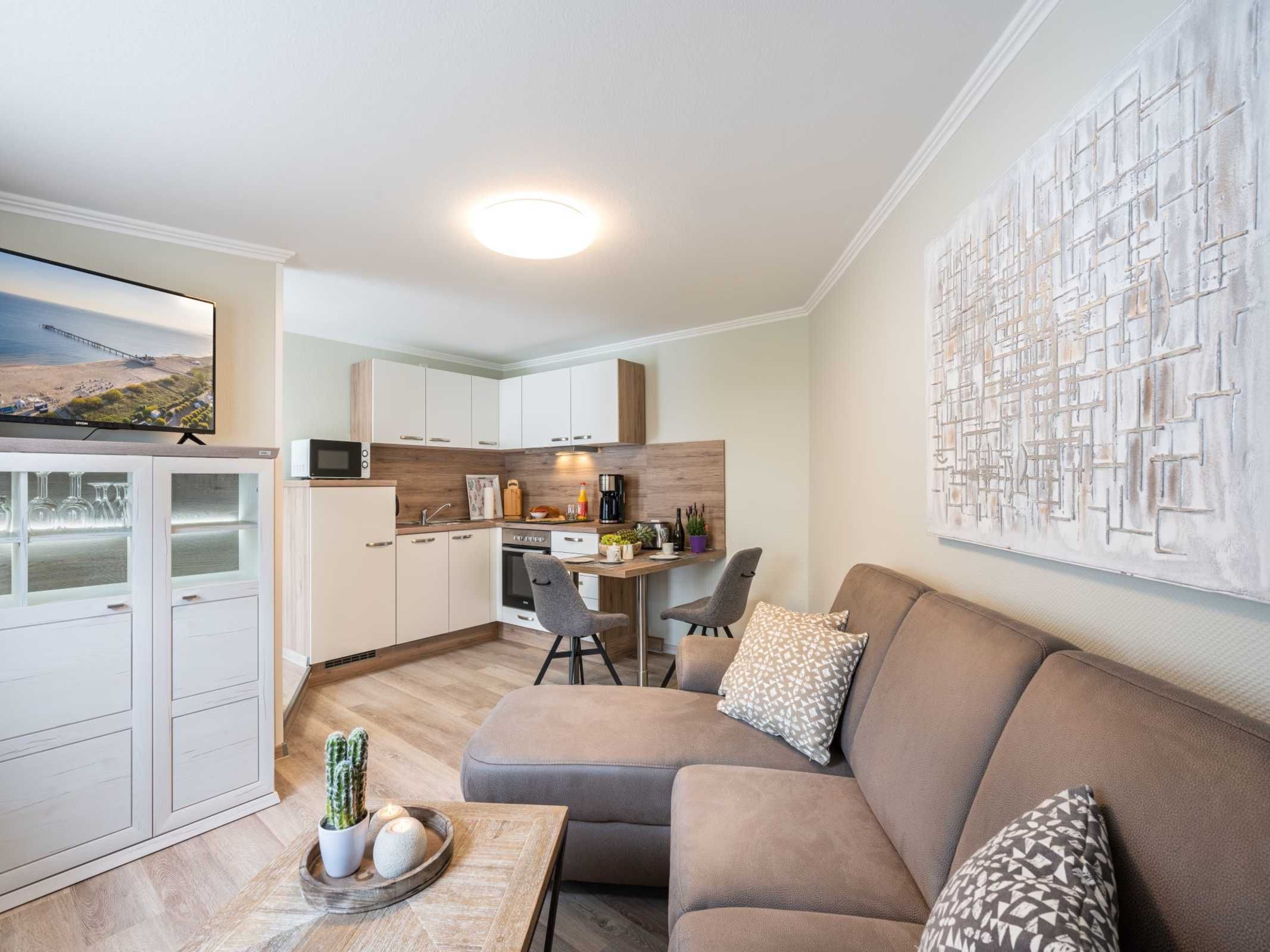 • Wohnbereich mit Flachbildfernseher, bequemer Couch und angrenzendem Schlafbereich mit einem gemütlichen Doppelbett (180 x 200cm / durchgehende Matratze)