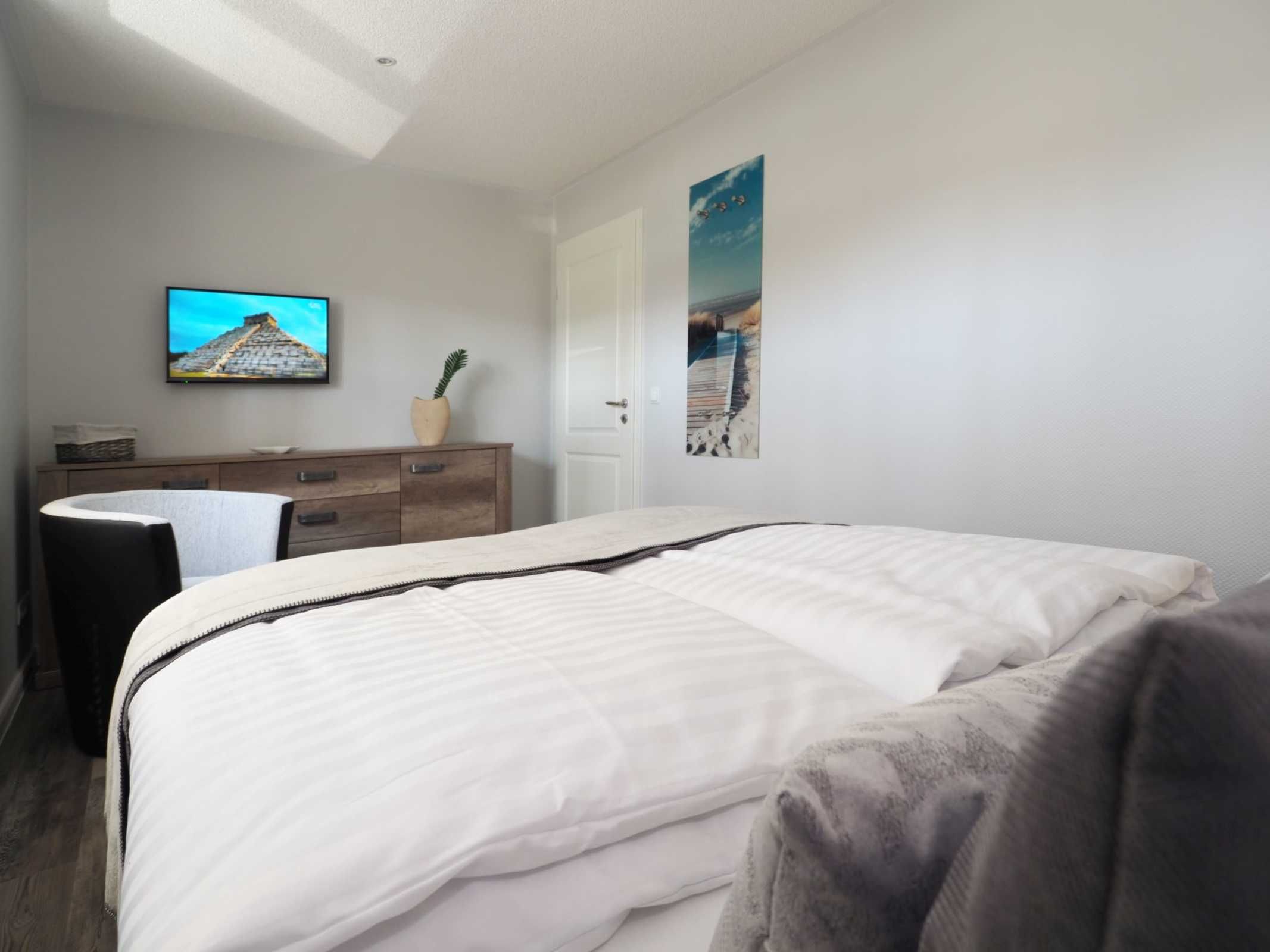 Im angrenzenden Schlafzimmer mit einem Doppelbett (180 x 200cm/getrennte Matratzen) können im Kleiderschrank Ihre persönlichen Dinge unterbringen. Auf der Schlafcouch im Wohnzimmer haben Sie besten Sitz- und Schlafkomfort für die 3. Person.